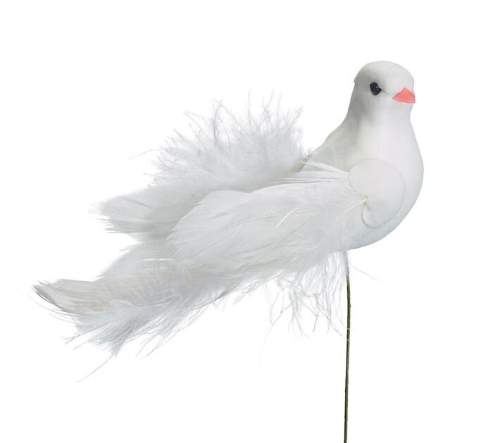***White Dove pick with long white feather tail with one white bead on tail feather on a wire pick. Made of foam and feathers