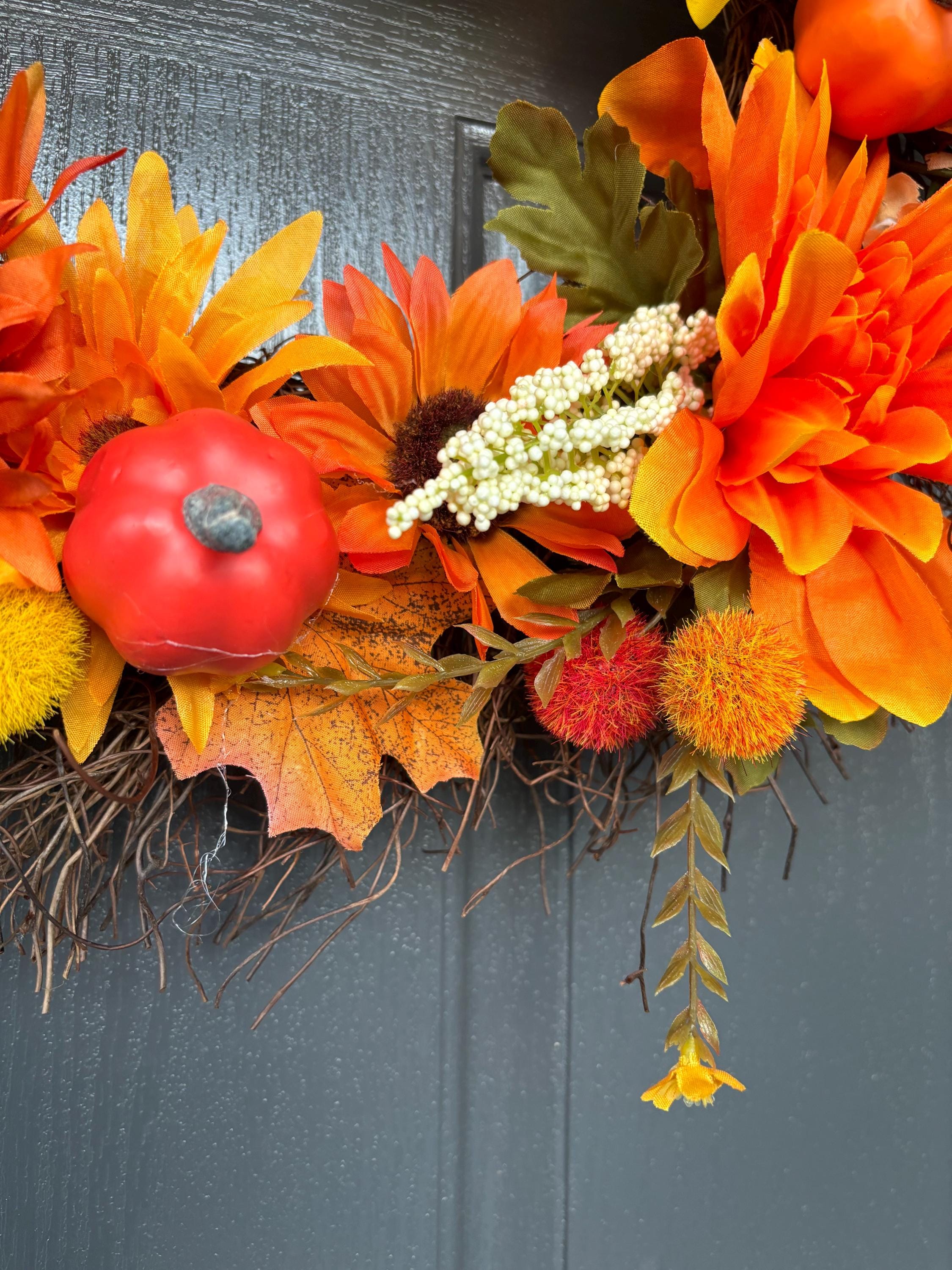 Welcome the cozy beauty of autumn into your home with this stunning Grapevine Wreath. Crafted on a grapevine base, it’s lavishly adorned with vibrant fall leaves in warm shades of cheerful yellow and orange florals that bring life and brightness to your space. Seasonal accents like charming pumpkin embellishments add a playful yet classic fall touch, making this wreath a perfect centerpiece for your door, mantel, or interior wall décor.