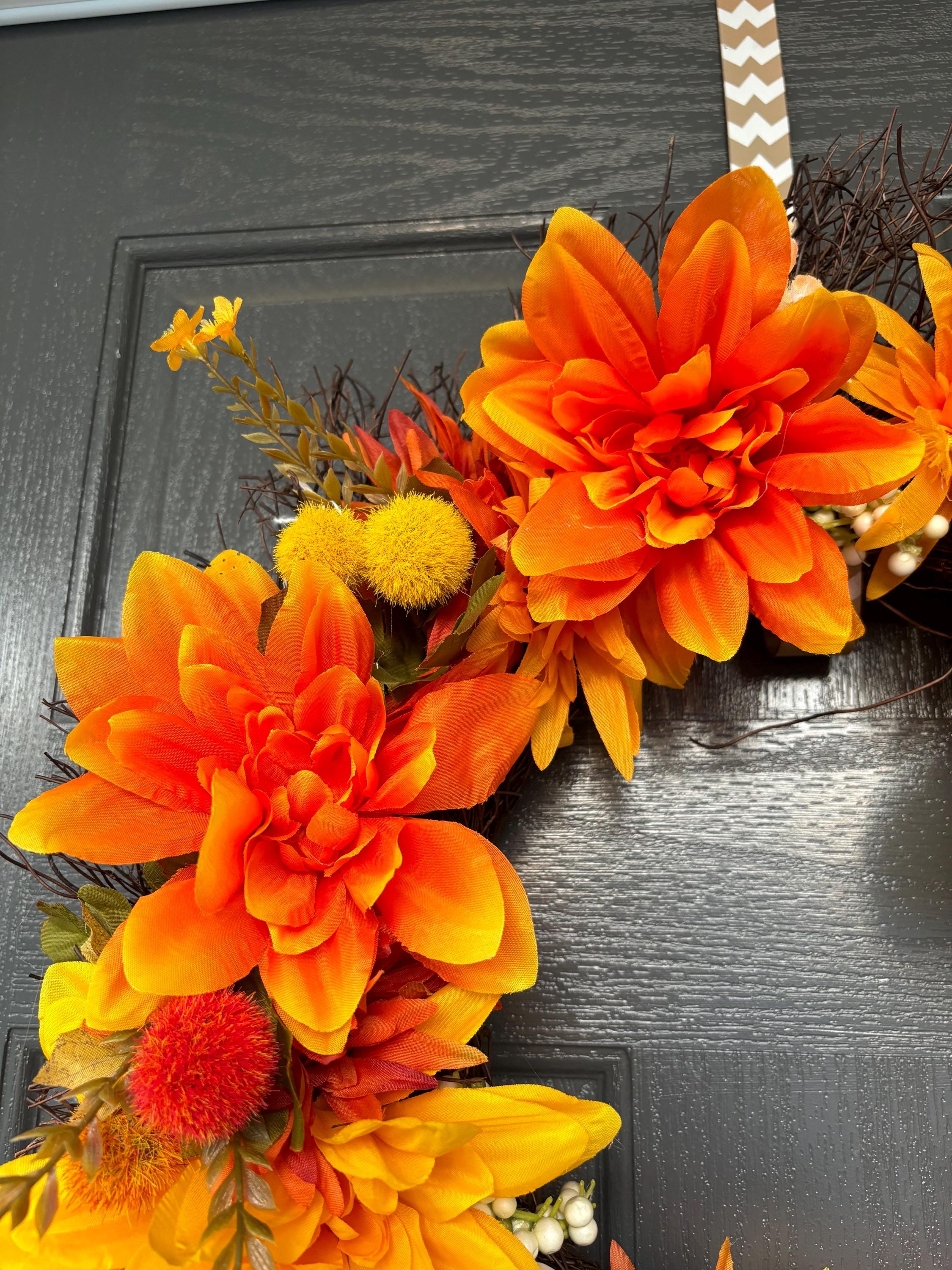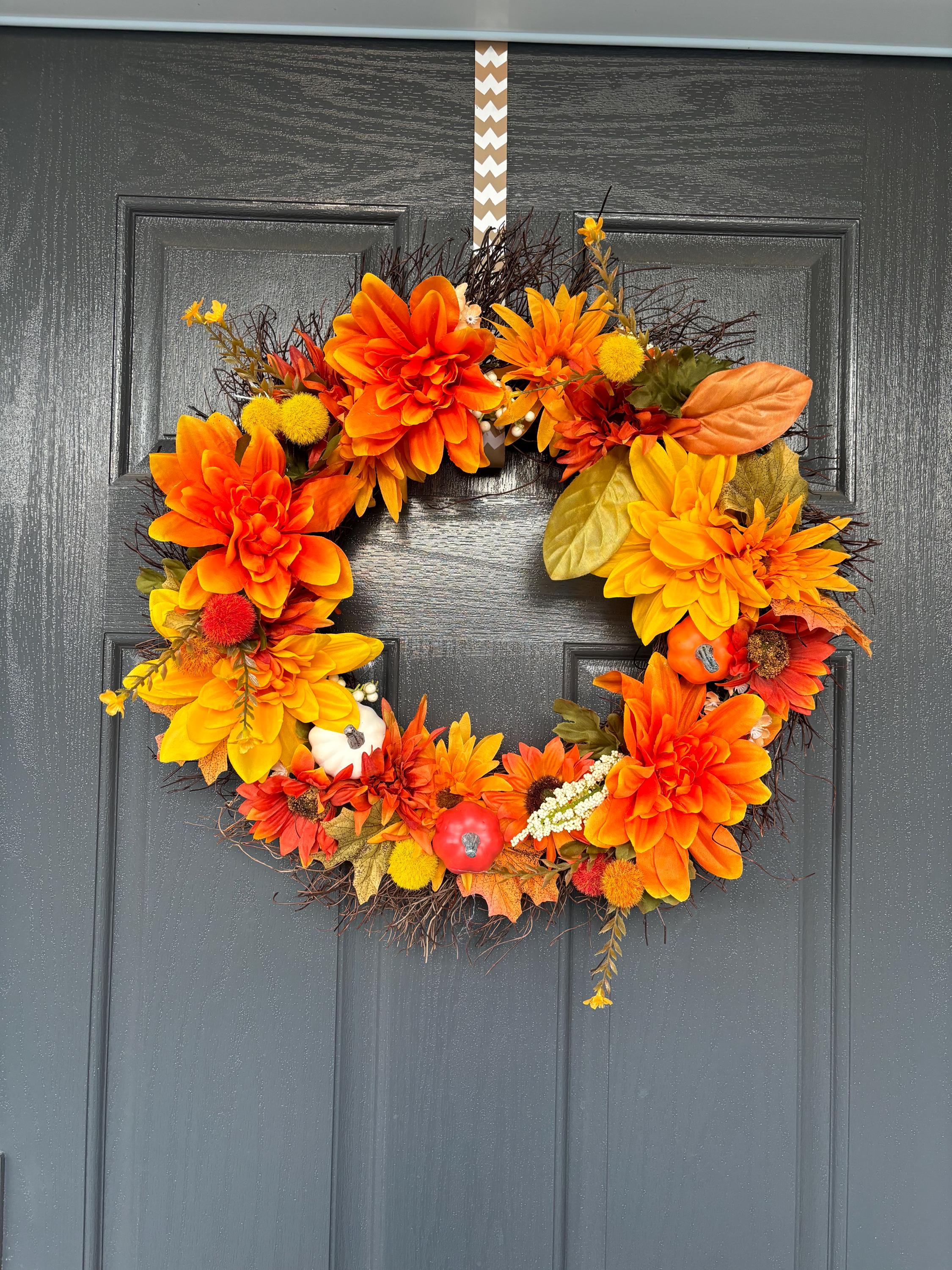 ***Grapevine wreath with fall leaves, Yellow and Orange assorted florals and pumpkin accents