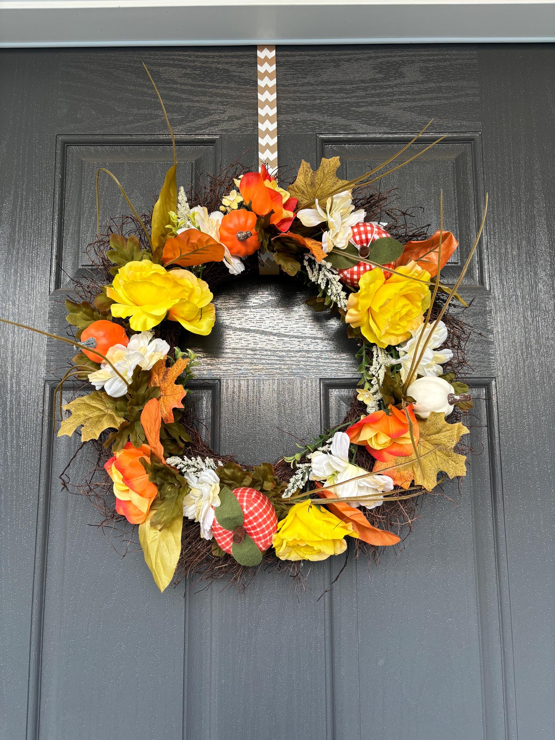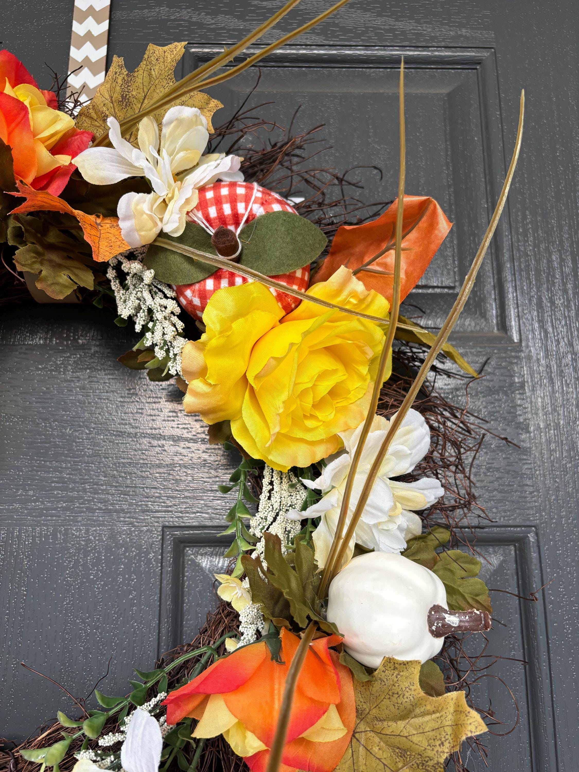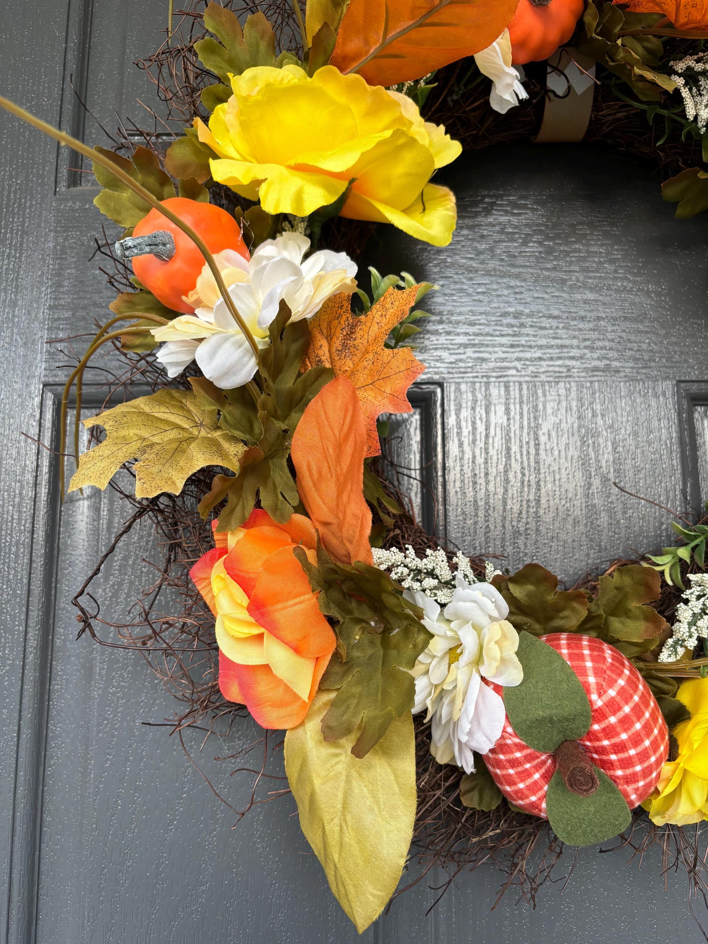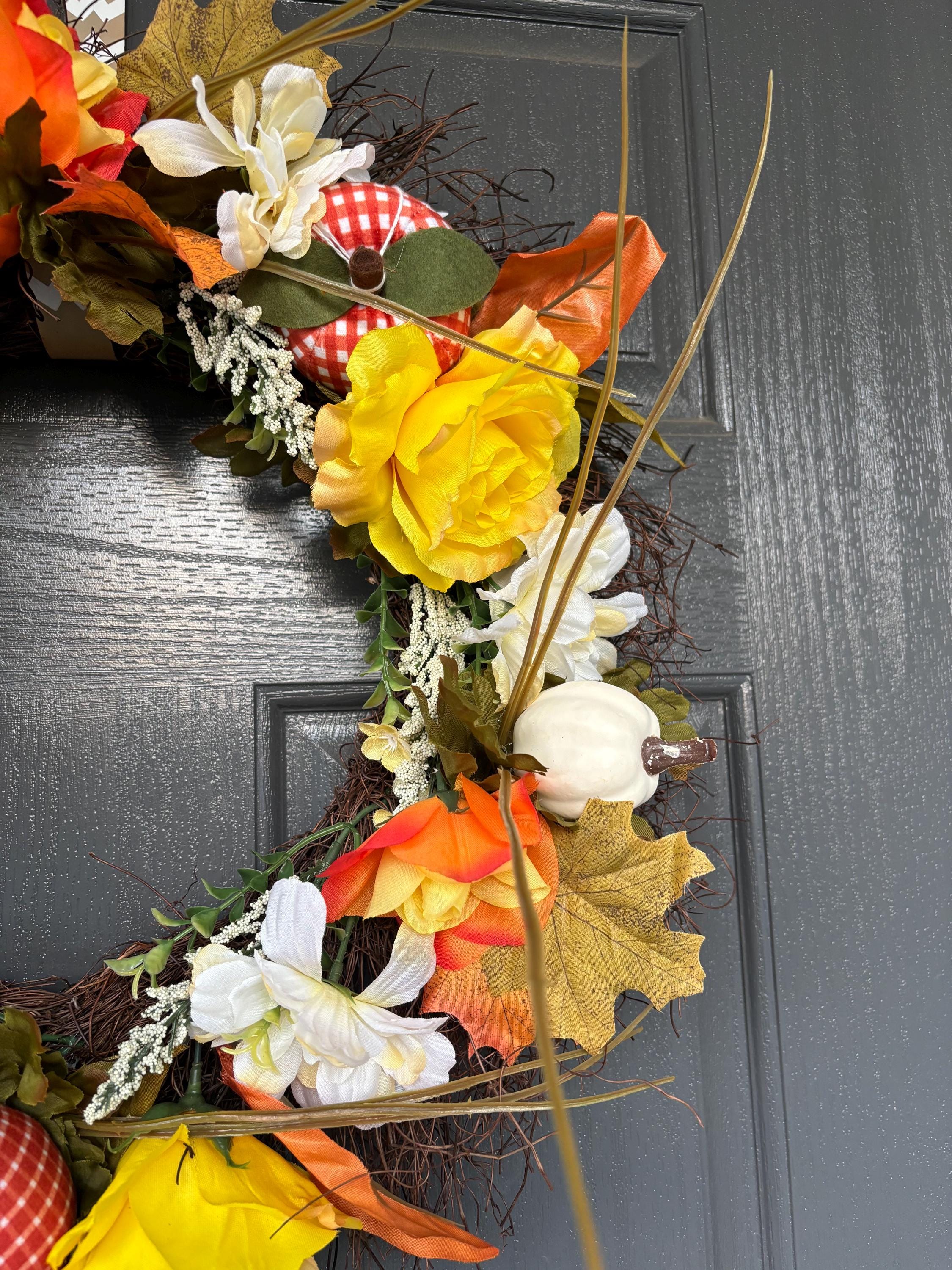 ***Grapevine wreath with fall leaves, Yellow and Orange assorted florals and Plaid and Orange pumpkin accents