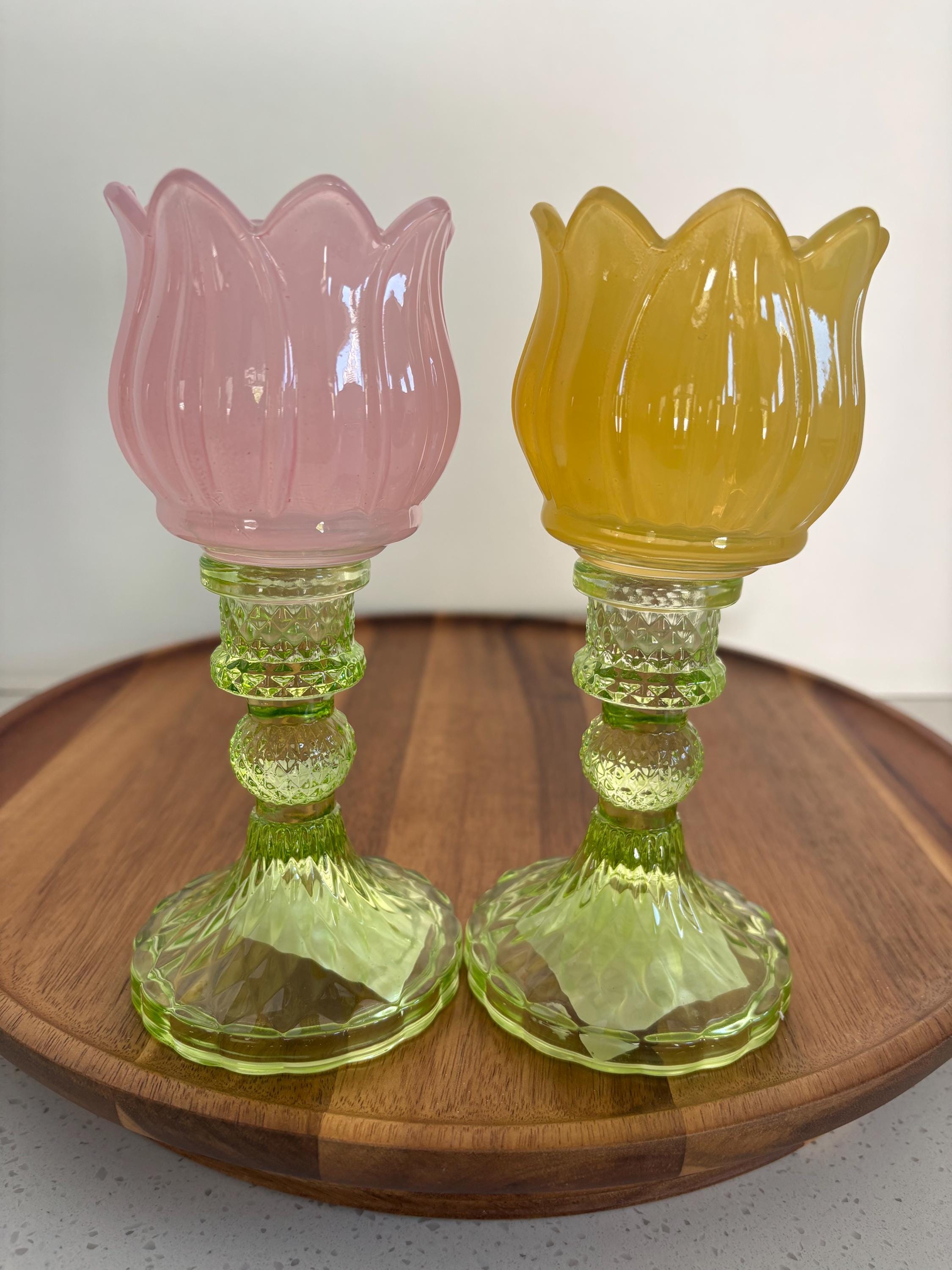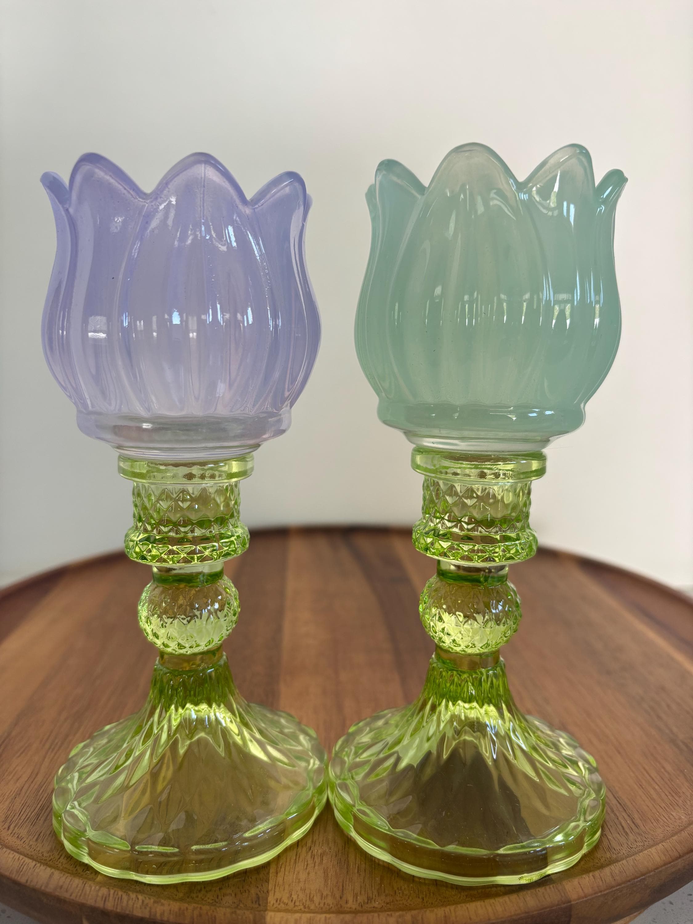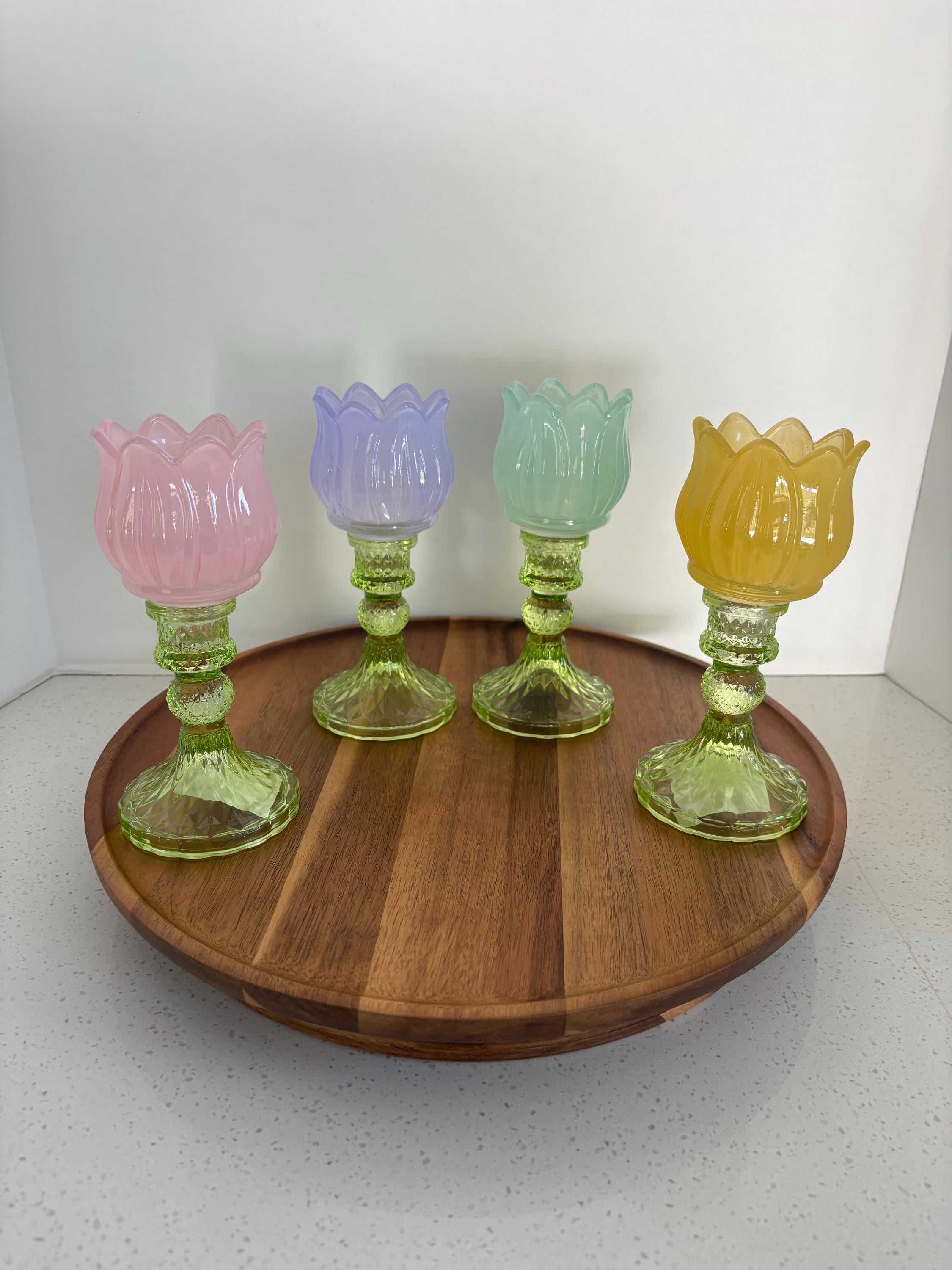 Illuminate your space with the delicate beauty of the Glass Tulip Tea Light Holders. Designed to evoke the graceful elegance of a blooming tulip, these enchanting tea light holders feature a sculpted glass design that captures light in the most mesmerizing way. Its soft, translucent hues and gently curved petals create a serene and calming ambiance, perfect for adding a touch of warmth and charm to any room.