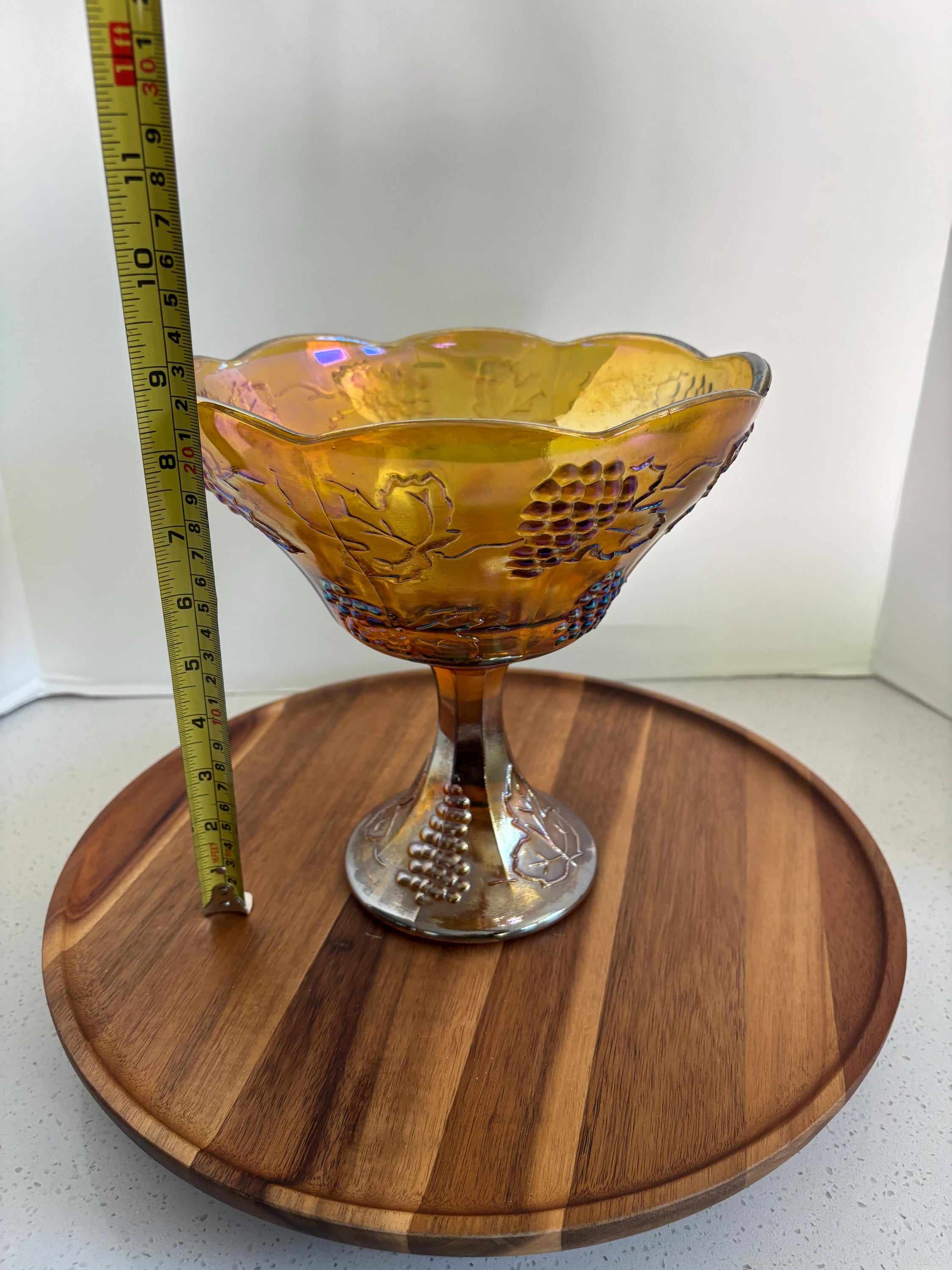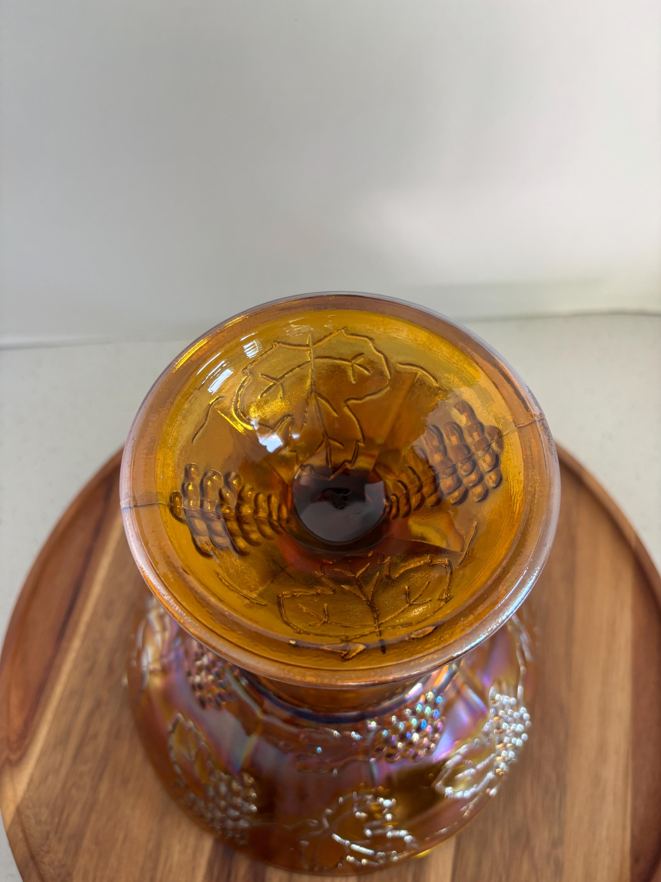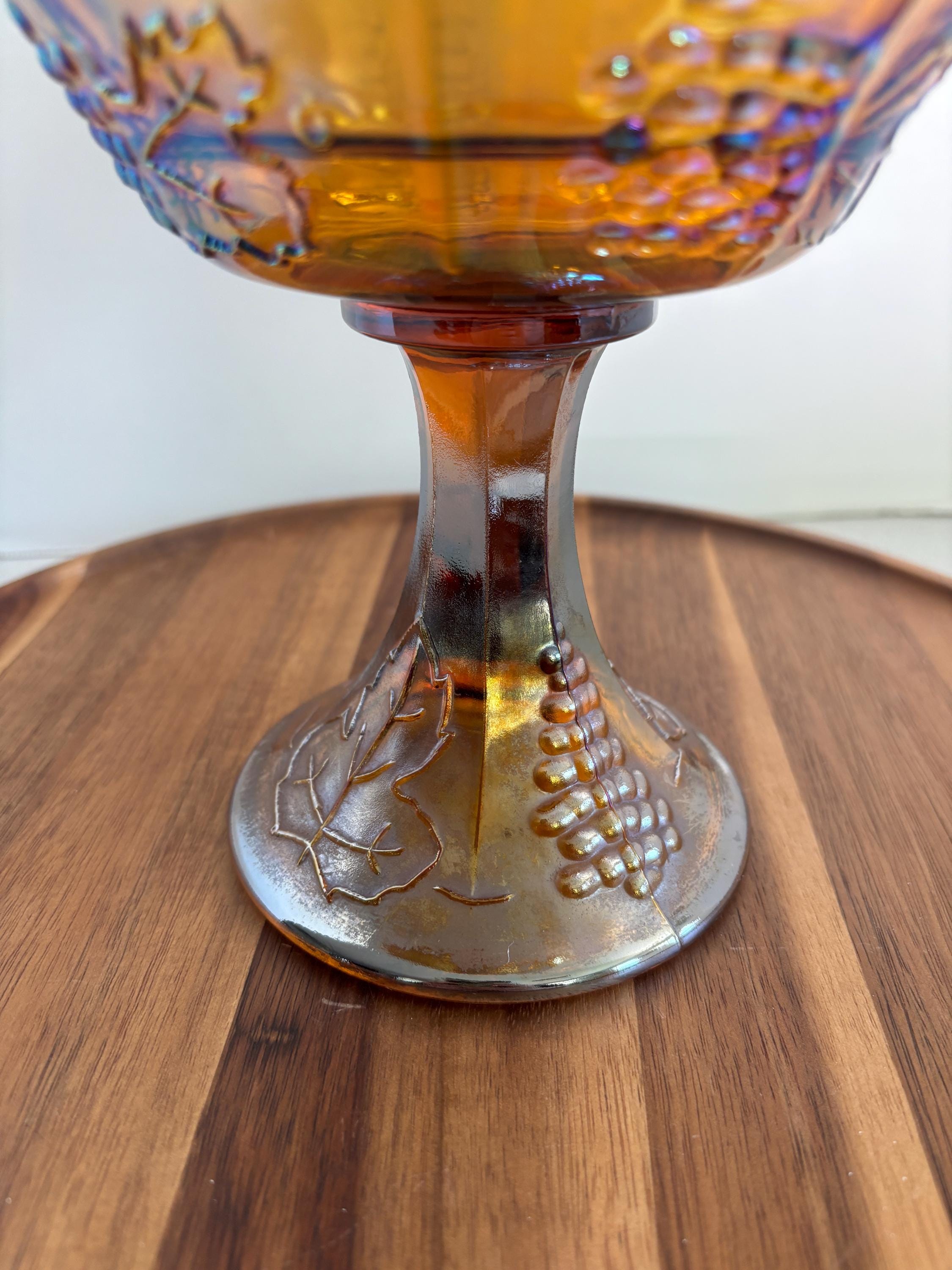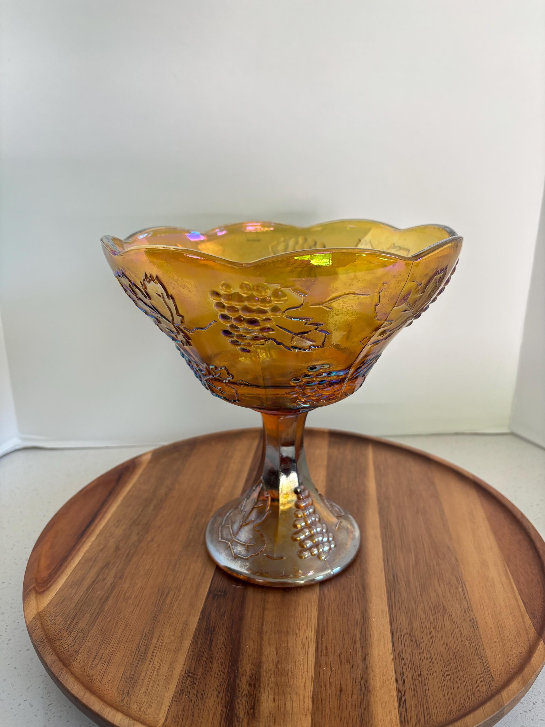 Infuse your home with the radiant glow of vintage elegance with this Indiana Glass Amber Carnival Pedestal Compote Bowl in the beloved Harvest Grape pattern. A striking example of early-to-mid 20th century pressed glass artistry, this piece features rich, iridescent marigold tones that shimmer with hues of gold, orange, and pink when caught in the light.