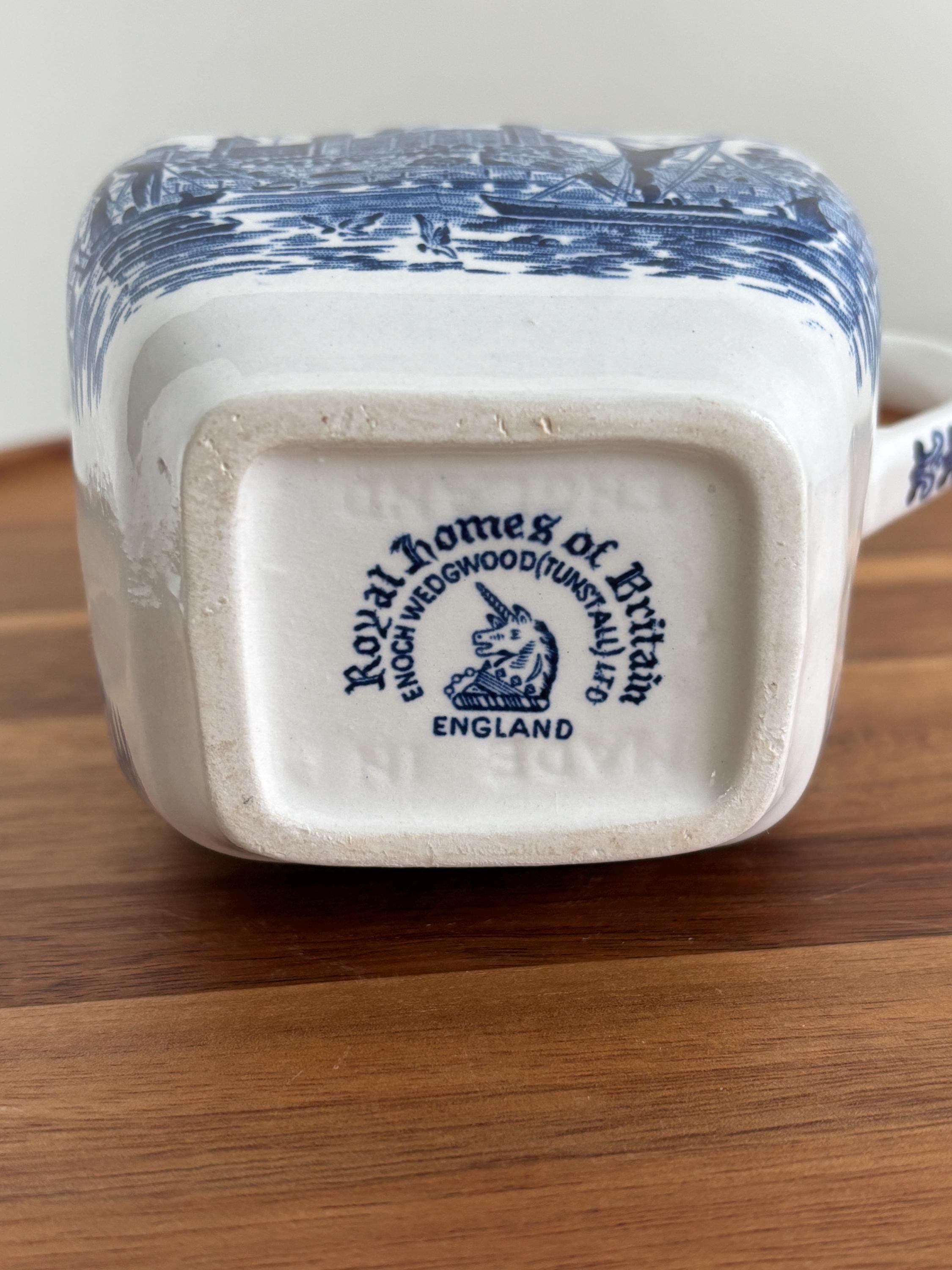 Step into British elegance with this Vintage Enoch Wedgwood Tunstall Creamer Pitcher, part of the beloved "Royal Homes of Britain" series. Made in England, this charming blue and white ceramic pitcher features a beautifully detailed transferware design showcasing iconic British architecture, celebrating the timeless beauty of royal residences.