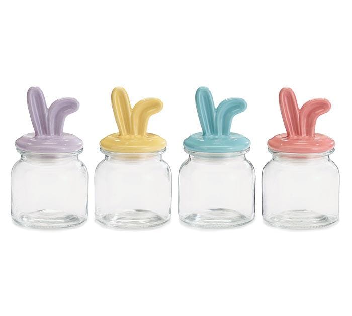 Add a whimsical touch to your springtime celebrations with this adorable Bunny Ears Lid on Glass Jar Candy Dish. Featuring a charming glass jar topped with a playful bunny ears lid, this dish is perfect for holding candies, chocolates, or small treats. The sweet, delicate design brings a fun, festive vibe to any Easter or spring-themed gathering, while the clear glass allows the colorful contents to shine through. Whether used as a decorative piece for tiered trays or for serving snacks, this candy dish is sure to delight guests and add a touch of seasonal cheer to your home!