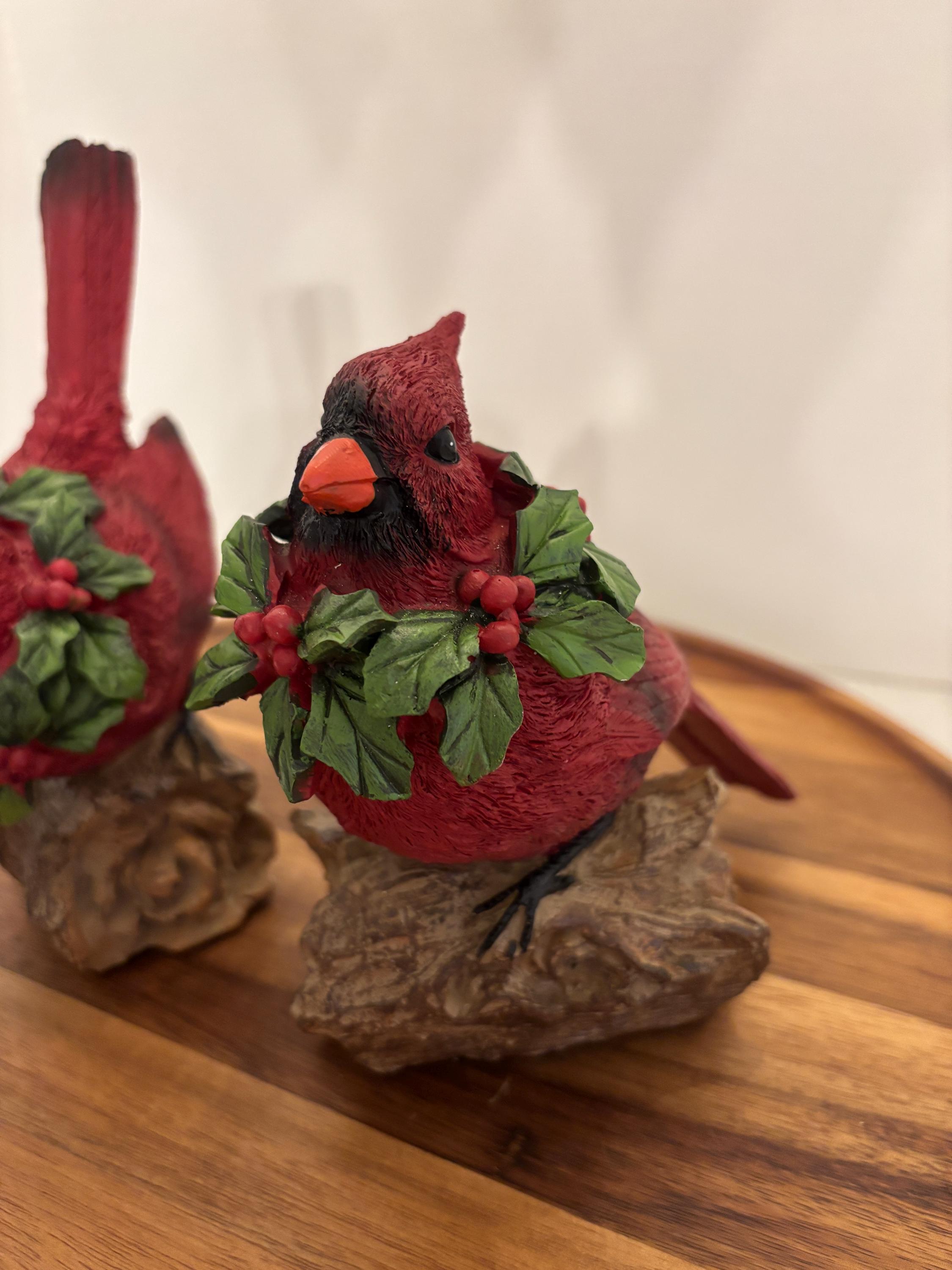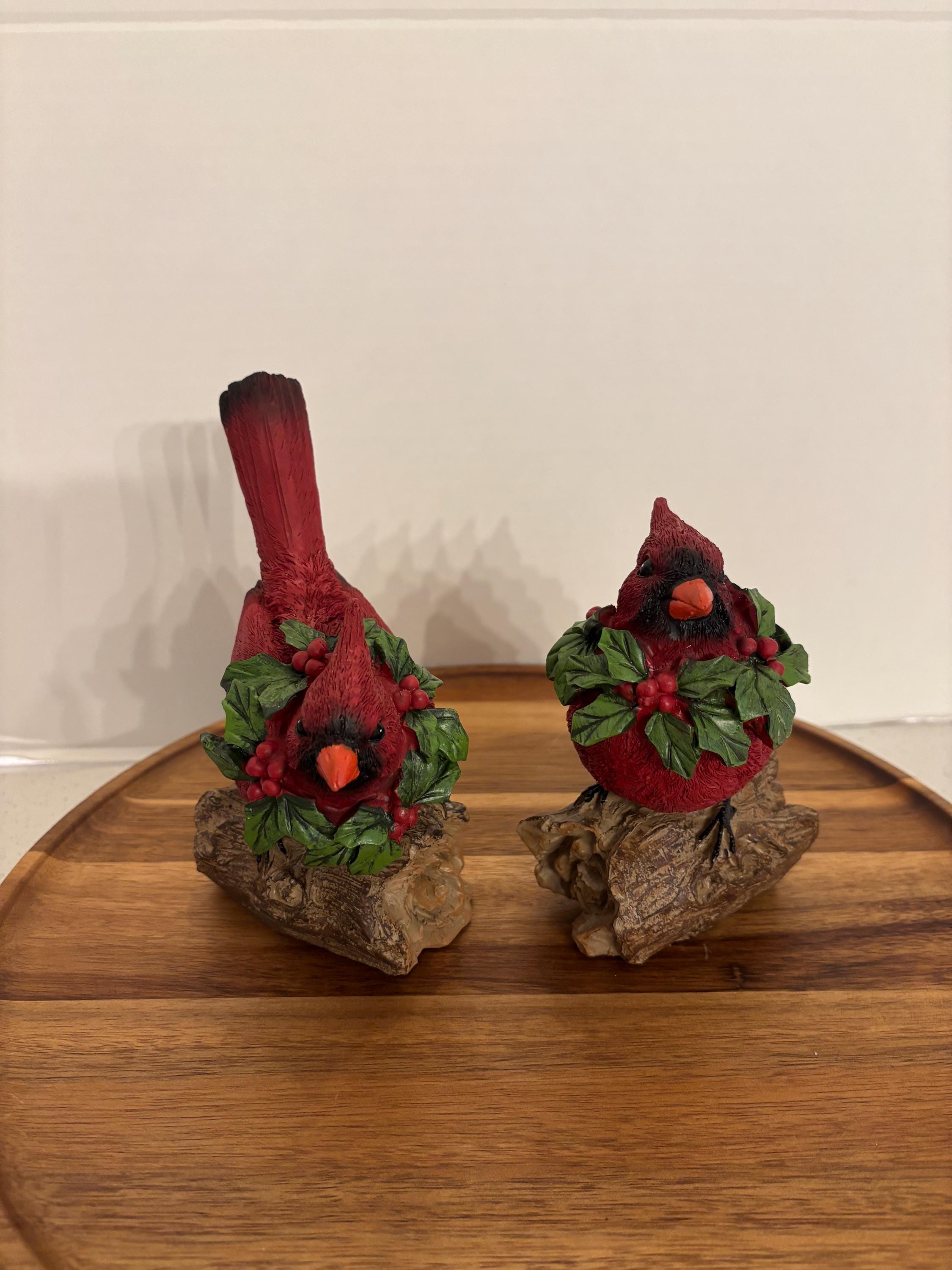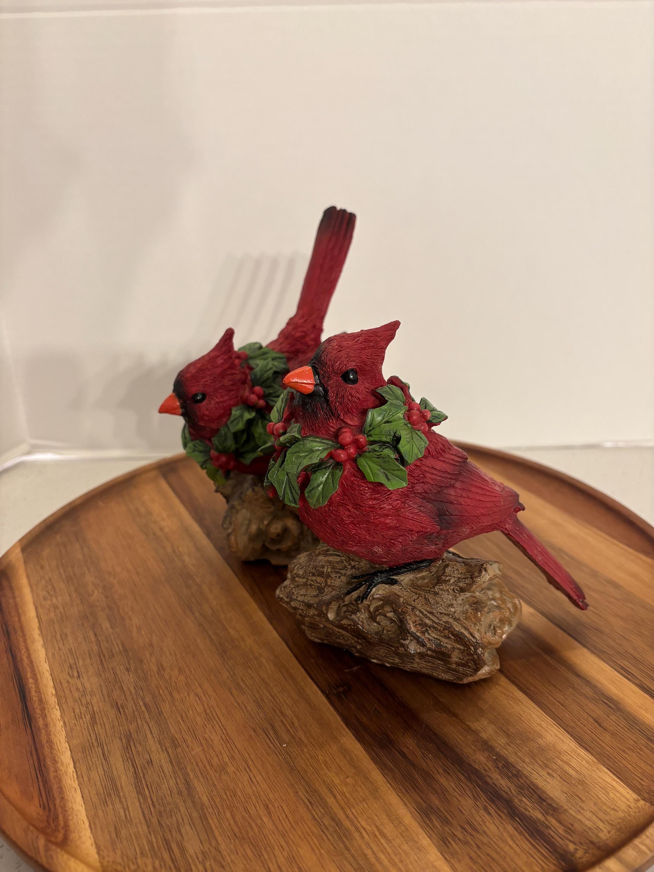 Celebrate the beauty of winter and the spirit of the season with this charming red cardinal figurine set, featuring two vibrant cardinals perched on a rustic, wood-look log base. Each bird wears a festive green holly and red berry wreath around its neck, adding a joyful, holiday-inspired touch.