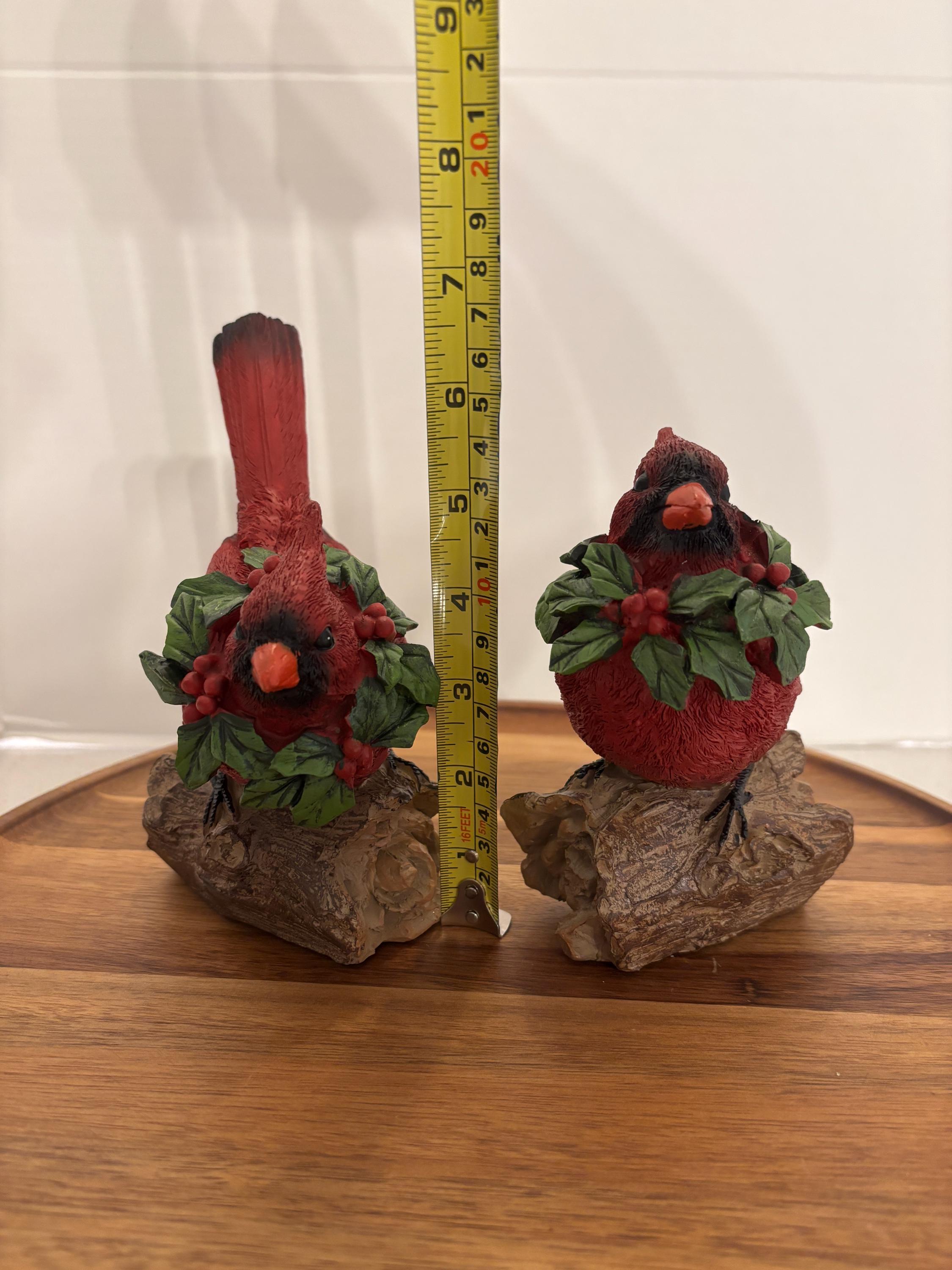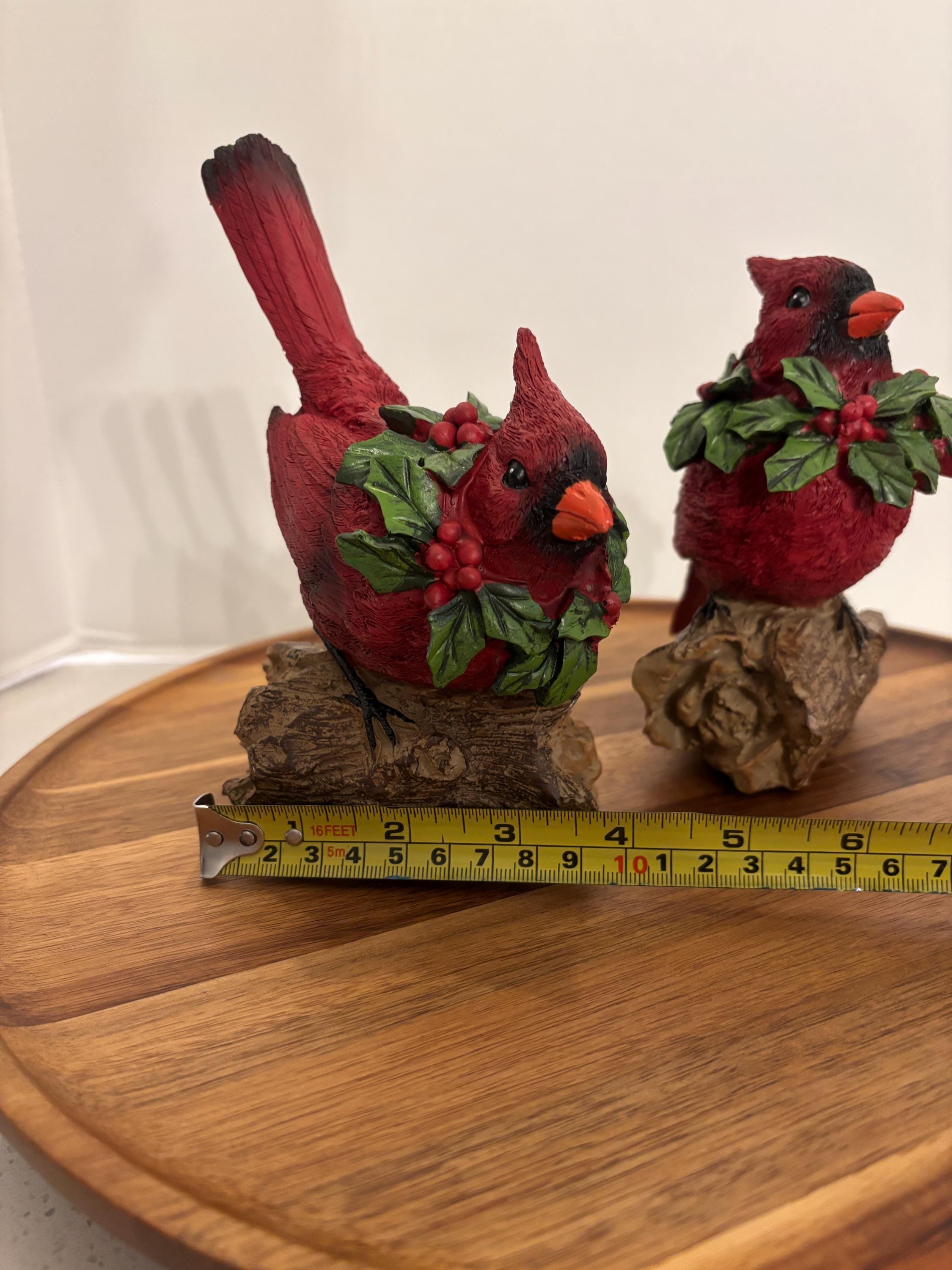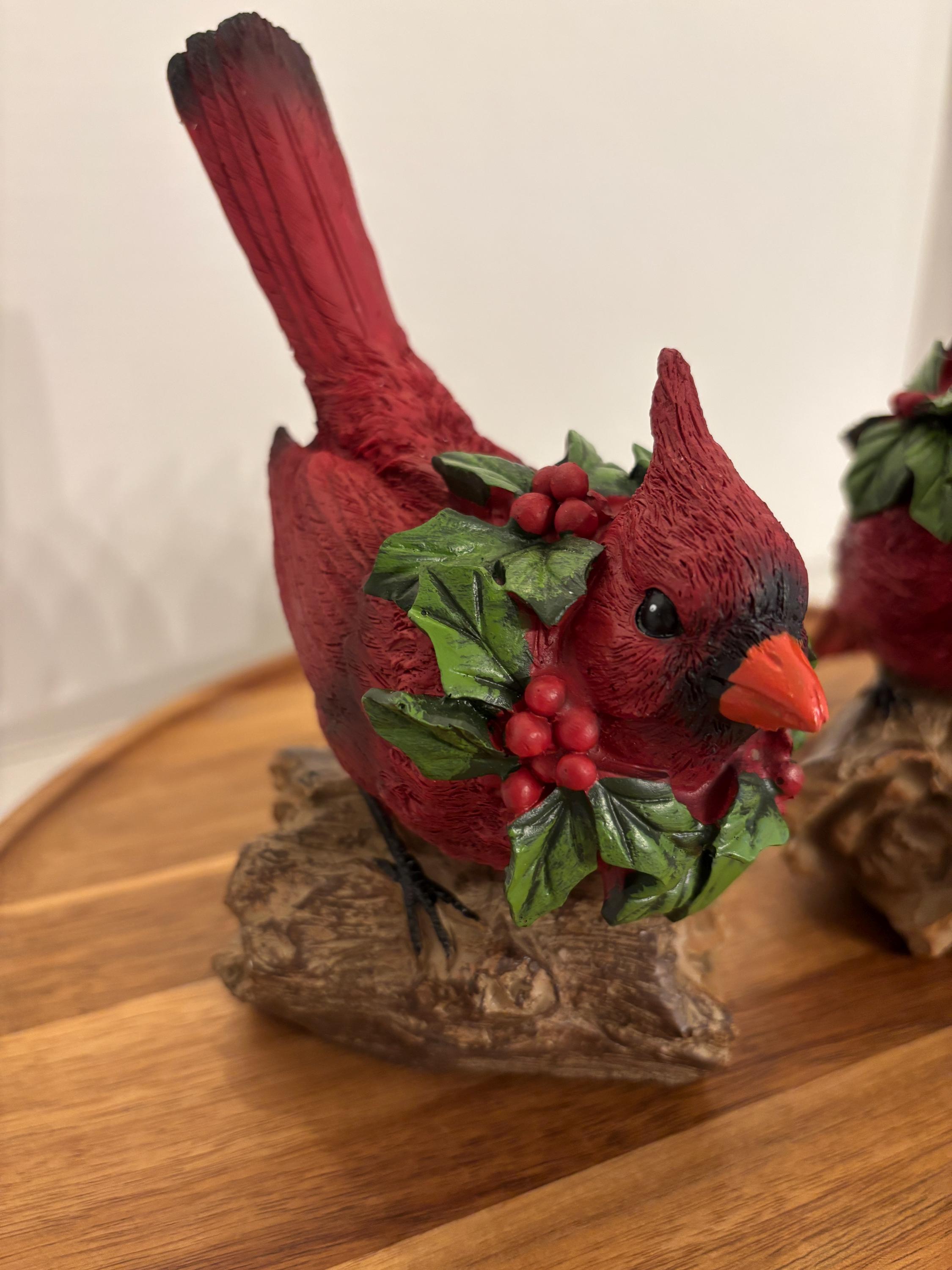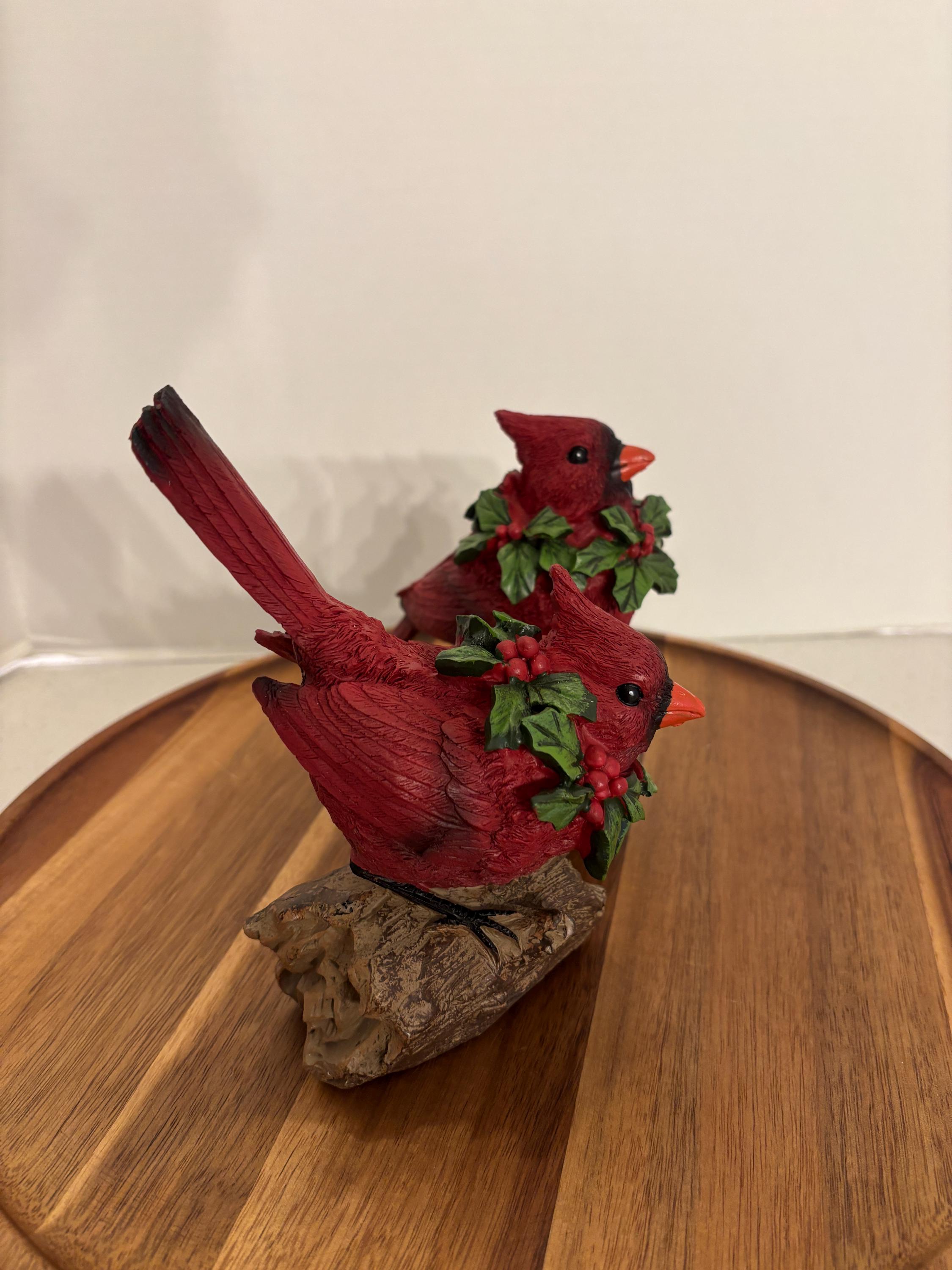 Celebrate the beauty of winter and the spirit of the season with this charming red cardinal figurine set, featuring two vibrant cardinals perched on a rustic, wood-look log base. Each bird wears a festive green holly and red berry wreath around its neck, adding a joyful, holiday-inspired touch.