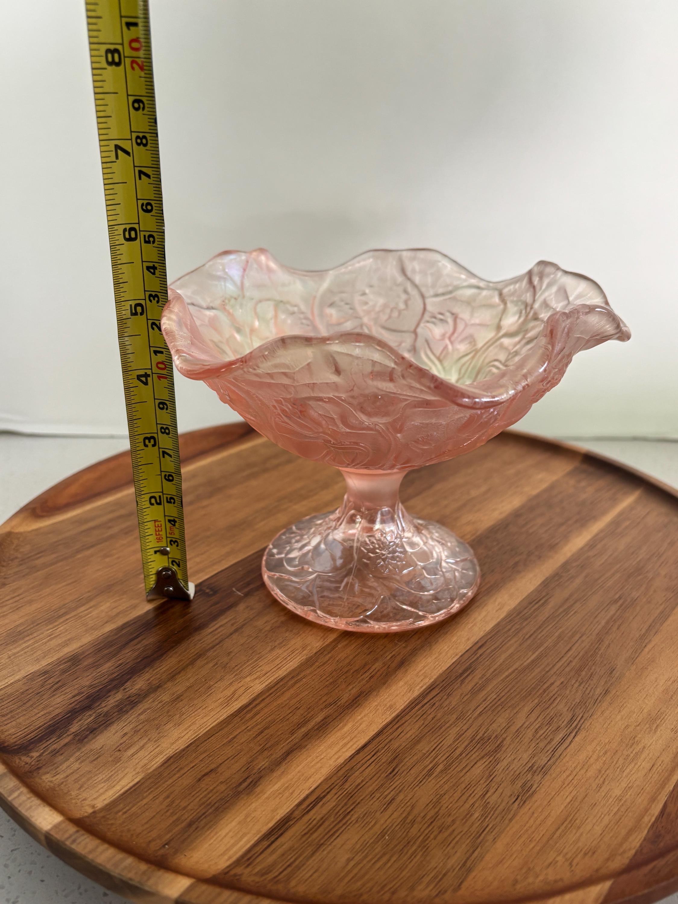 Delicate, romantic, and unmistakably elegant, this Vintage Fenton Pink Opalescent Water Lily Pedestal Compote Bowl is a stunning example of American art glass at its finest. Made by the renowned Fenton Art Glass Company, this exquisite piece features a soft pink hue—highlighting the intricate detailing of the water lily pattern.
