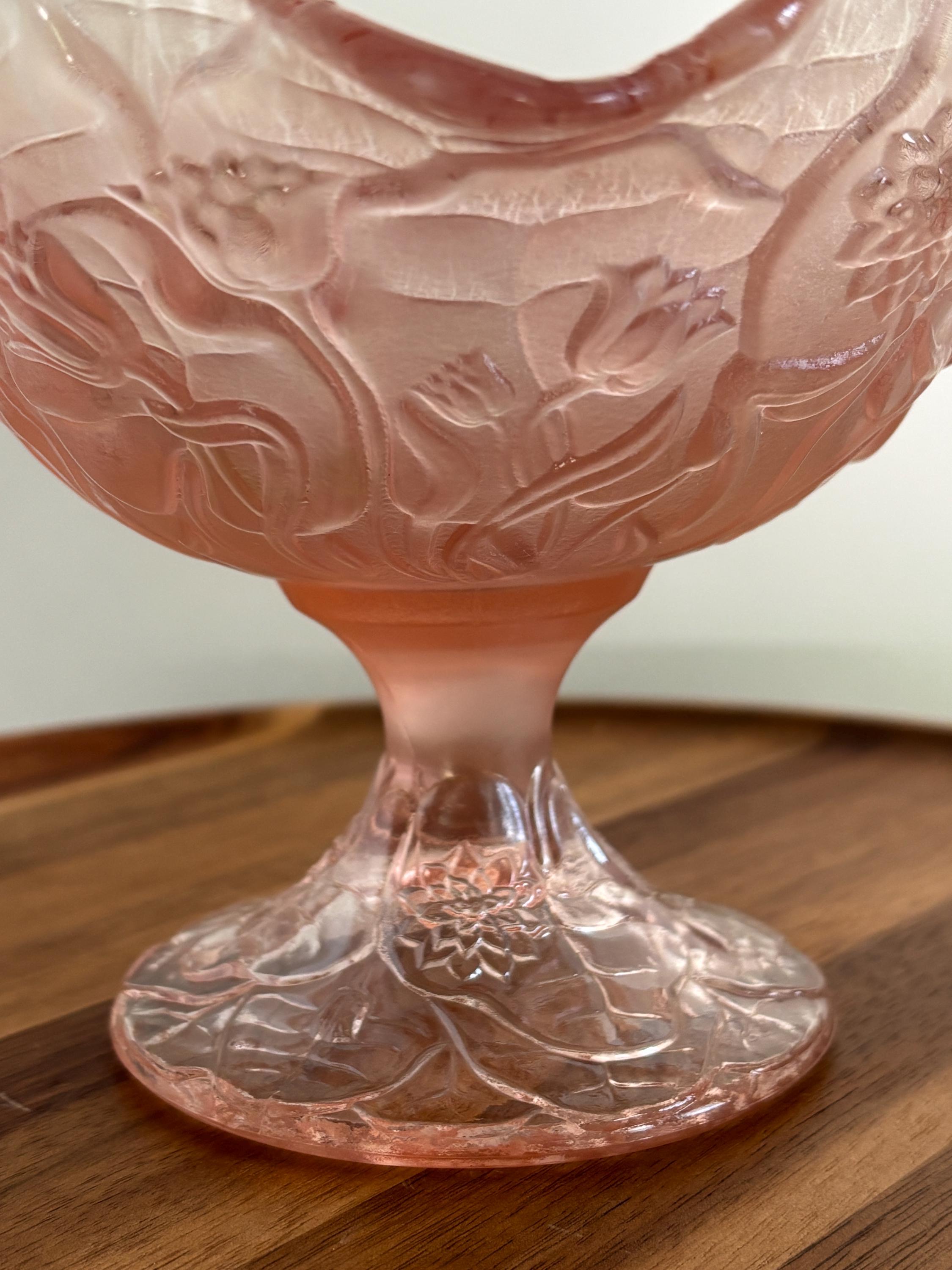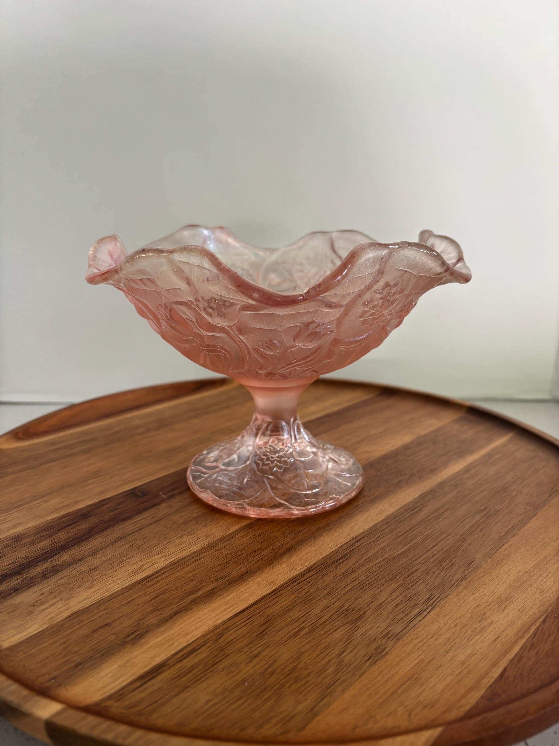 The bowl is elevated on a refined pedestal base, creating a graceful silhouette that adds height and presence to any display. Ruffled edges and embossed floral motifs give this compote an ethereal, almost translucent quality that glows when it catches the light.
