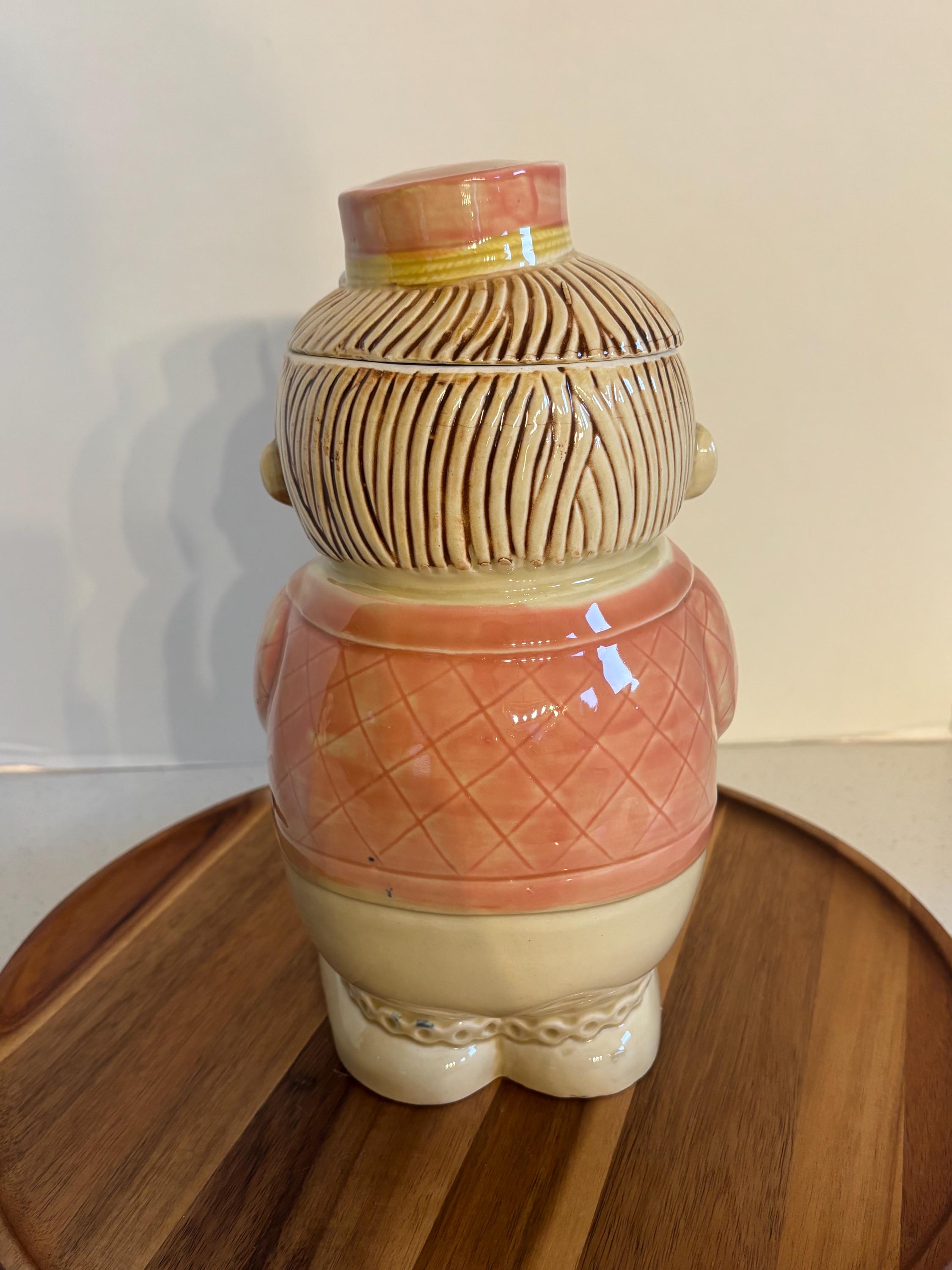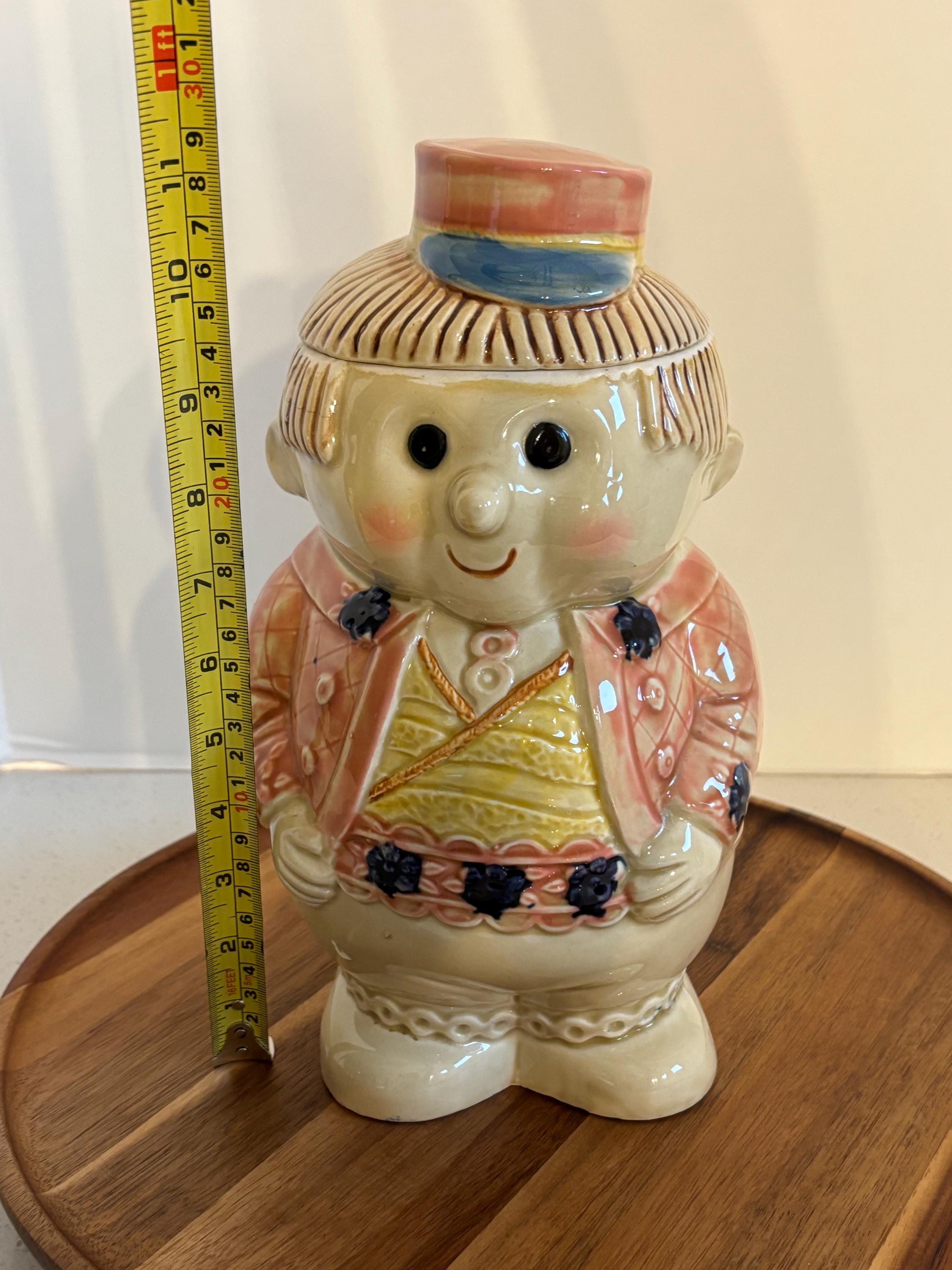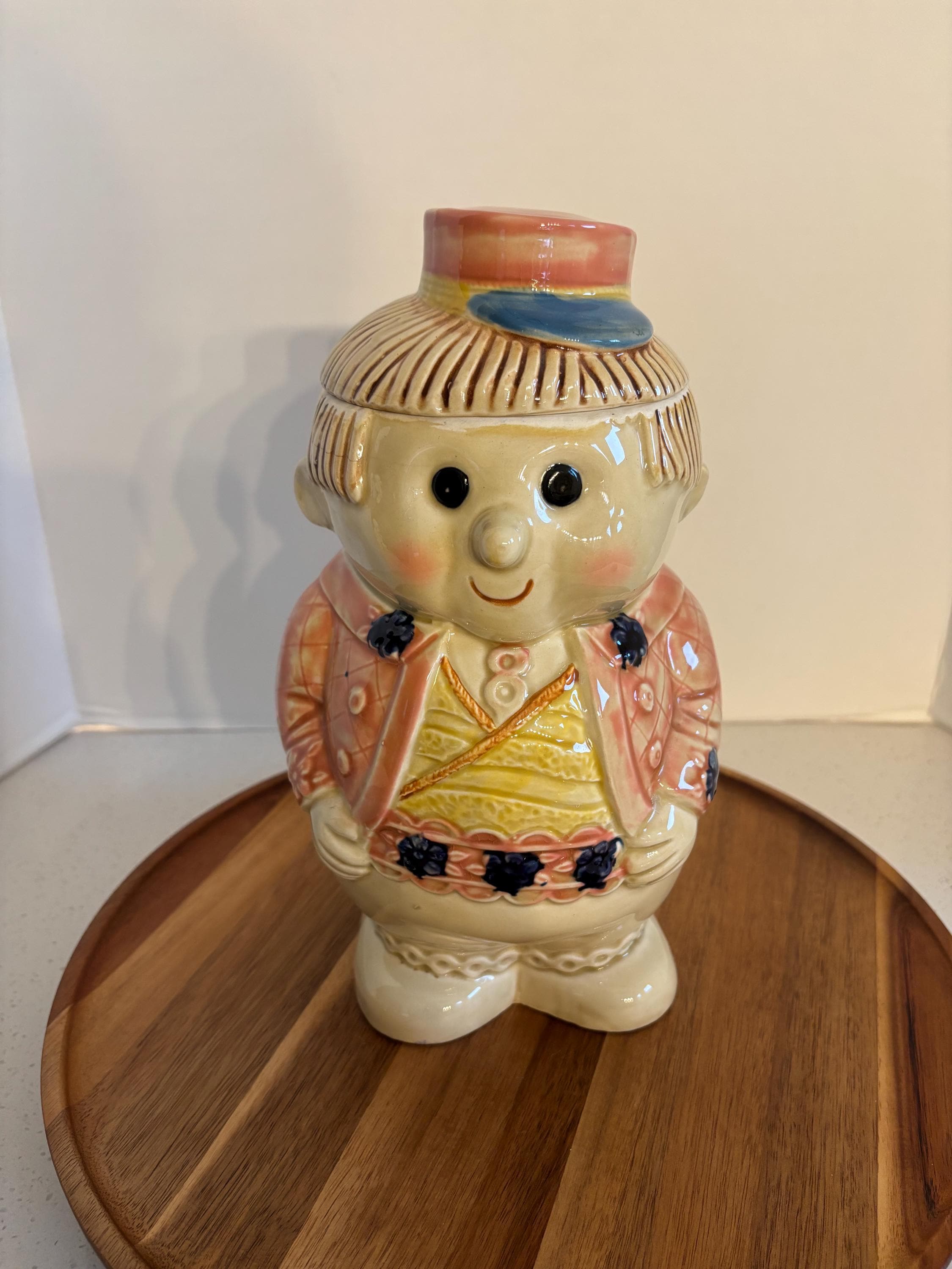 Shaped like a cheerful train conductor, this cookie jar is full of personality, featuring bright hand-painted details, a friendly face, and classic 1970s charm. The removable hat serves as the lid, offering easy access to your favorite cookies or treats while doubling as a nostalgic display piece for your counter, shelf, or vintage kitchen collection.