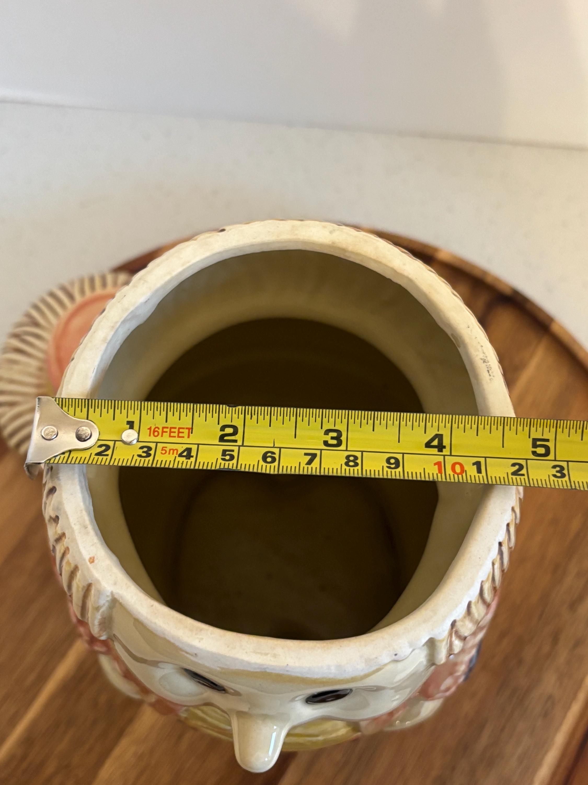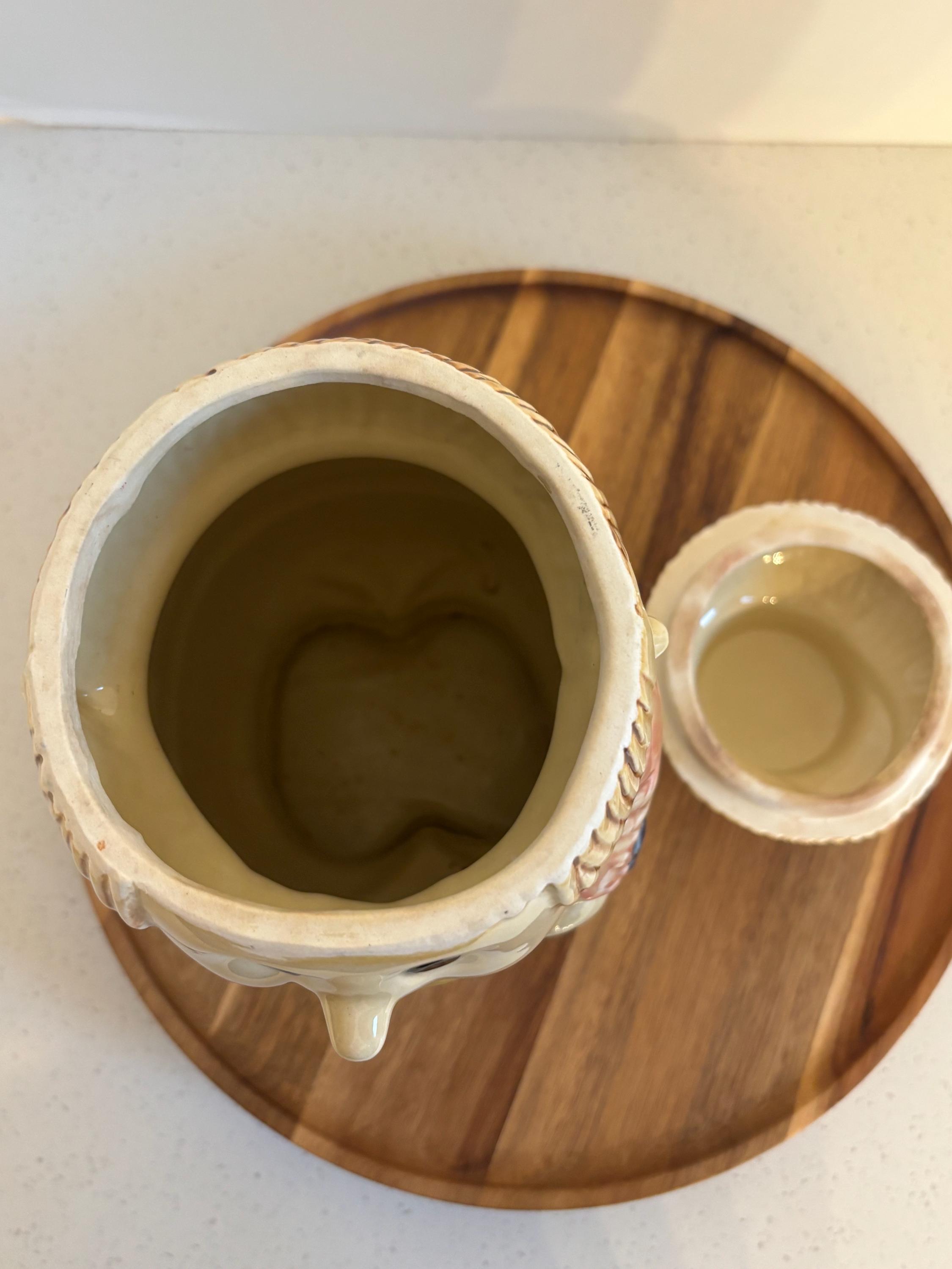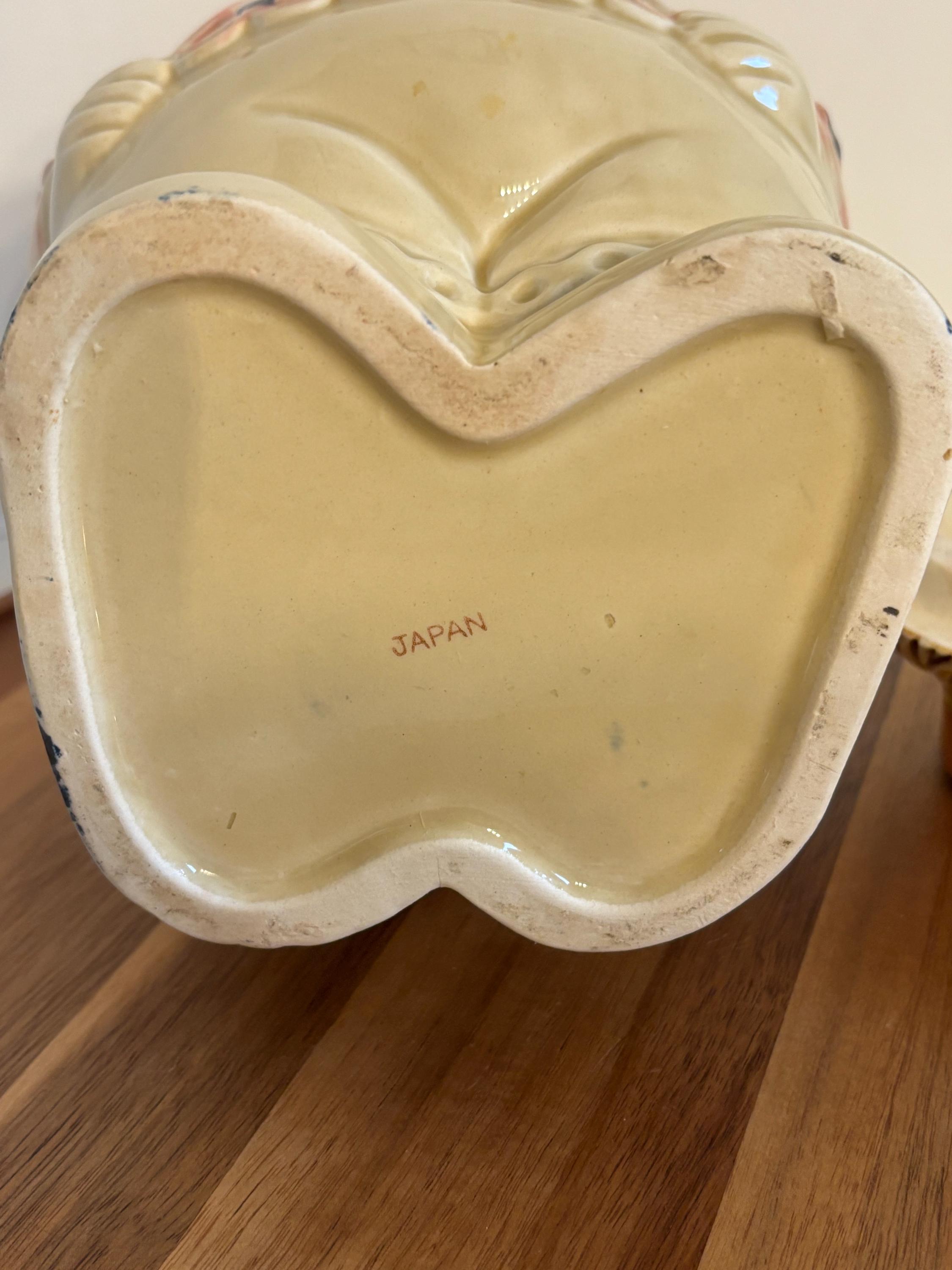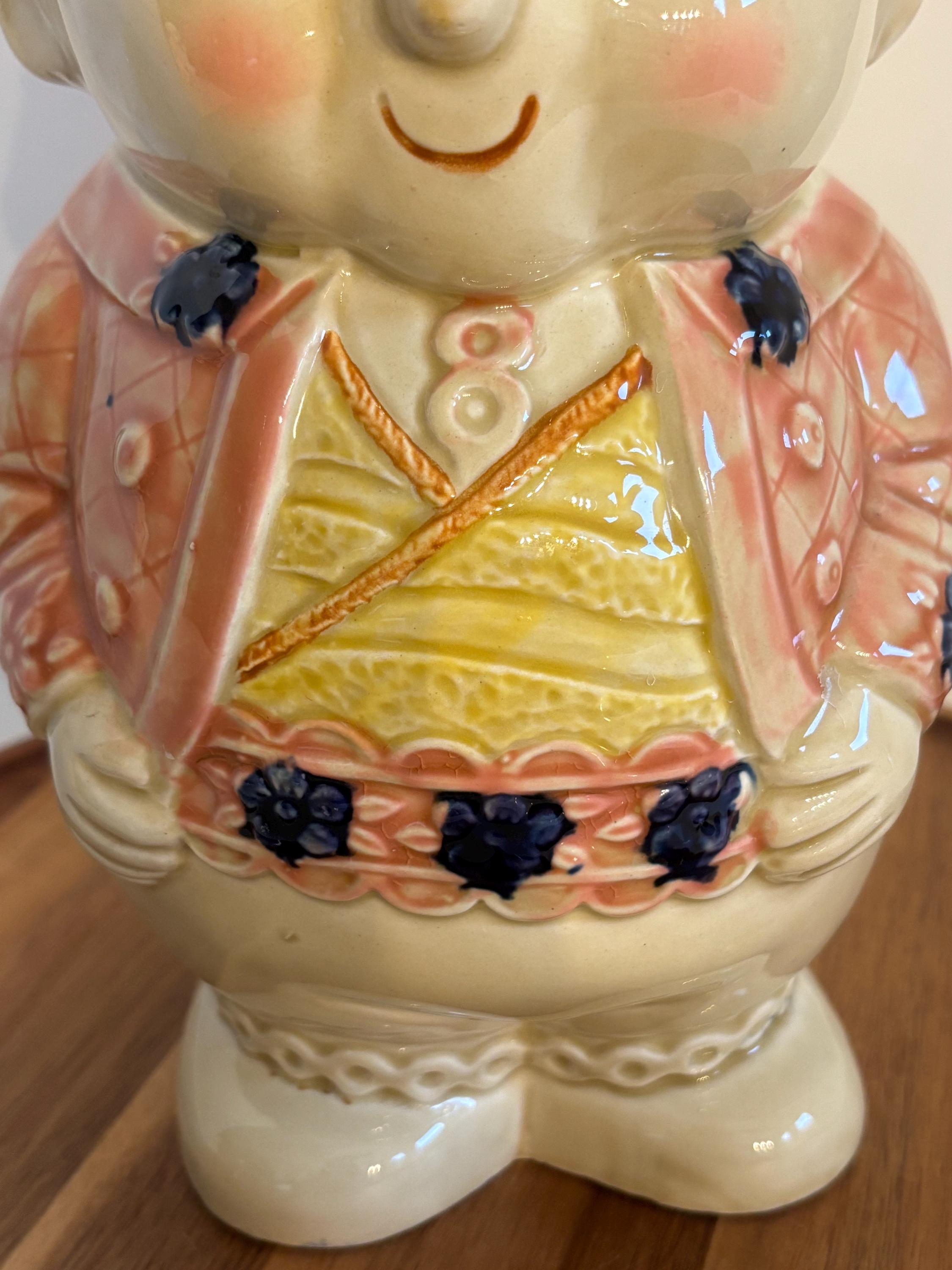 Shaped like a cheerful train conductor, this cookie jar is full of personality, featuring bright hand-painted details, a friendly face, and classic 1970s charm. The removable hat serves as the lid, offering easy access to your favorite cookies or treats while doubling as a nostalgic display piece for your counter, shelf, or vintage kitchen collection.