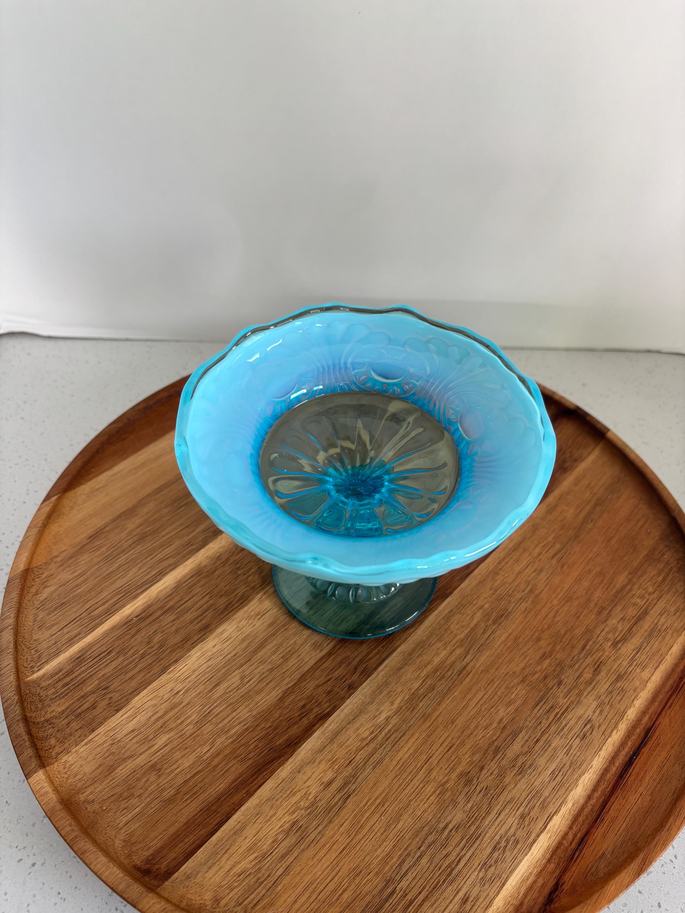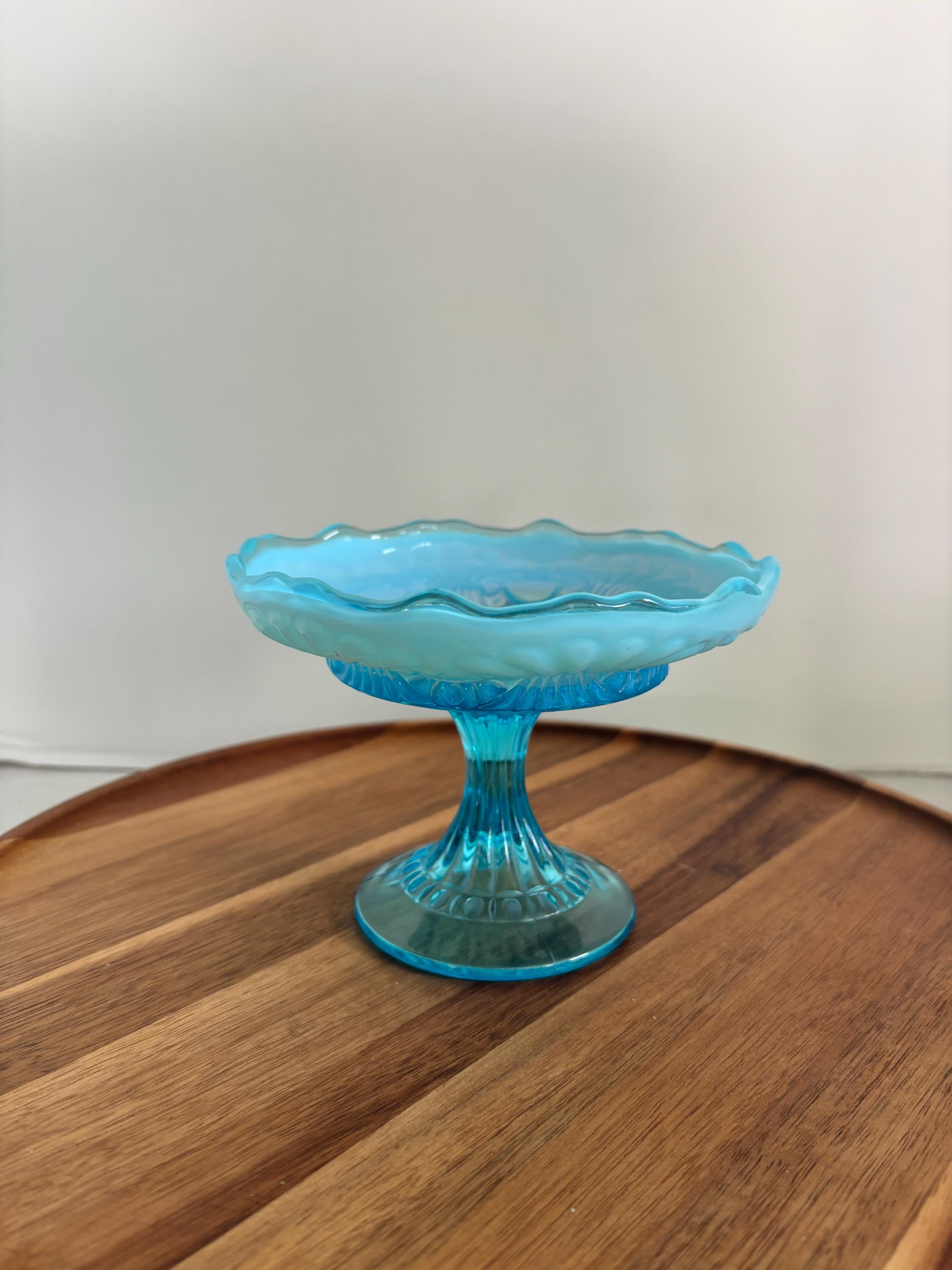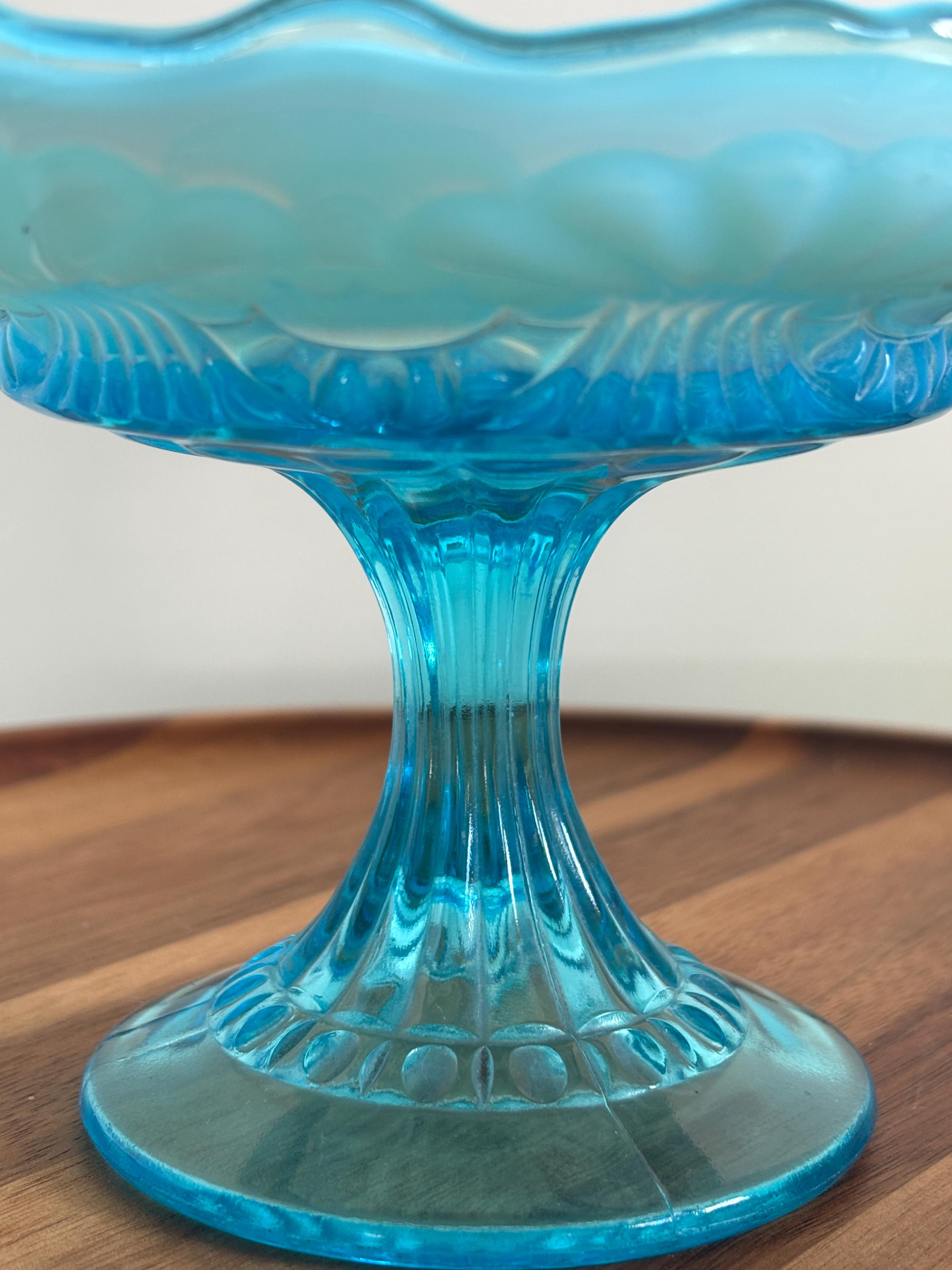 Add a touch of vintage elegance to your home with this stunning Fenton Blue Opalescent Compote Bowl in the rare and eye-catching Tokyo pattern. With its soft blue hue, milky opalescent rim, and detailed geometric design, this piece is a perfect blend of charm and craftsmanship.