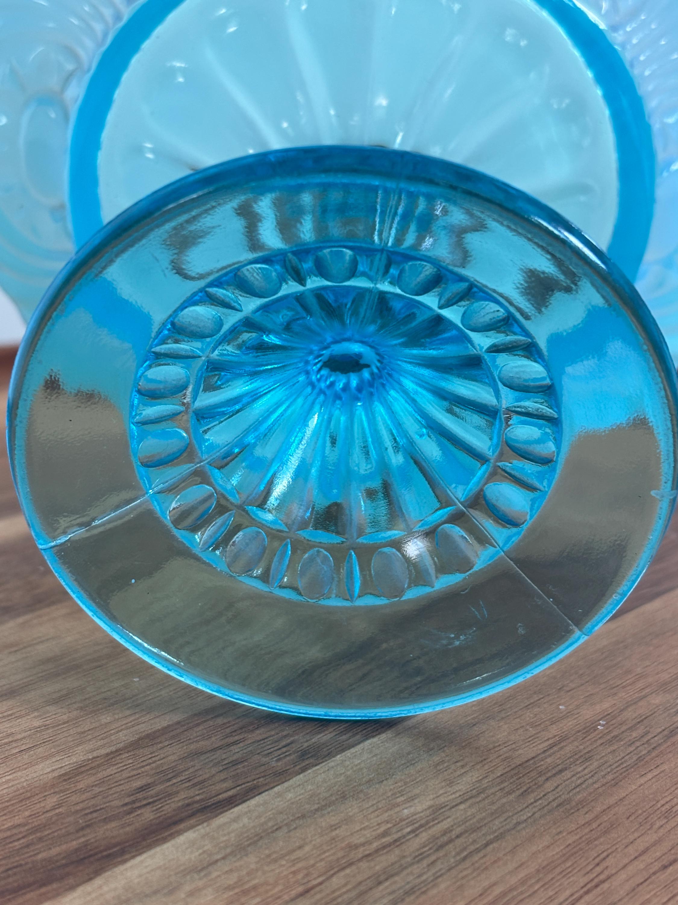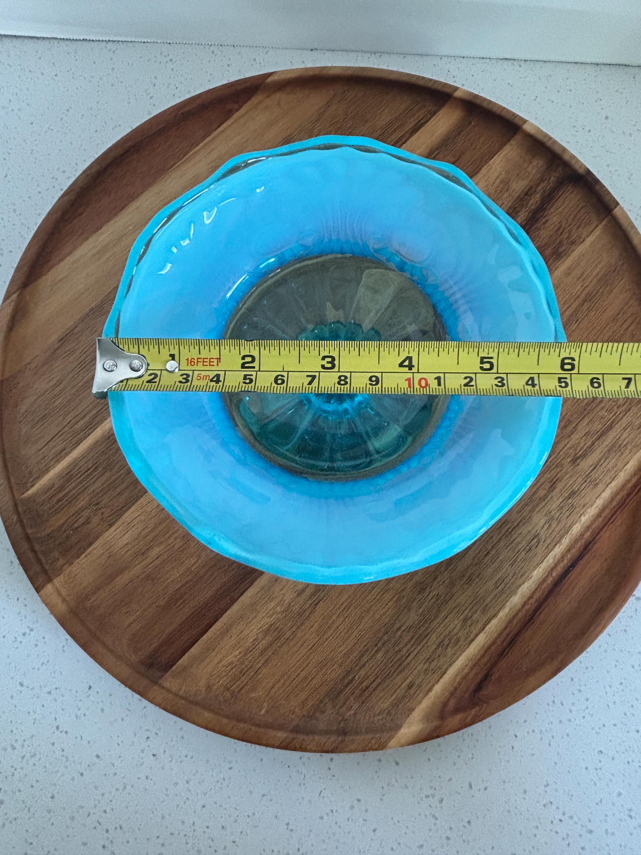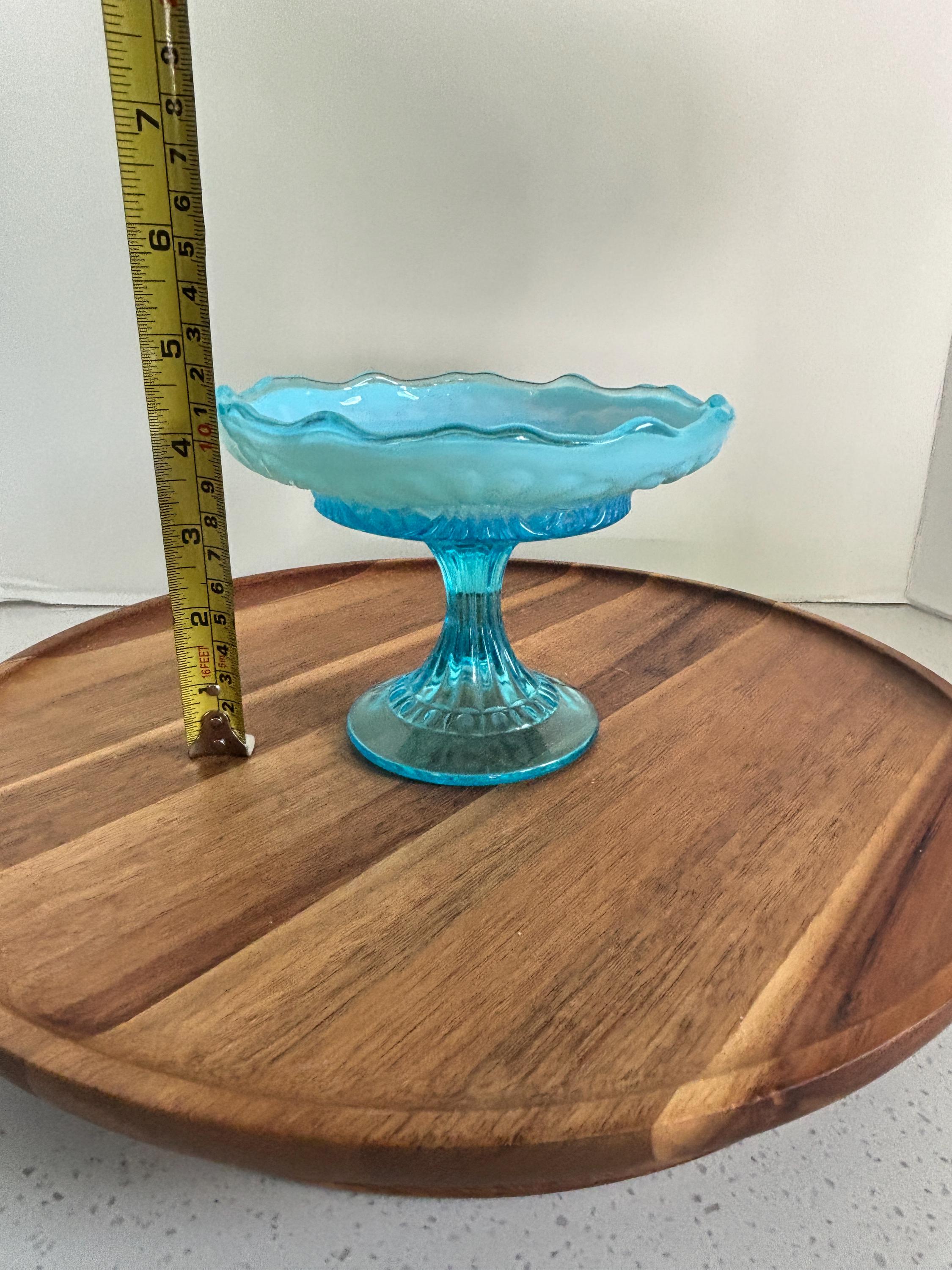 Add a touch of vintage elegance to your home with this stunning Fenton Blue Opalescent Compote Bowl in the rare and eye-catching Tokyo pattern. With its soft blue hue, milky opalescent rim, and detailed geometric design, this piece is a perfect blend of charm and craftsmanship.