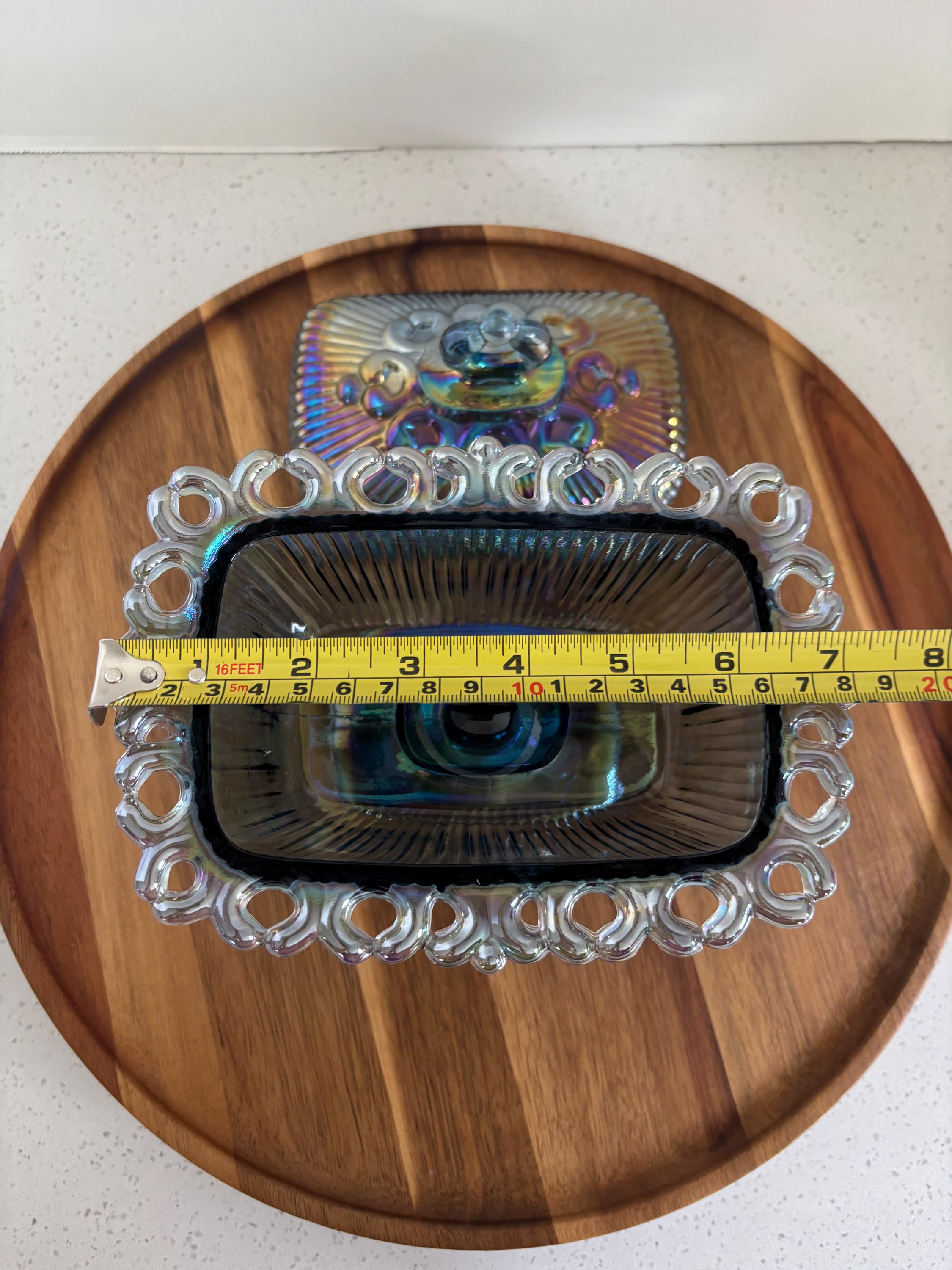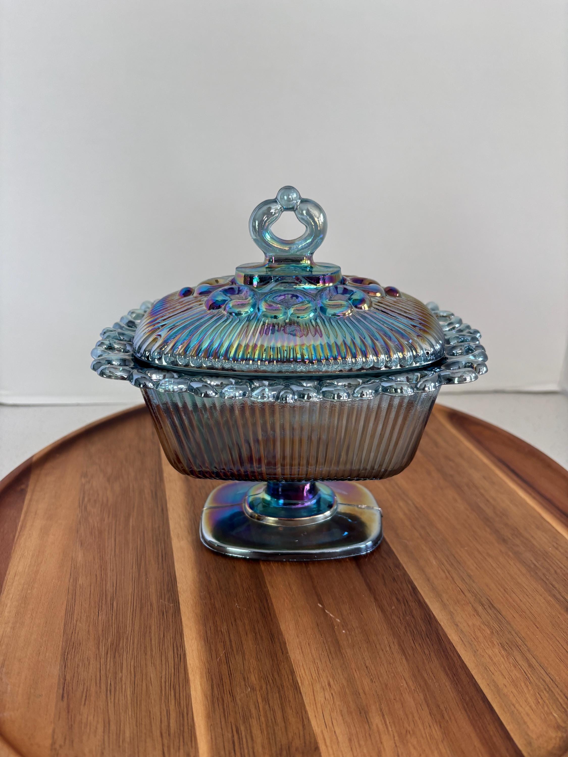 Step back in time with this striking Vintage Iridescent Blue Windsor Carnival Glass bowl, crafted by Indiana Glass in the 1970s. With its rich cobalt blue base and shimmering rainbow finish, this piece is a true standout — whether you're an avid glassware collector or just love the charm of vintage decor.