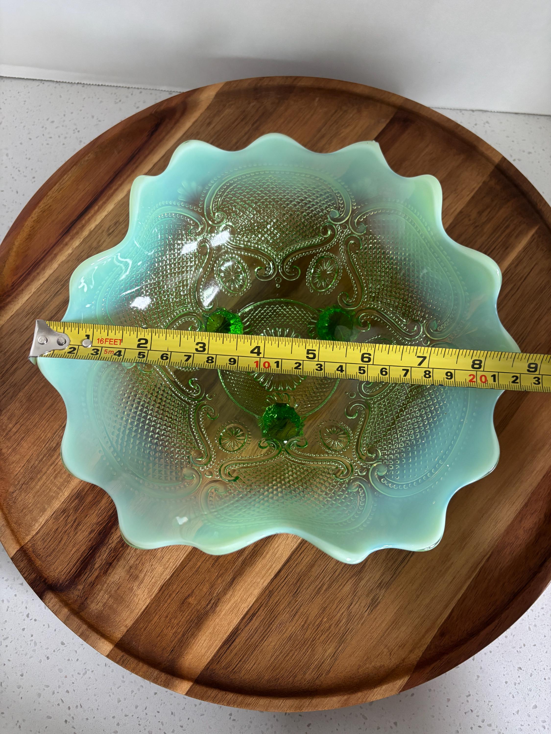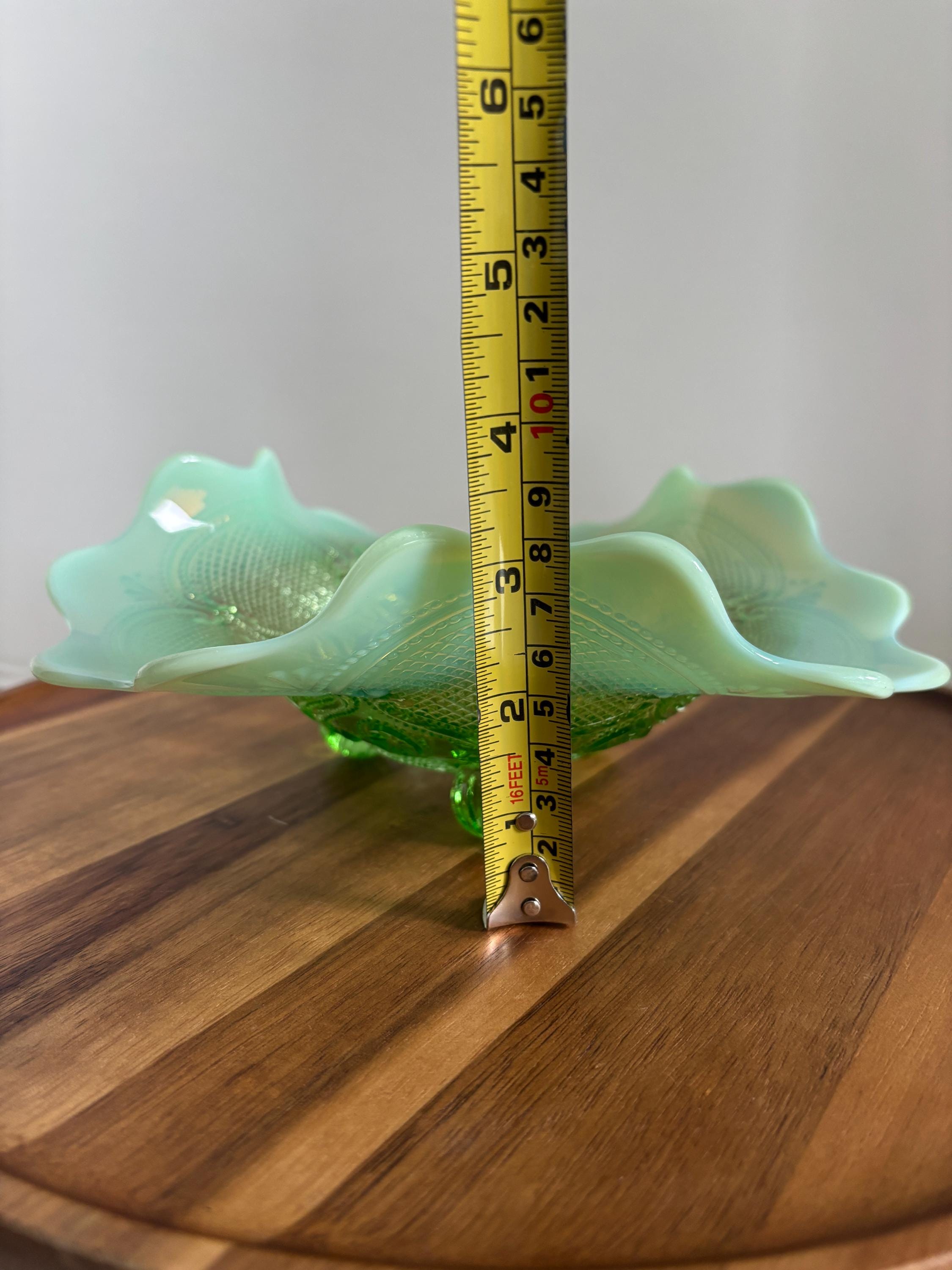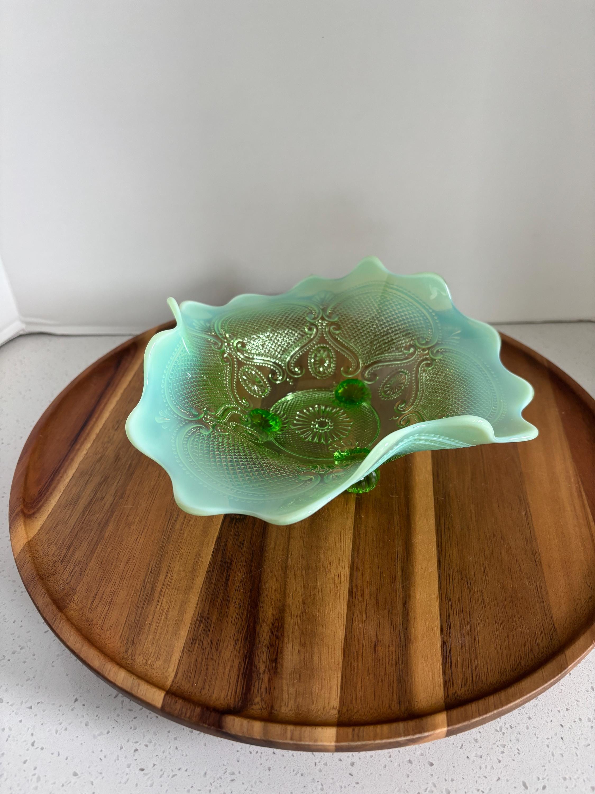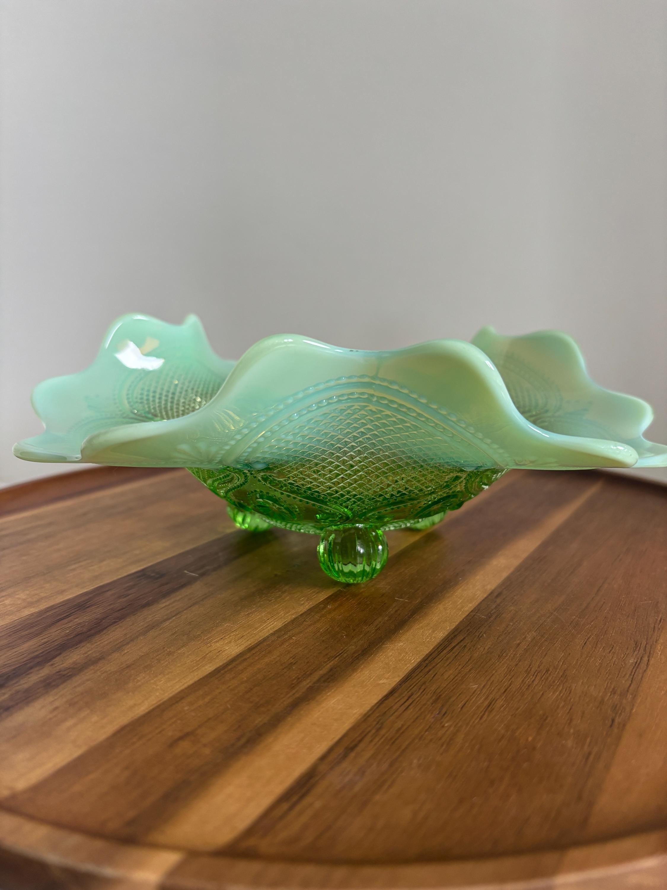 Elevate your vintage glass collection with this exquisite Northwood Green Opalescent Candy Dish, featuring the rare and highly sought-after Lattice and Medallions pattern. This bowl showcases Northwood's masterful glasswork — with glowing green hues, a gently scalloped edge, and radiant opalescent highlights that catch the light beautifully.