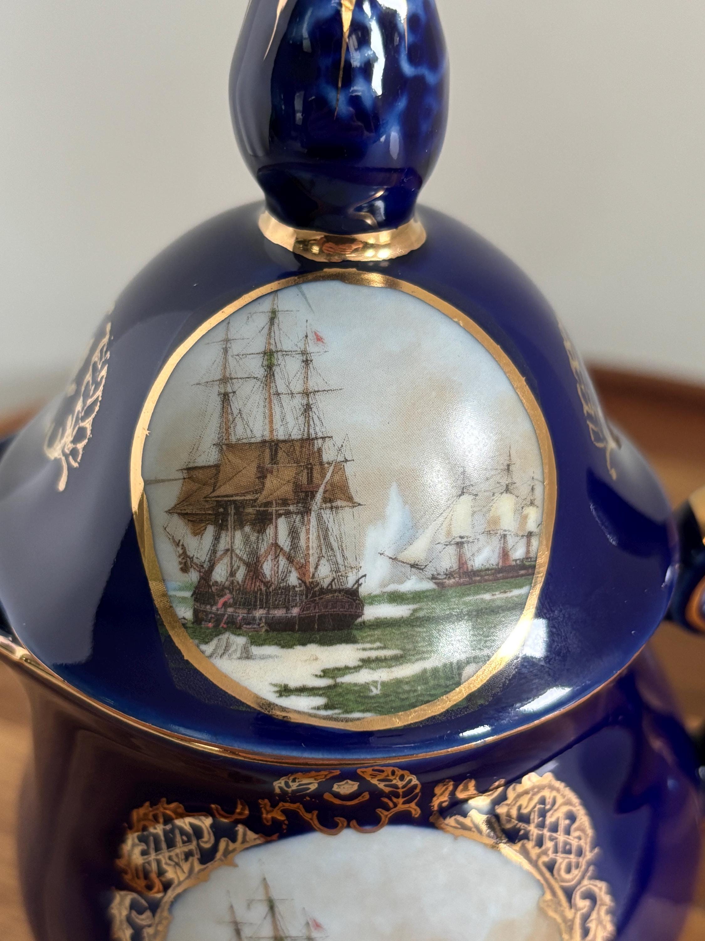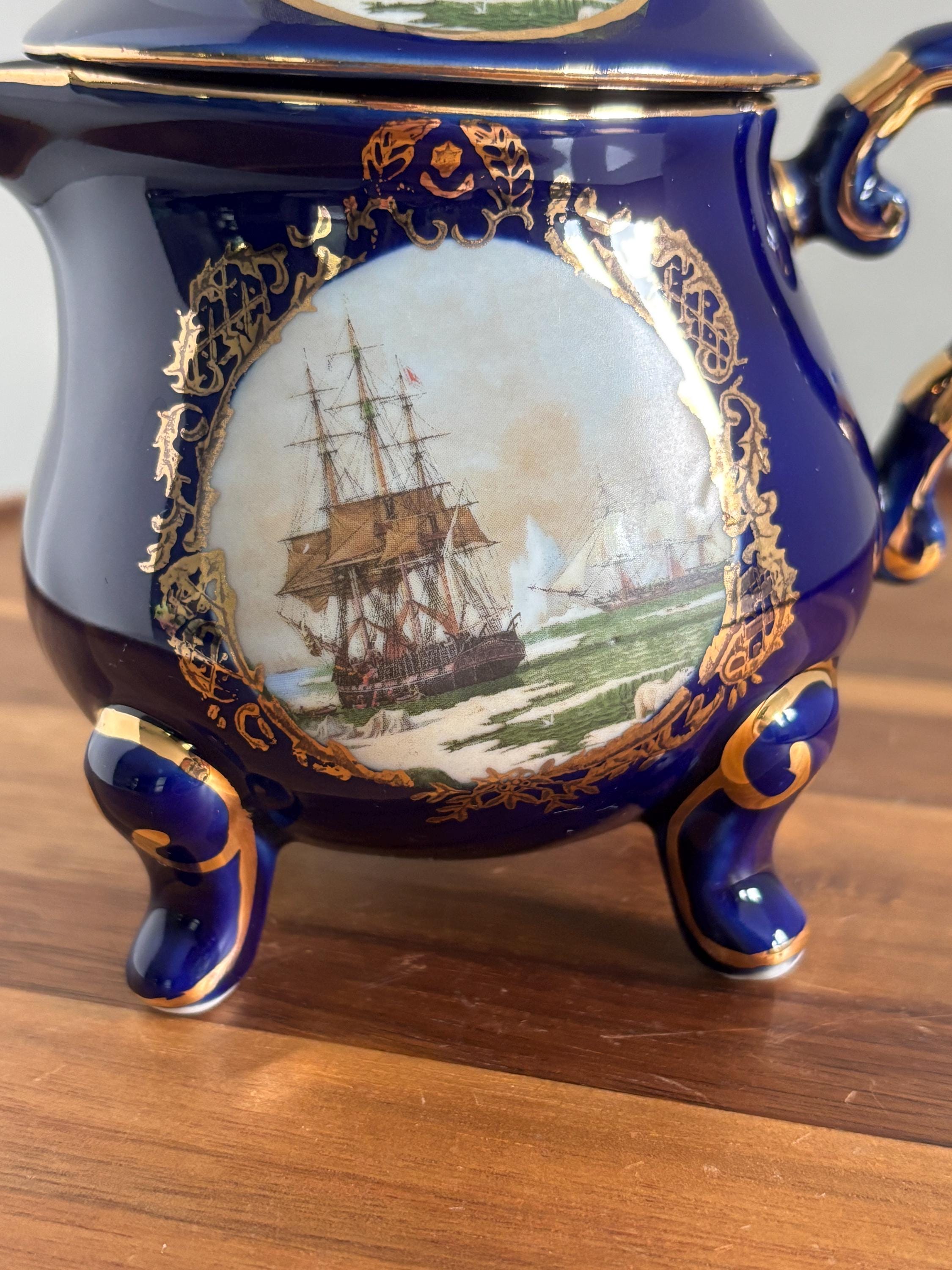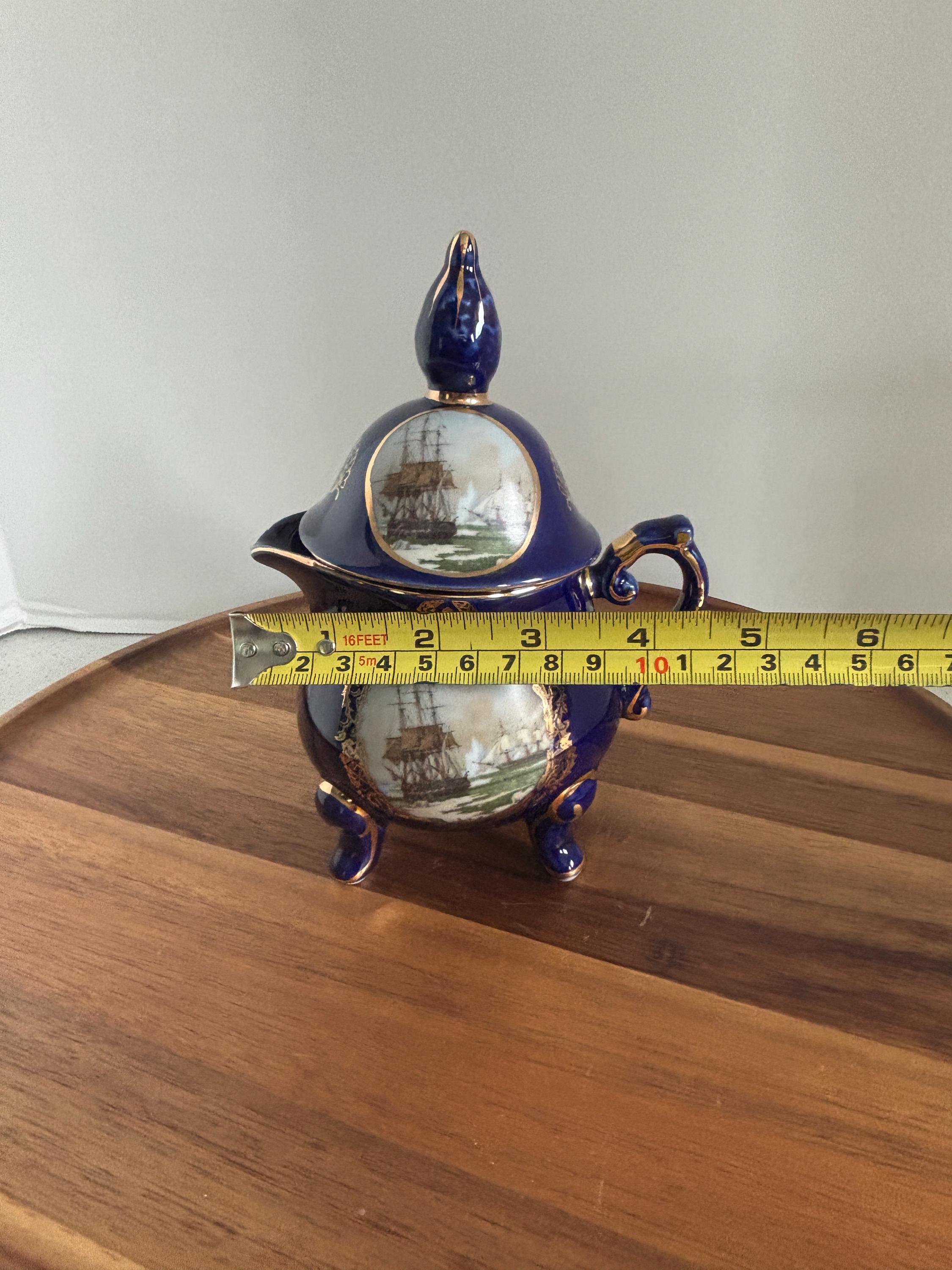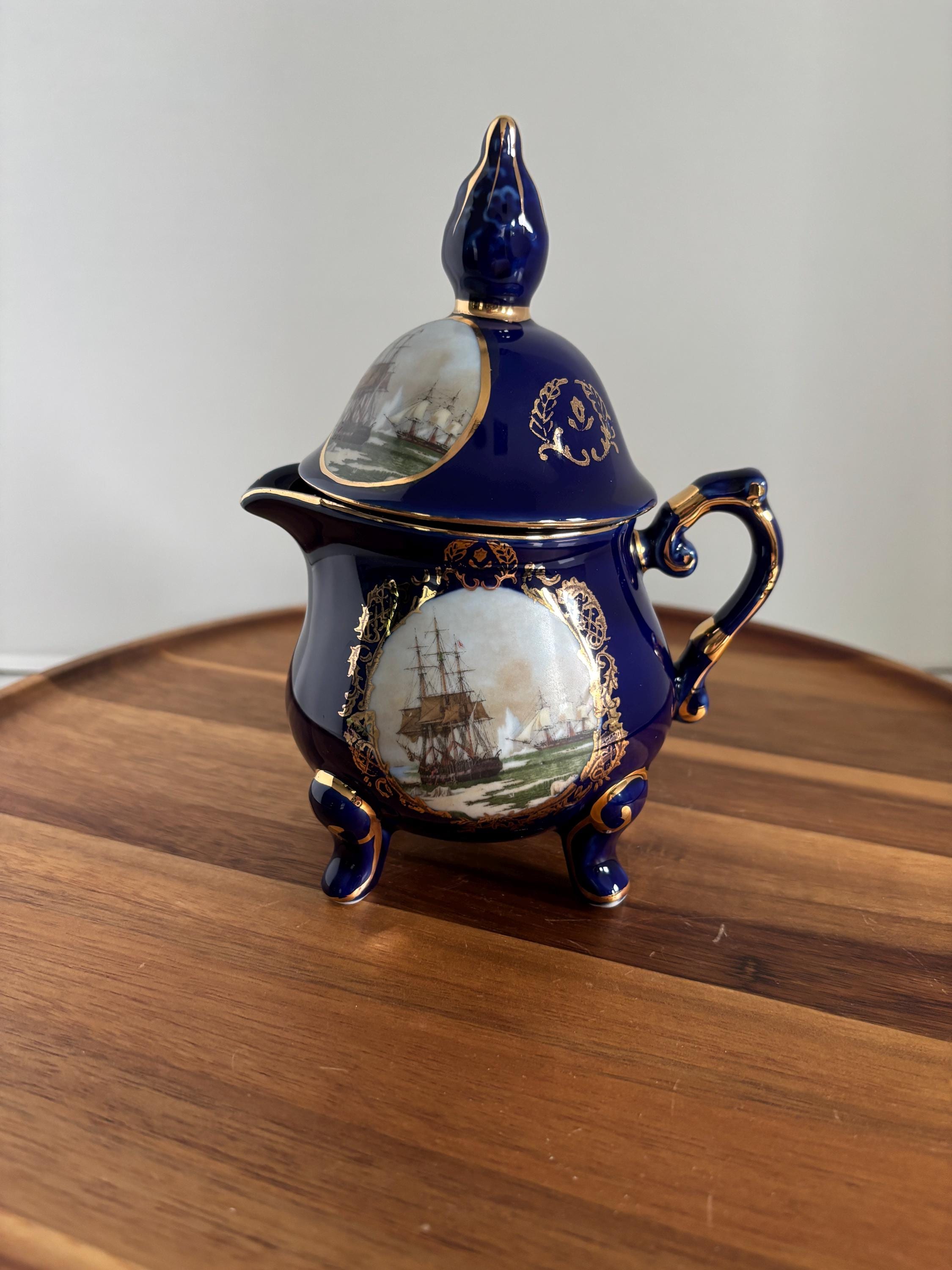 Add a touch of Old World charm to your table or display cabinet with this stunning Vintage Limoges Creamer Pitcher, featuring a regal cobalt blue glaze, intricate ship design, and fine gold accents. Crafted in France, this piece exemplifies Limoges porcelain craftsmanship — refined, timeless, and highly collectible.