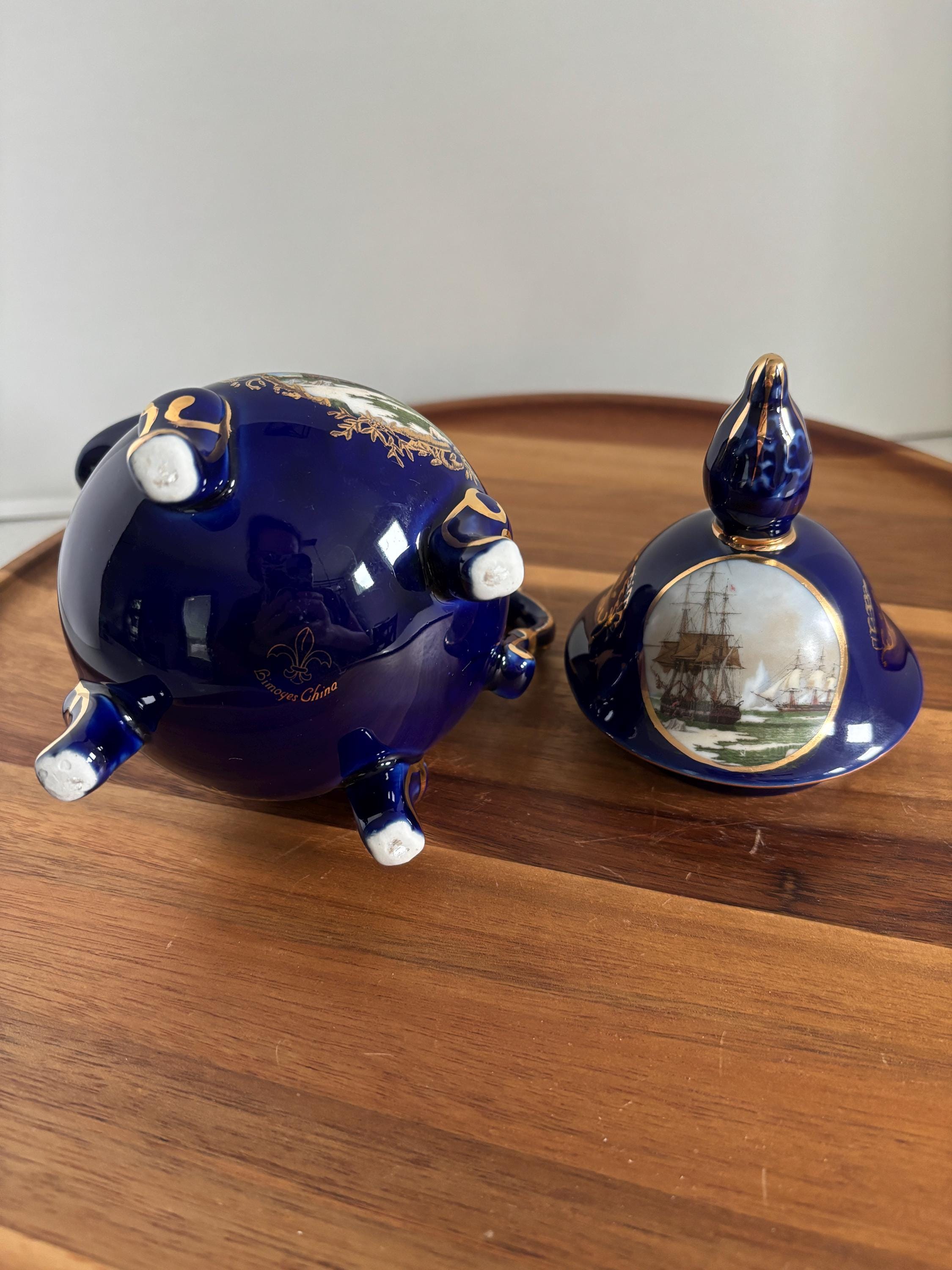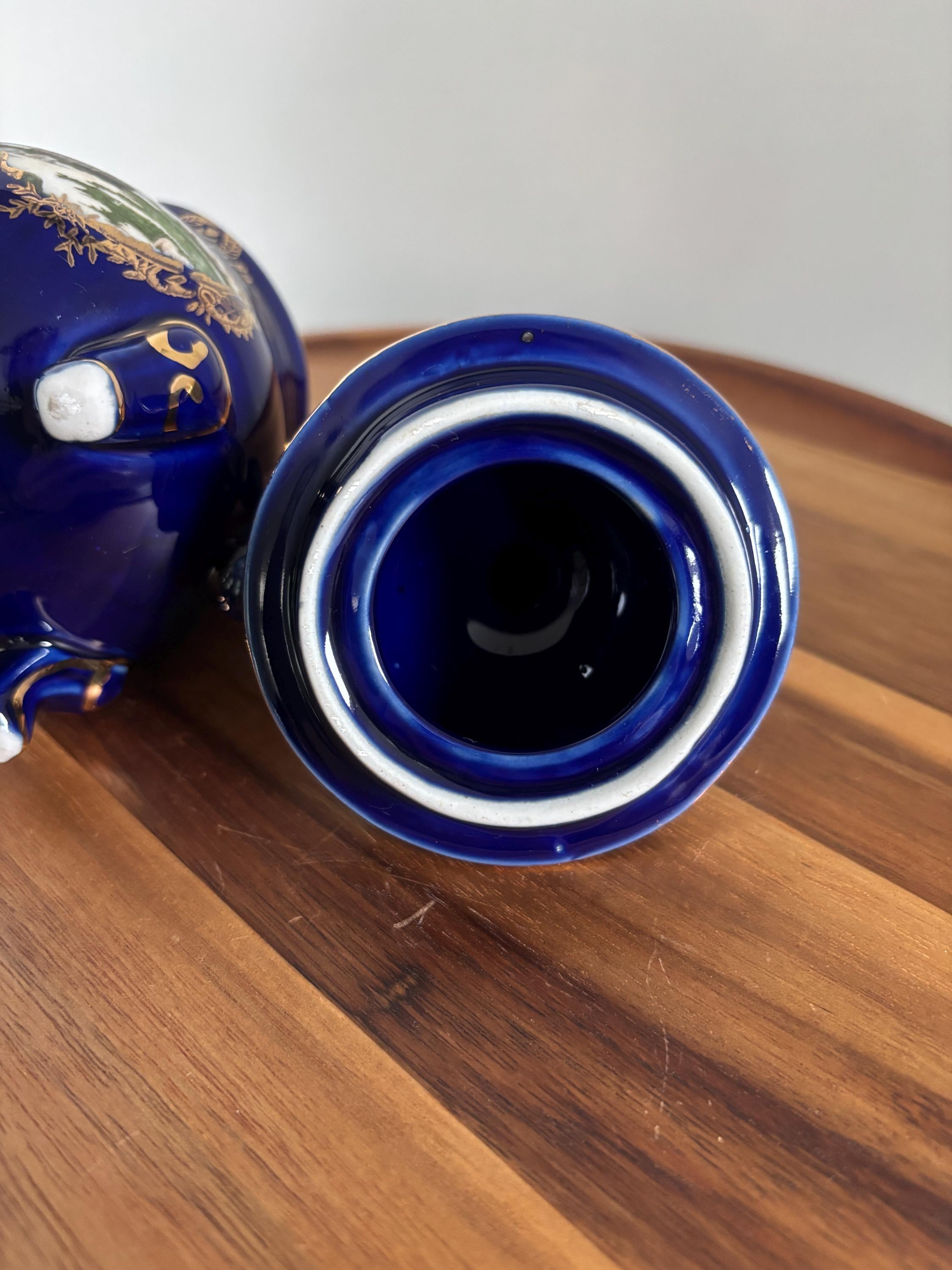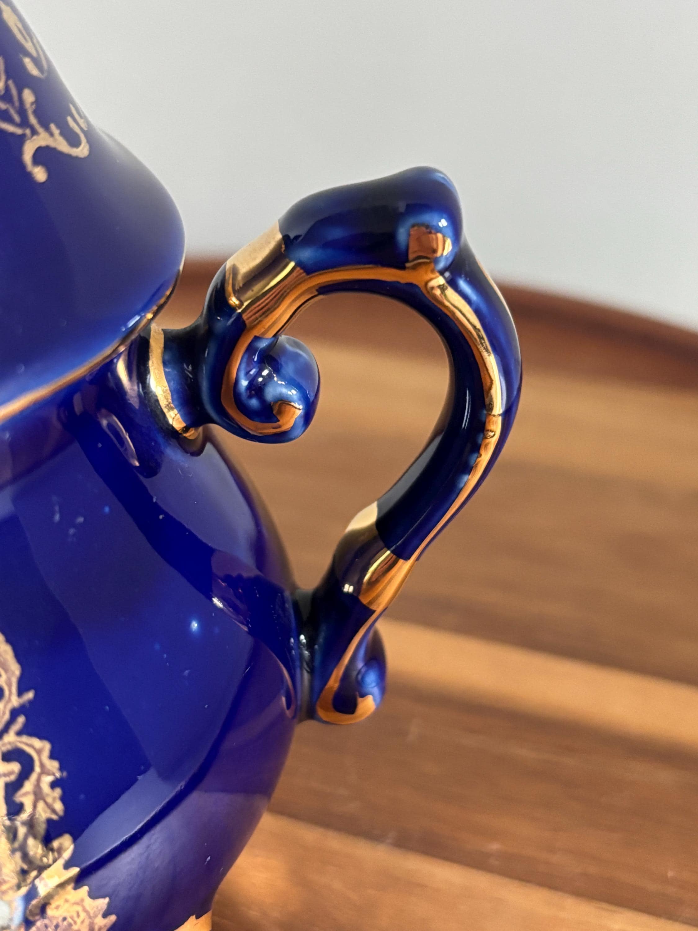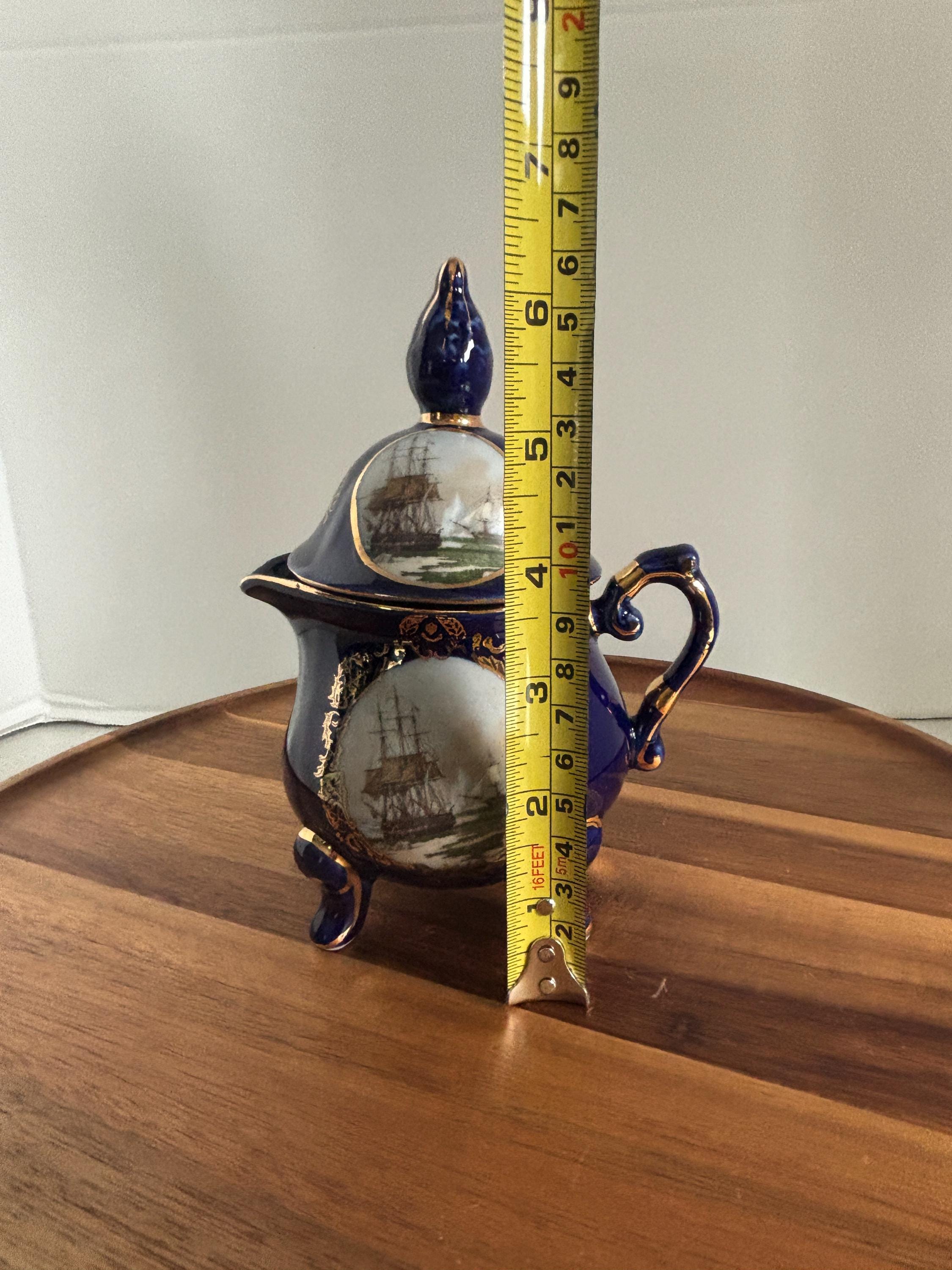 Add a touch of Old World charm to your table or display cabinet with this stunning Vintage Limoges Creamer Pitcher, featuring a regal cobalt blue glaze, intricate ship design, and fine gold accents. Crafted in France, this piece exemplifies Limoges porcelain craftsmanship — refined, timeless, and highly collectible.