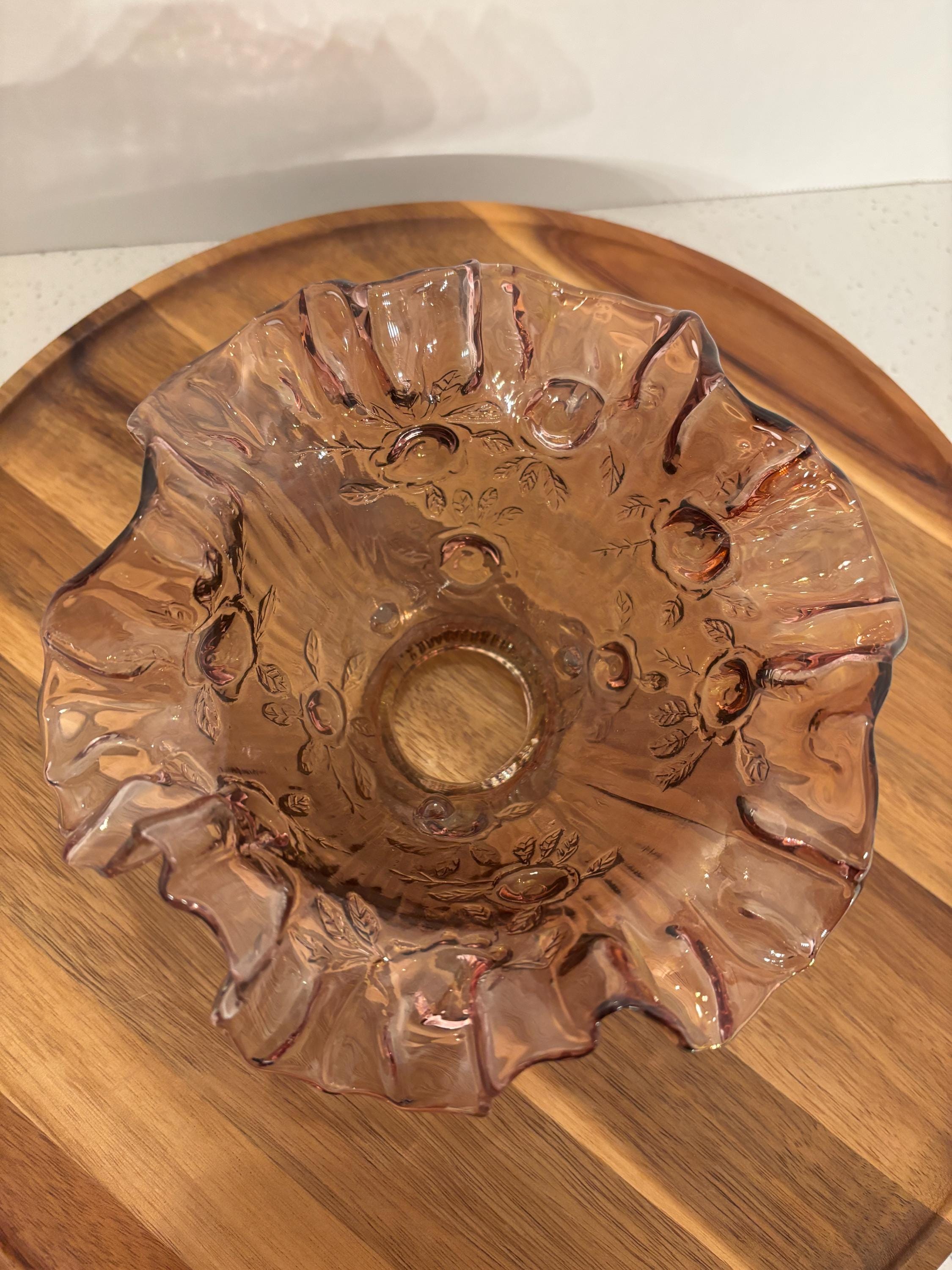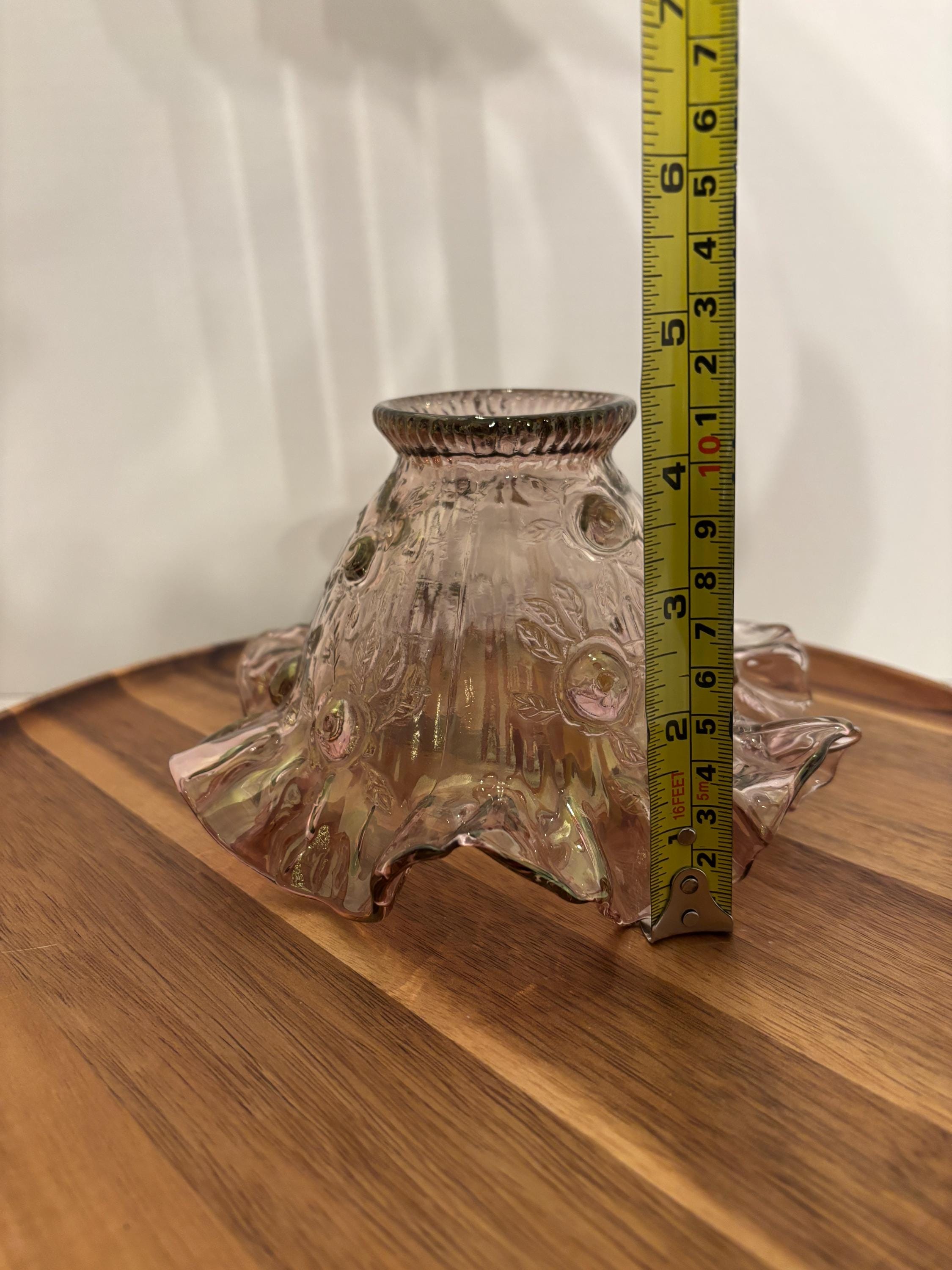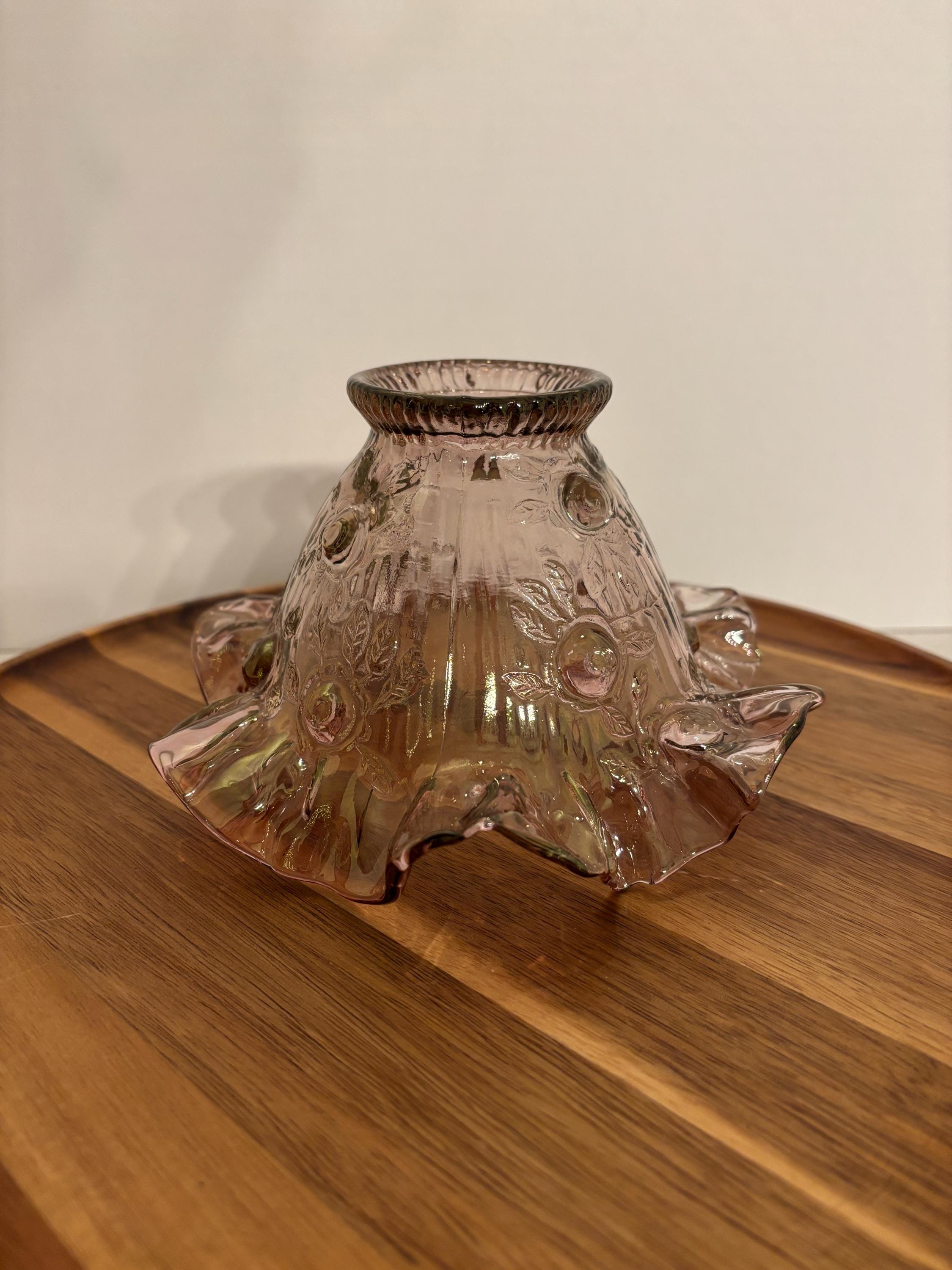 ***Dusty Rose Pink floral glass lamp shade with ruffled or fluted rim at the bottom and a ribbed opening at the top