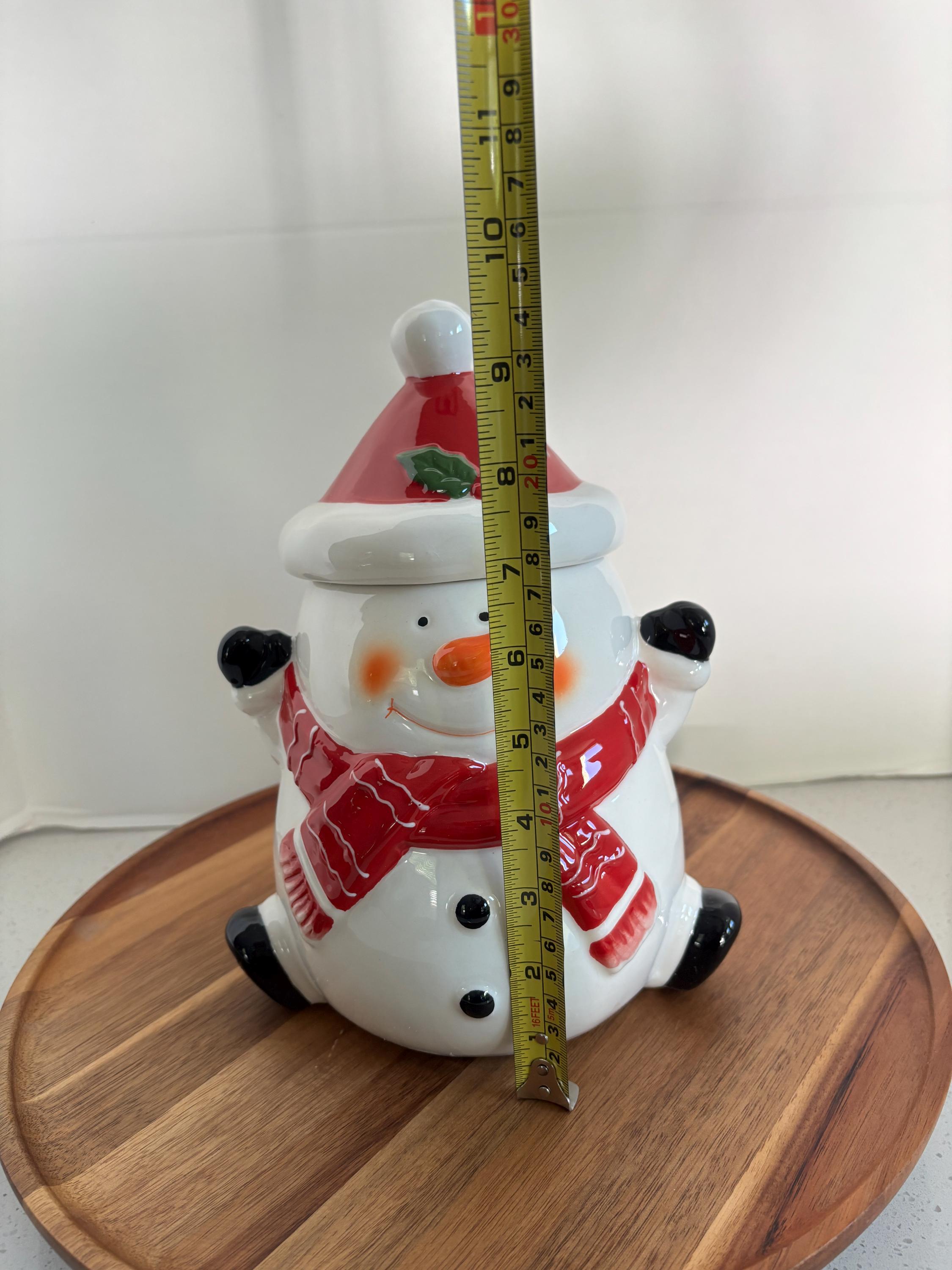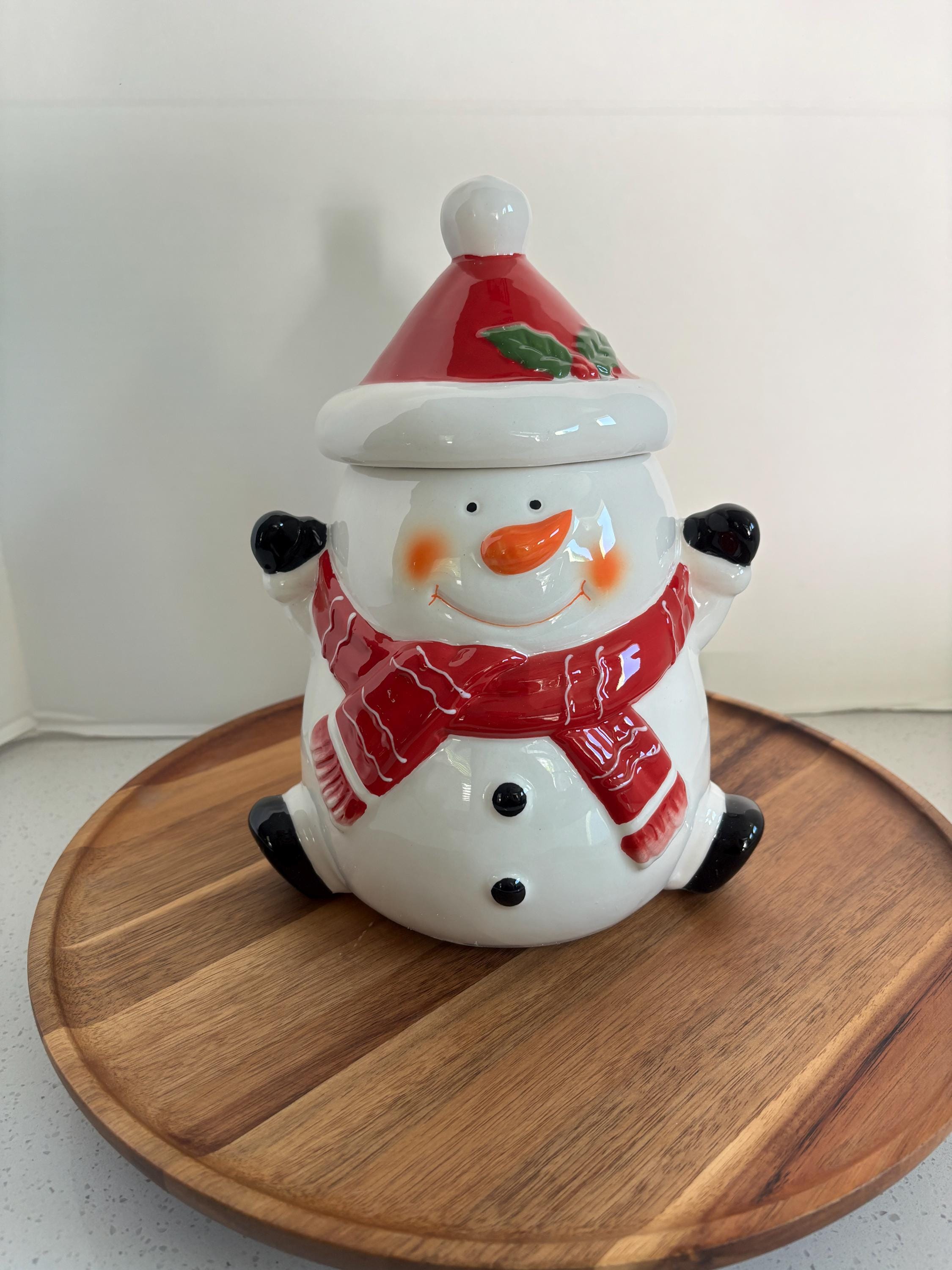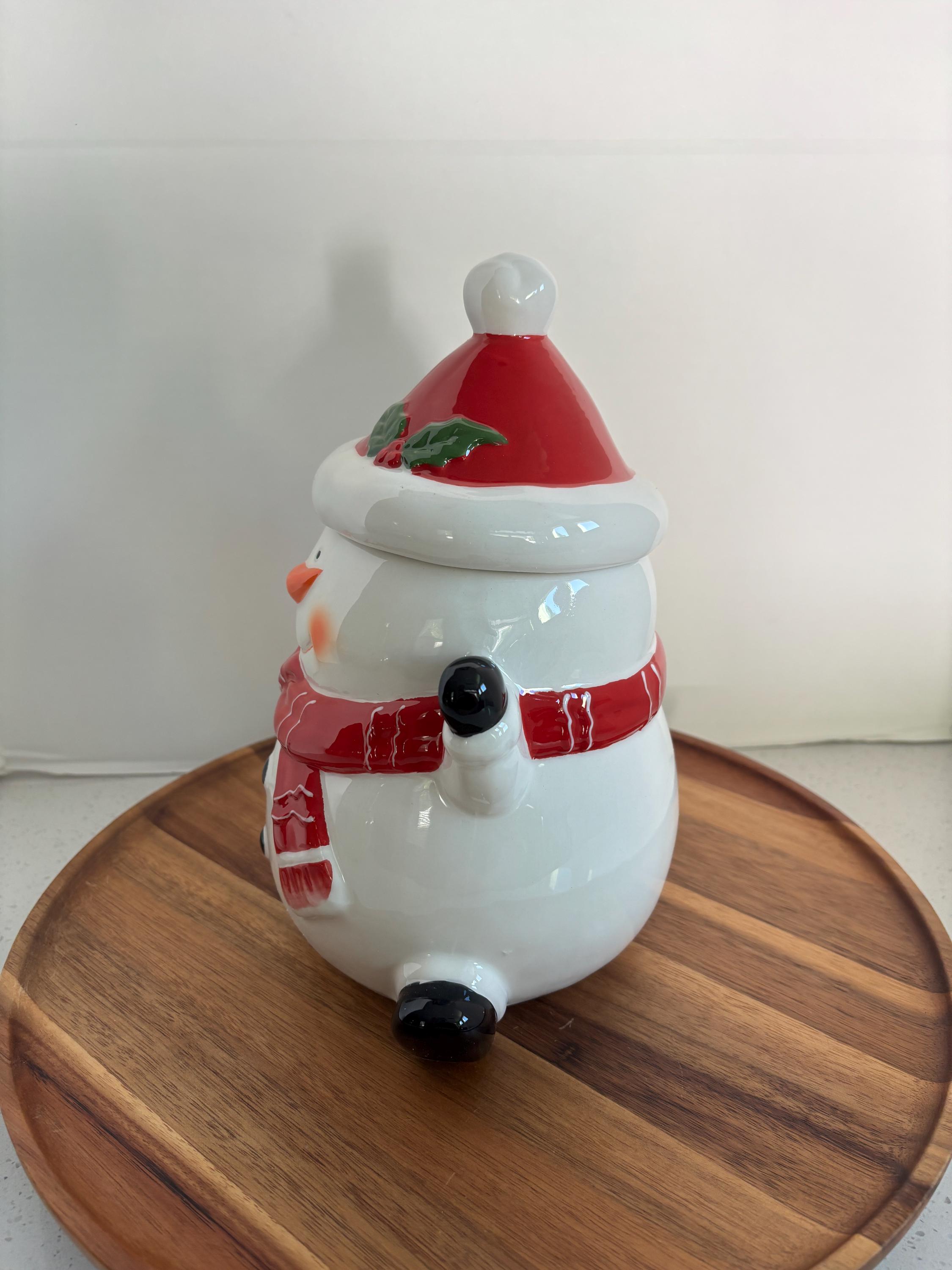 Bring the magic of the holidays to your kitchen with the Happy Snowman Christmas Porcelain Cookie Jar! This charming snowman is bundled up in a cozy scarf and Santa hat, ready to guard your favorite holiday treats with a cheerful smile.