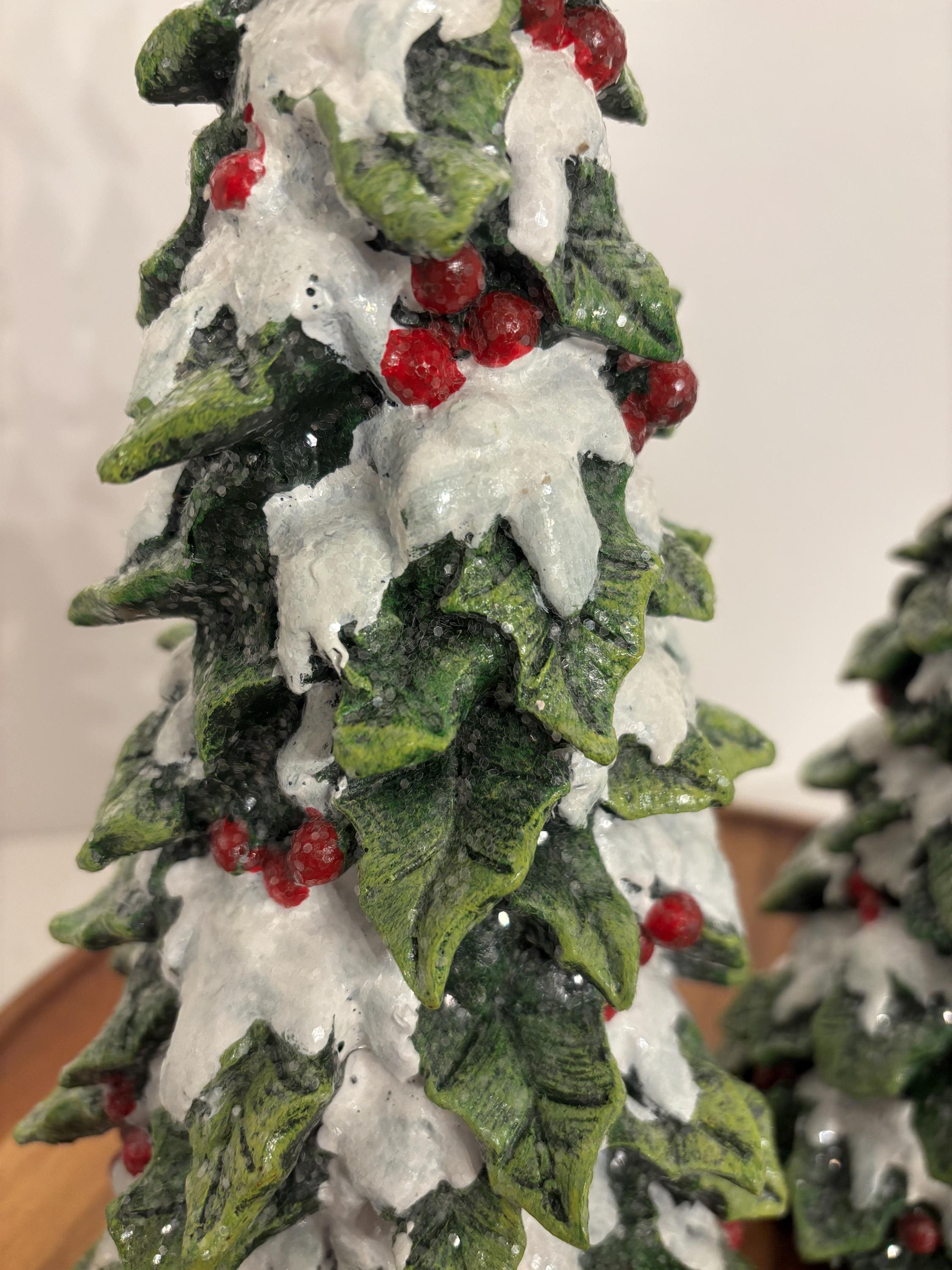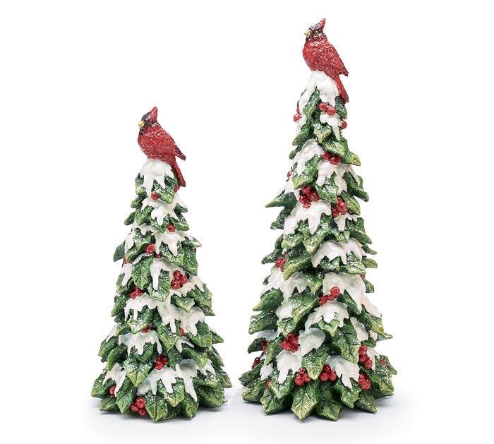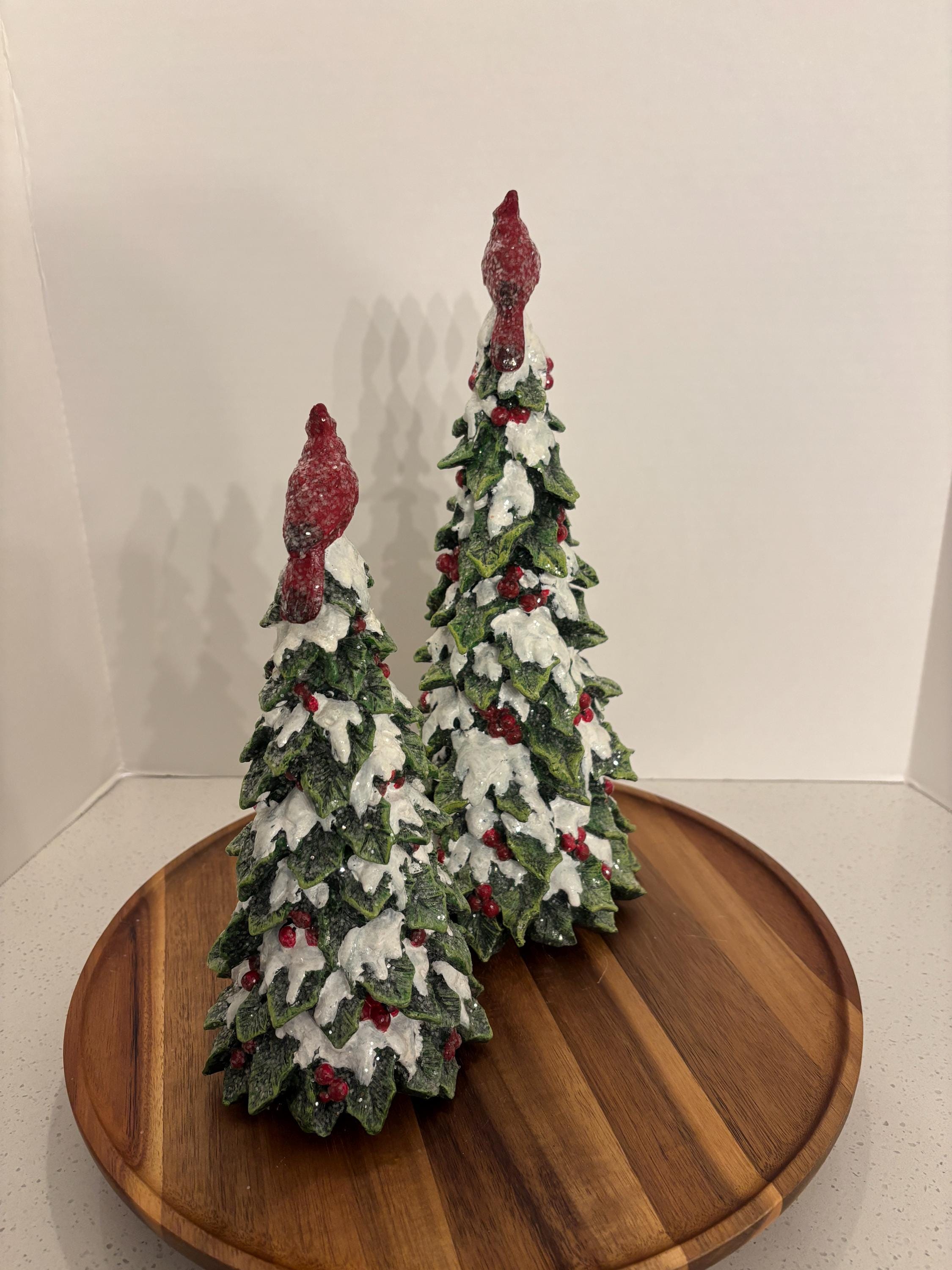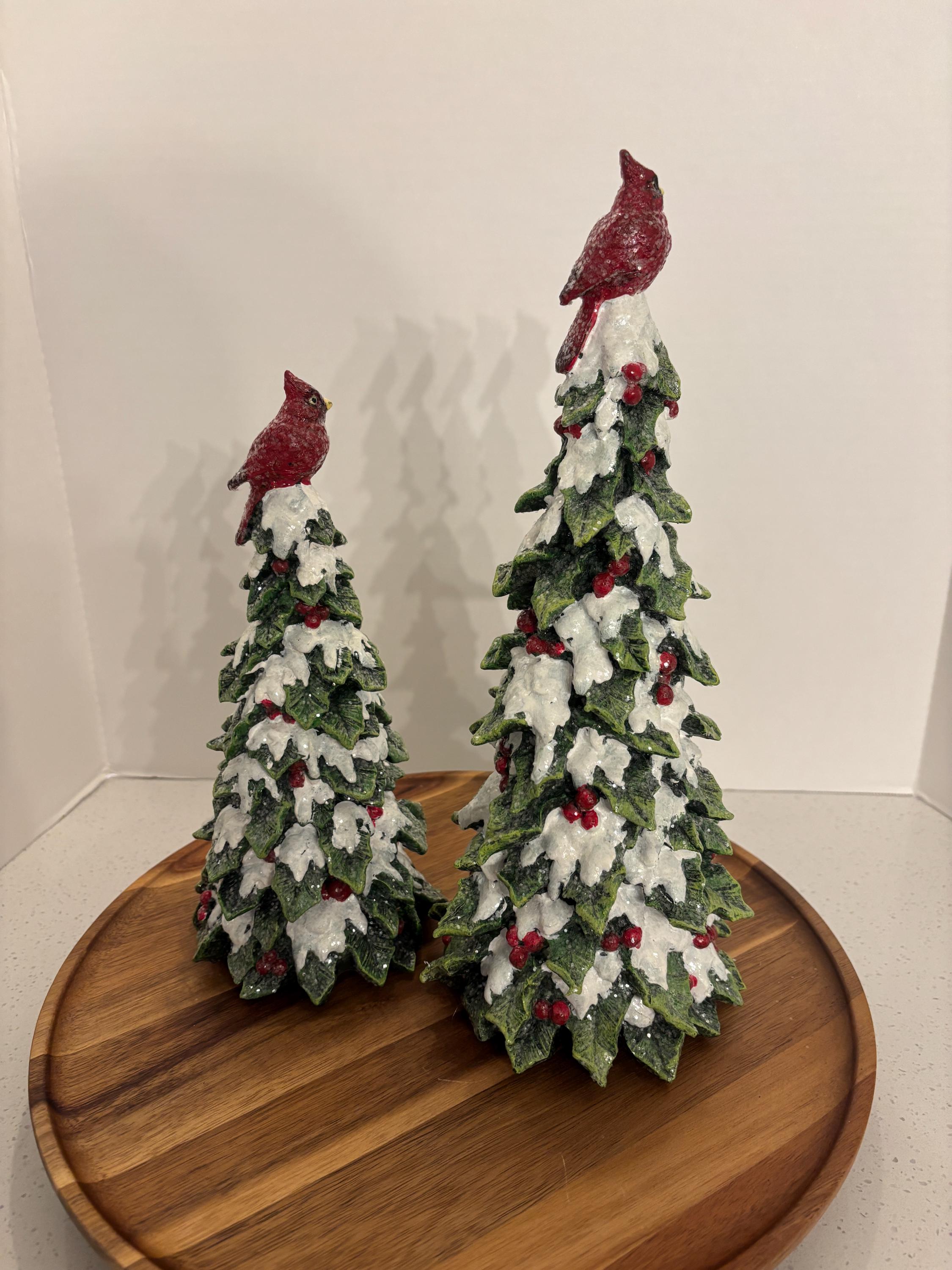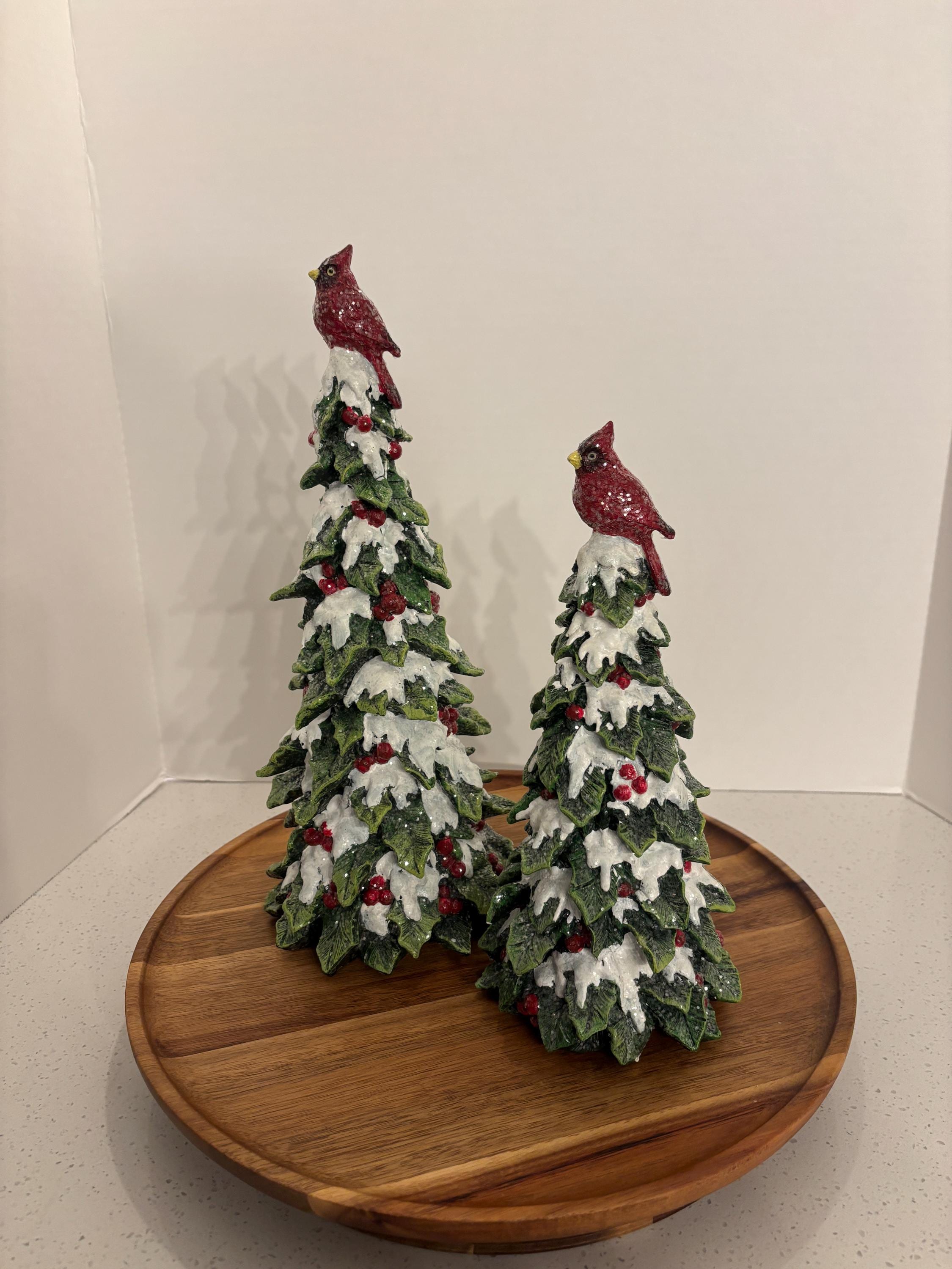 ***Resin green holly snowy trees with red cardinals perched with glittery white snow and red berries