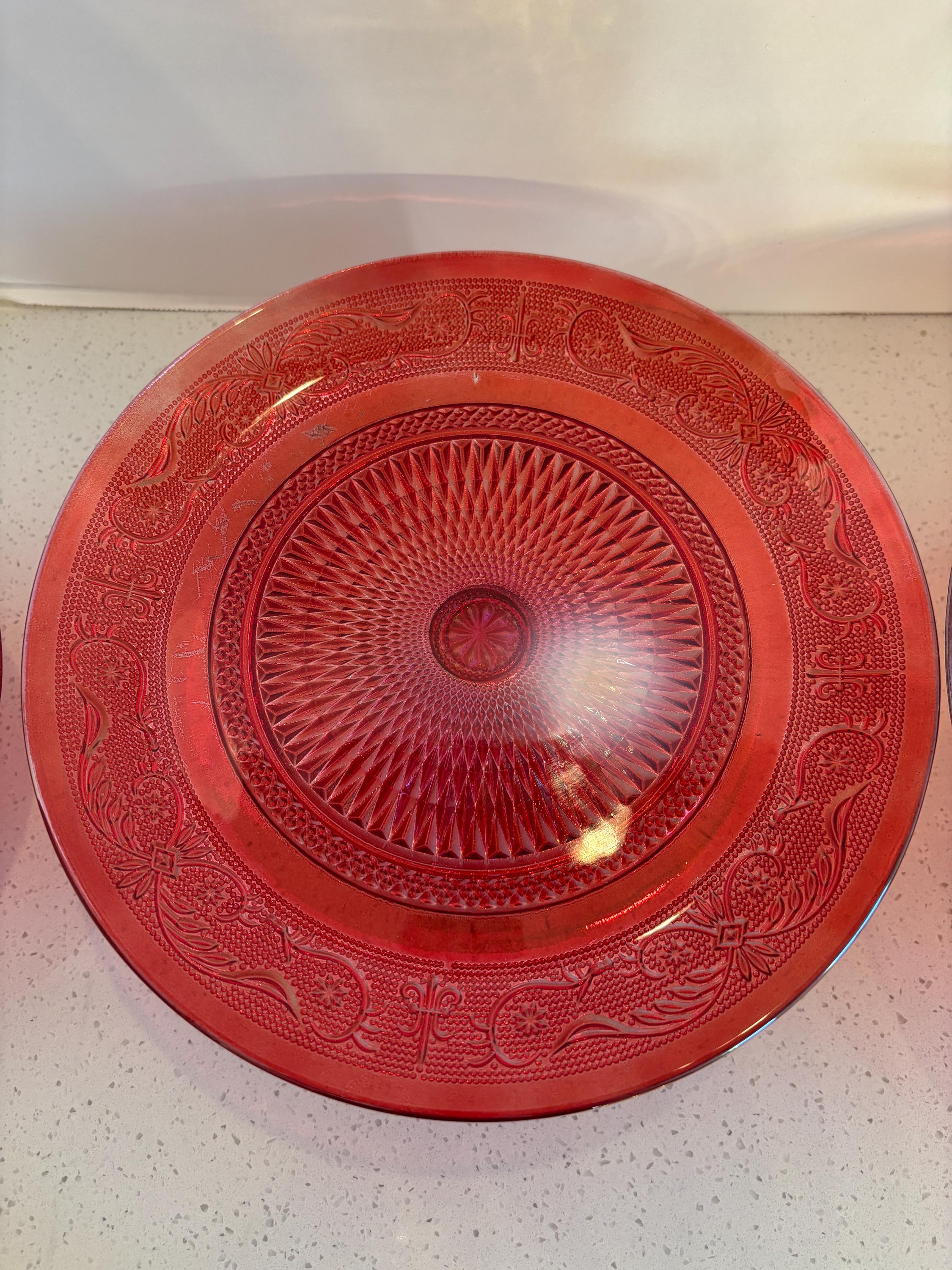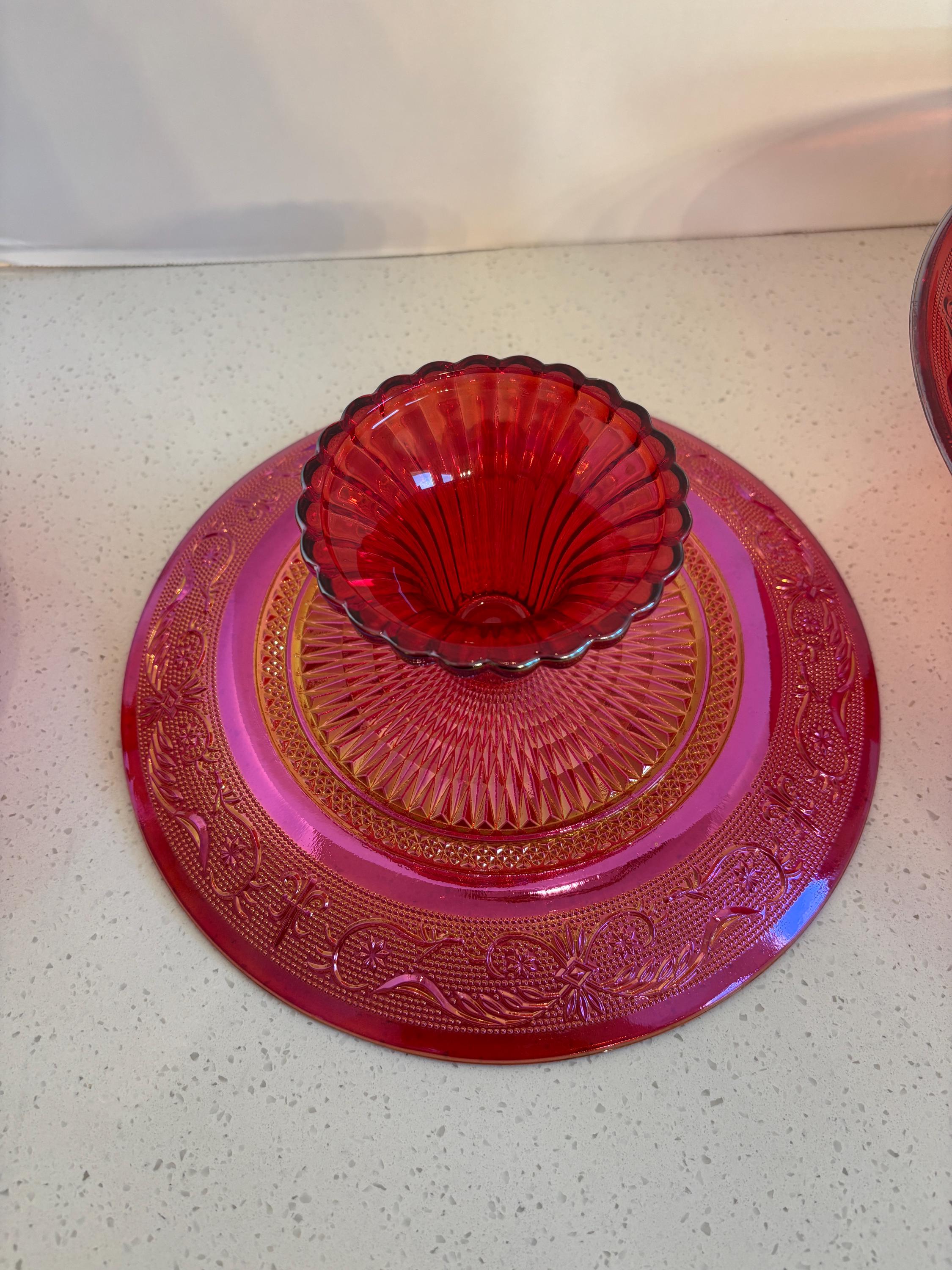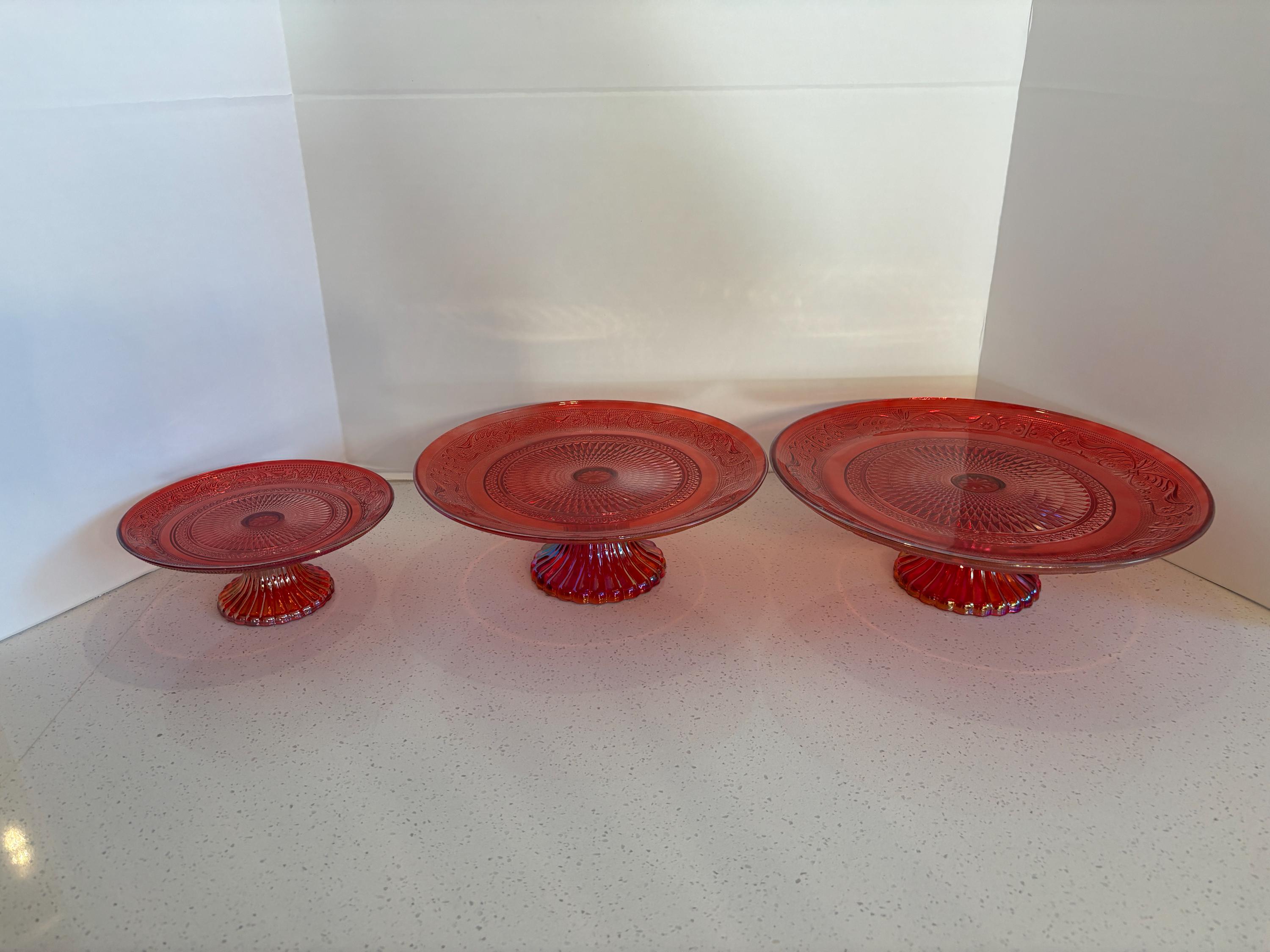 Make a bold and beautiful statement with our Glass Red Iridescent Cake Plate Stand, available in three sizes: Small, Medium, or Large. Featuring a vibrant red hue with a shimmering iridescent finish, this stand adds a touch of luxury and drama to any dessert display.