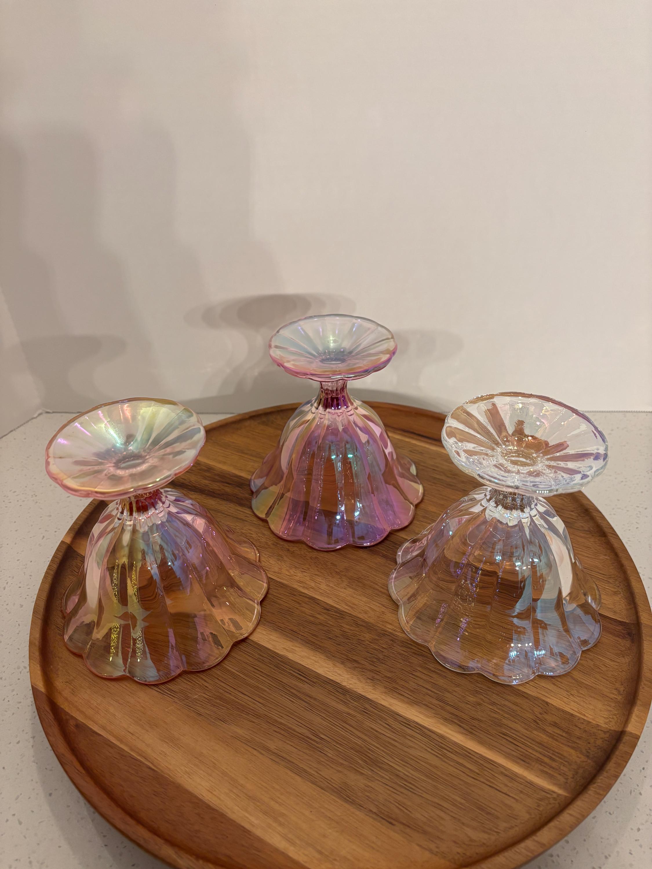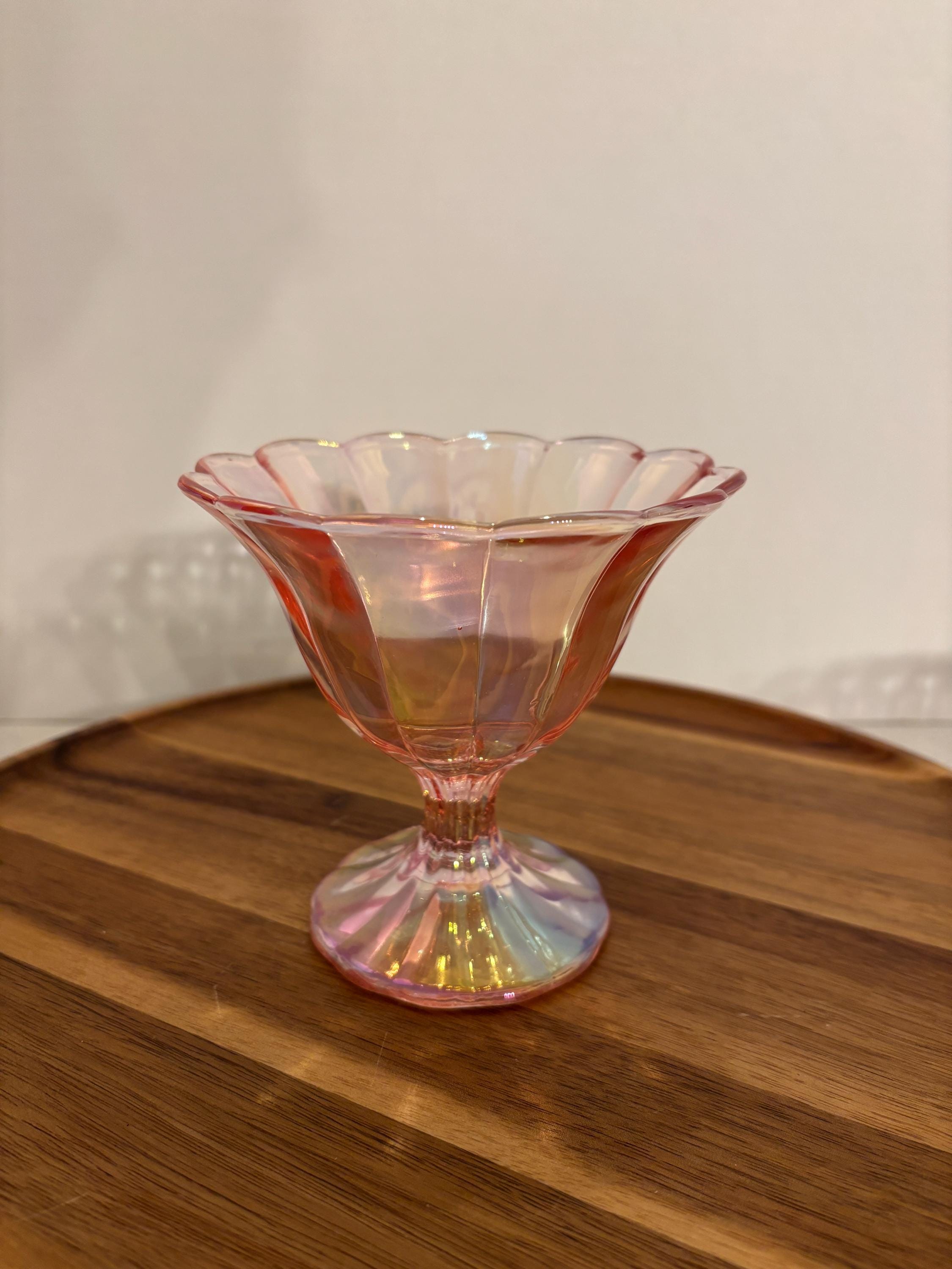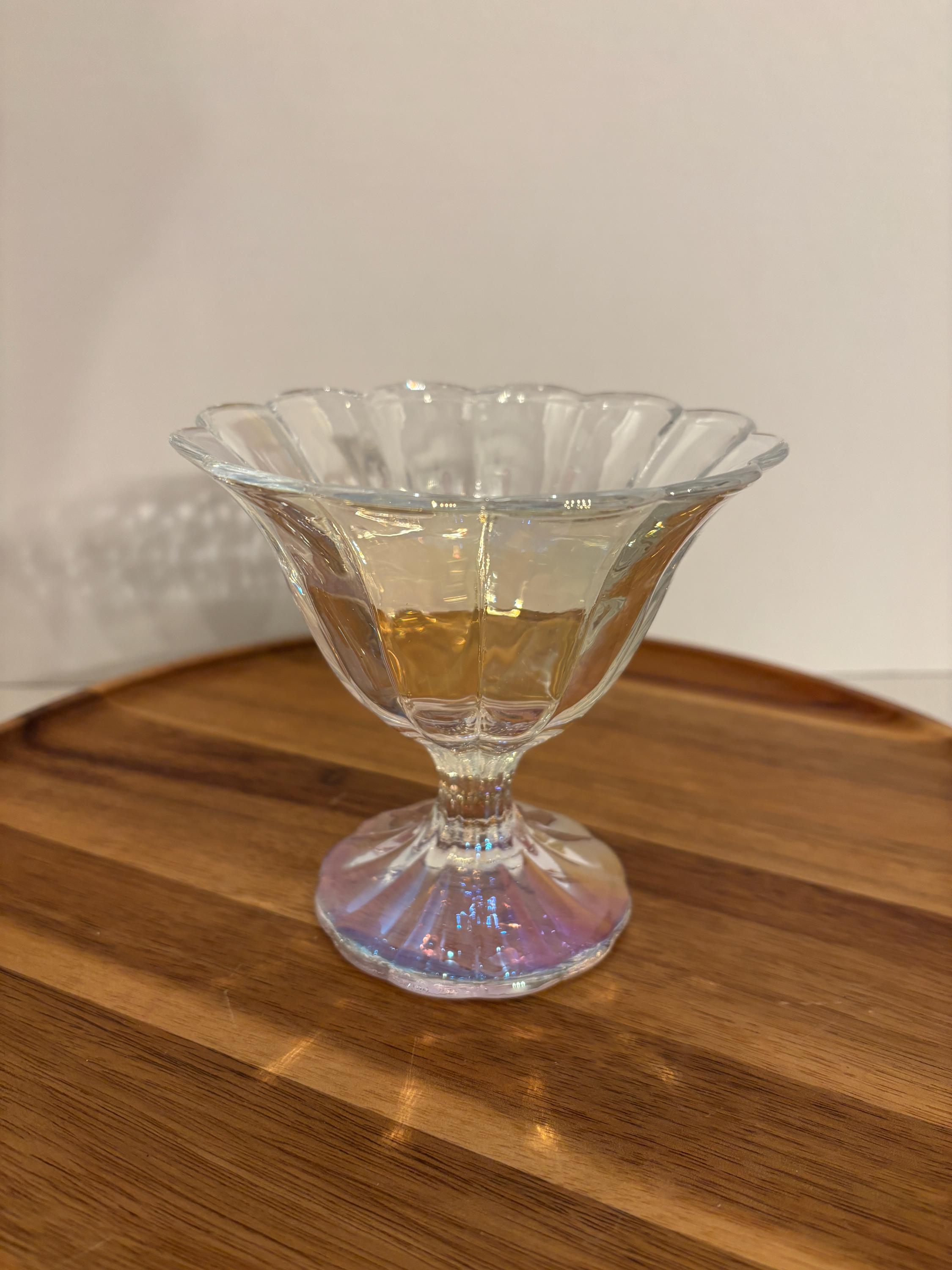 Serve style with every scoop. Our Iridescent Sherbet-Style Glass Bowl Dish brings a touch of vintage charm and modern shimmer to your table. With its scalloped edges, pedestal base, and radiant iridescent finish, this glass bowl is perfect for desserts, snacks, or elegant décor accents.