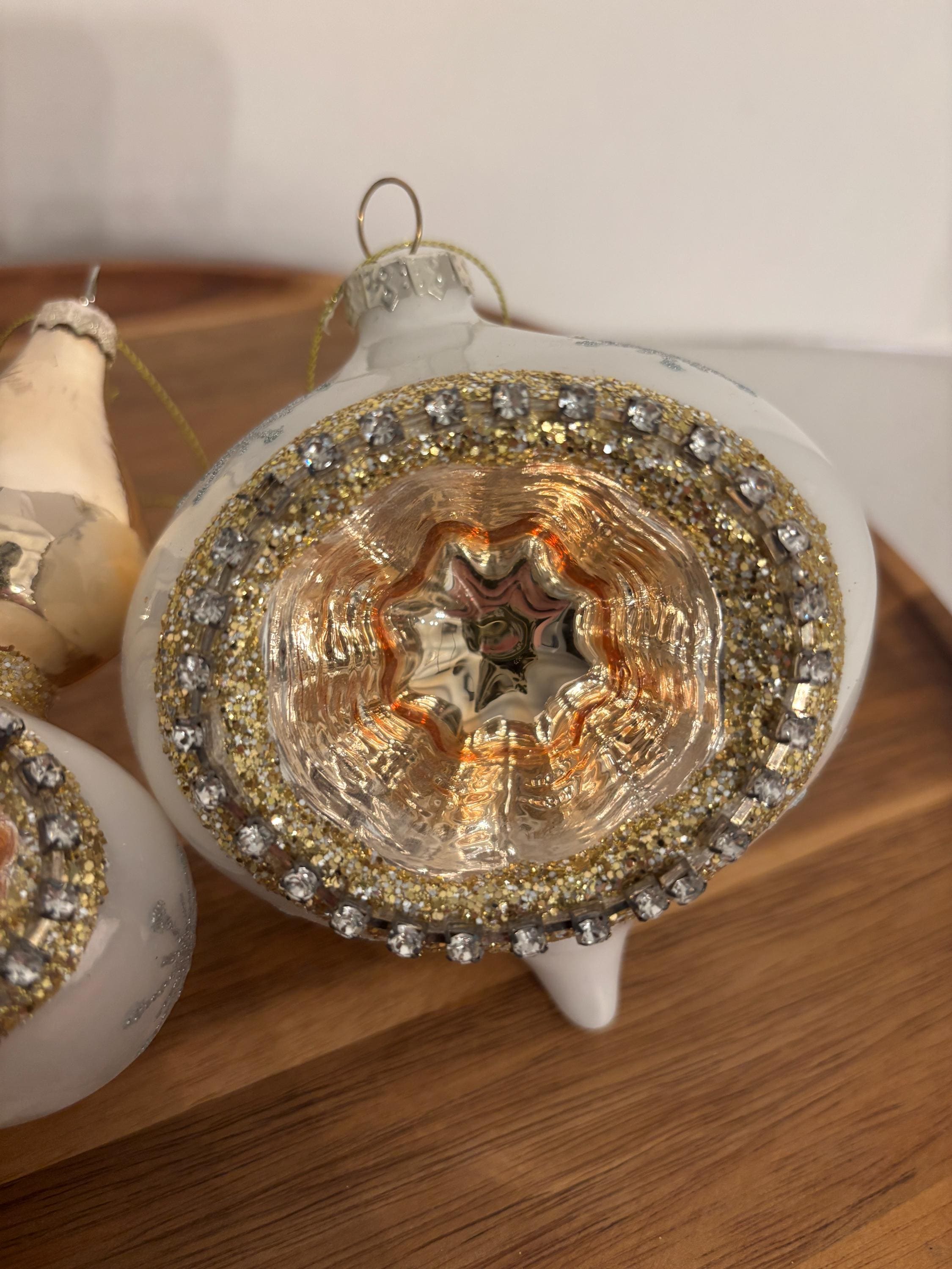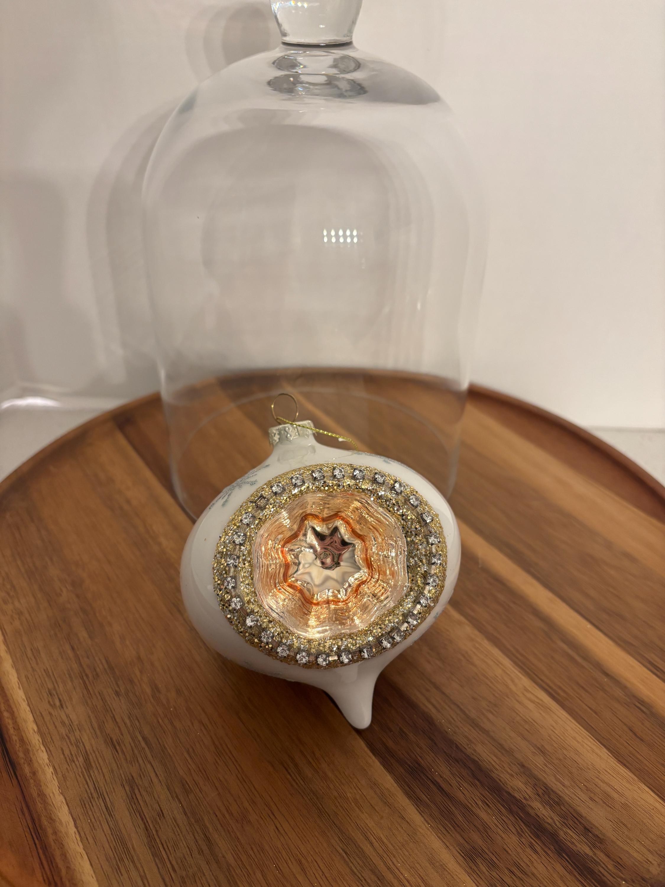 The ornaments shimmer in white and gold finishes, accented with silver glitter stars and gold gemstones that catch and reflect the tree lights for a radiant glow. Each piece is topped with a gold cap and loop, ready to hang and add nostalgic charm to your Christmas tree, garland, or wreath.