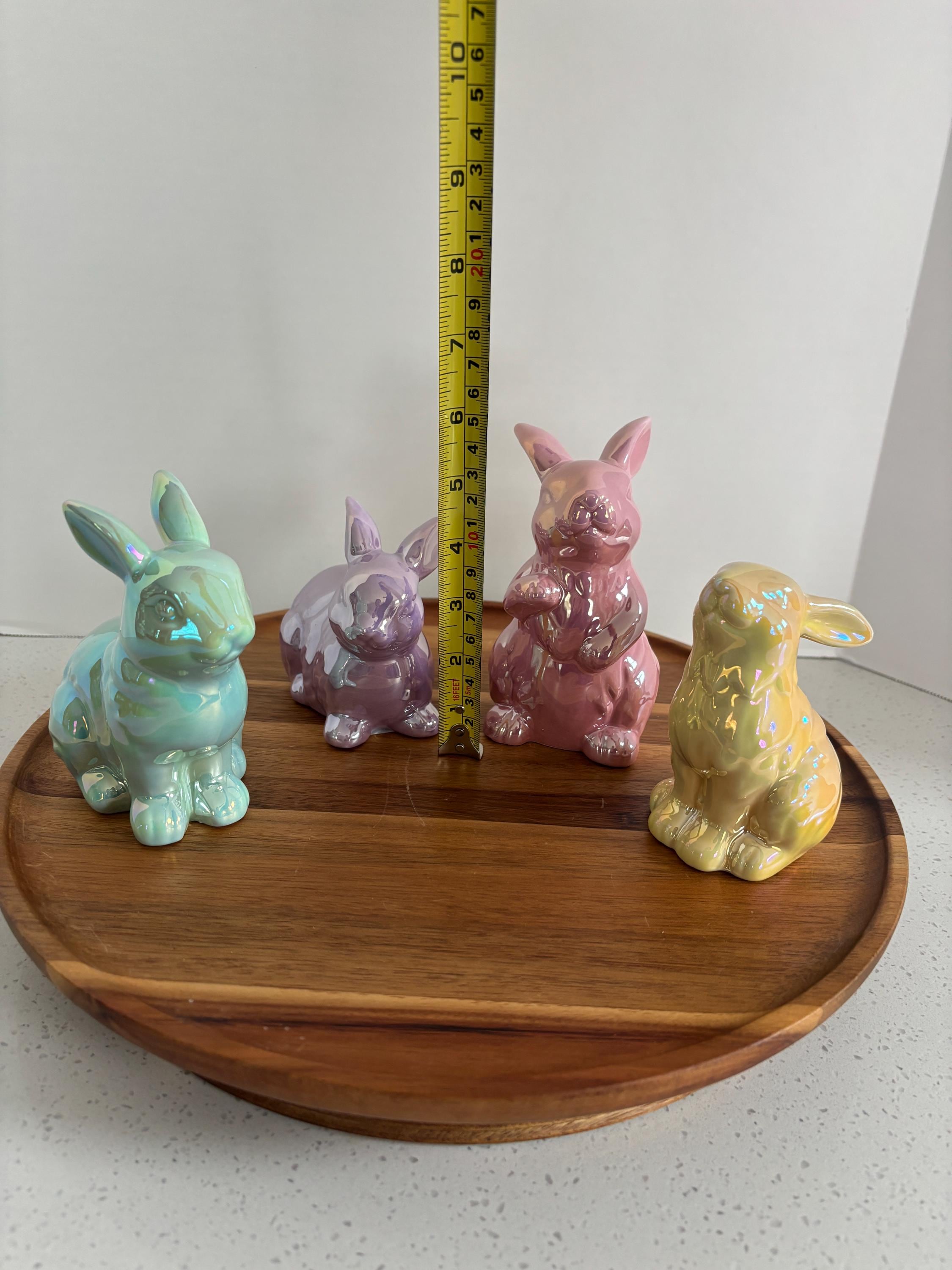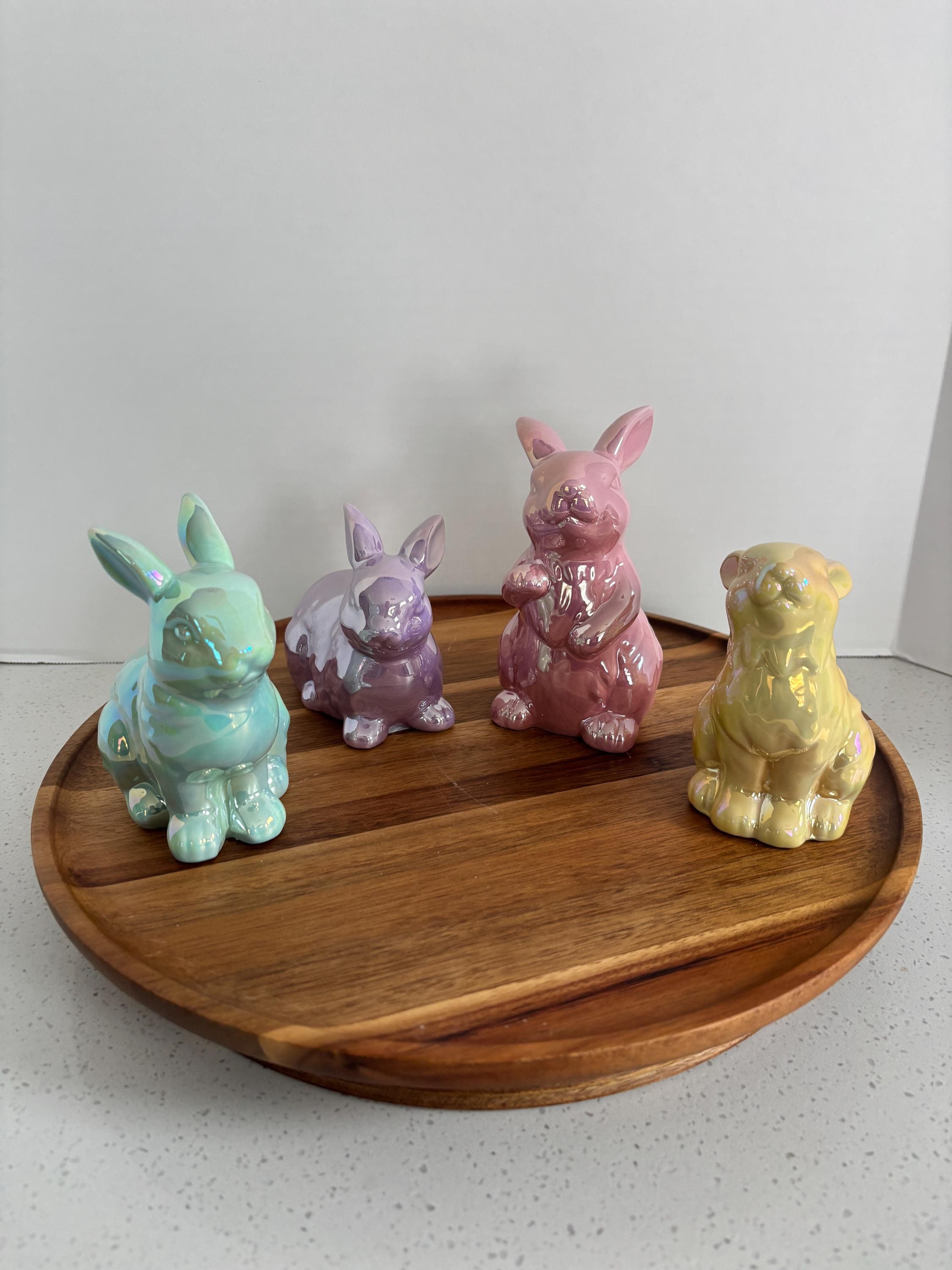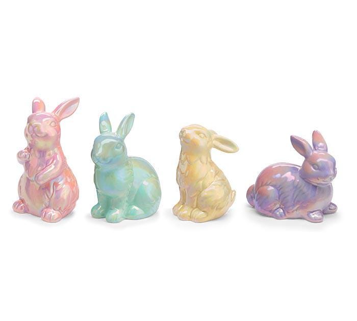 Add a touch of springtime sparkle to your décor with this assortment of four iridescent bunny figurines. Each ceramic bunny features a soft, shimmering finish that catches the light beautifully, creating a magical, eye-catching display.