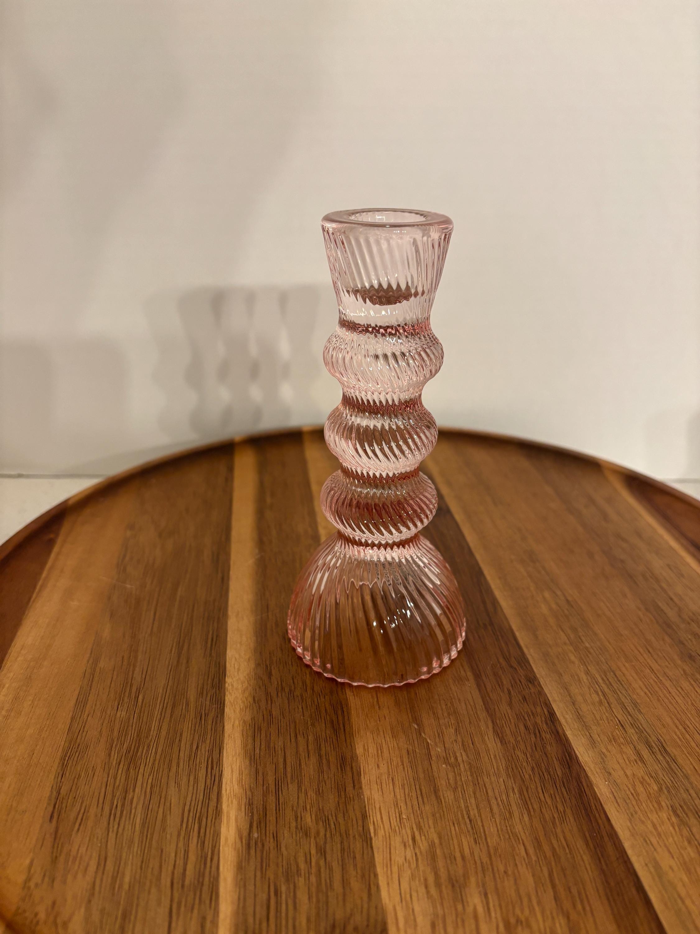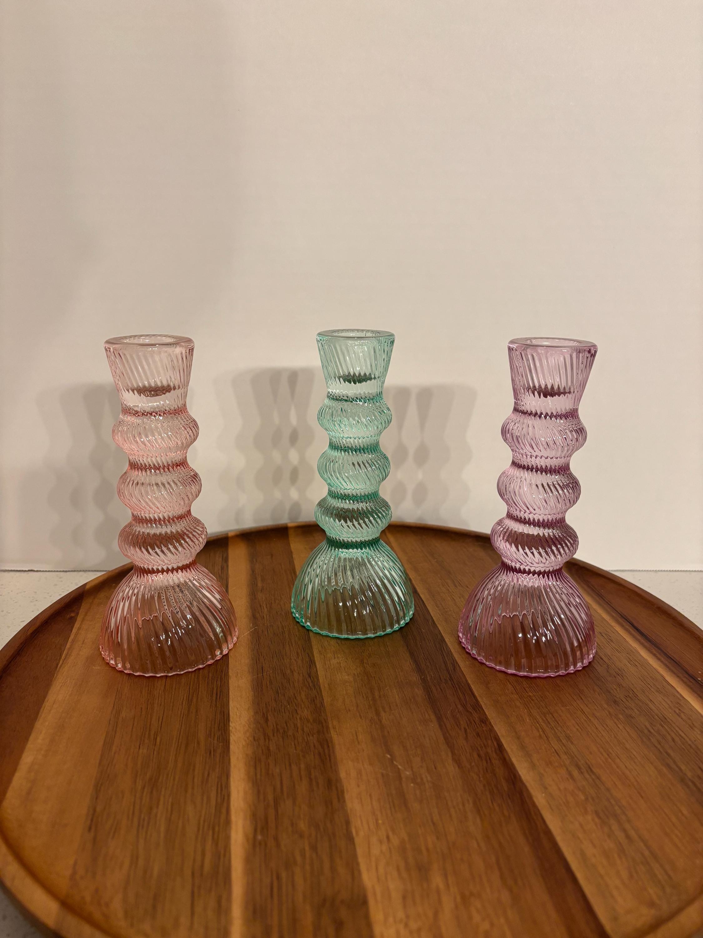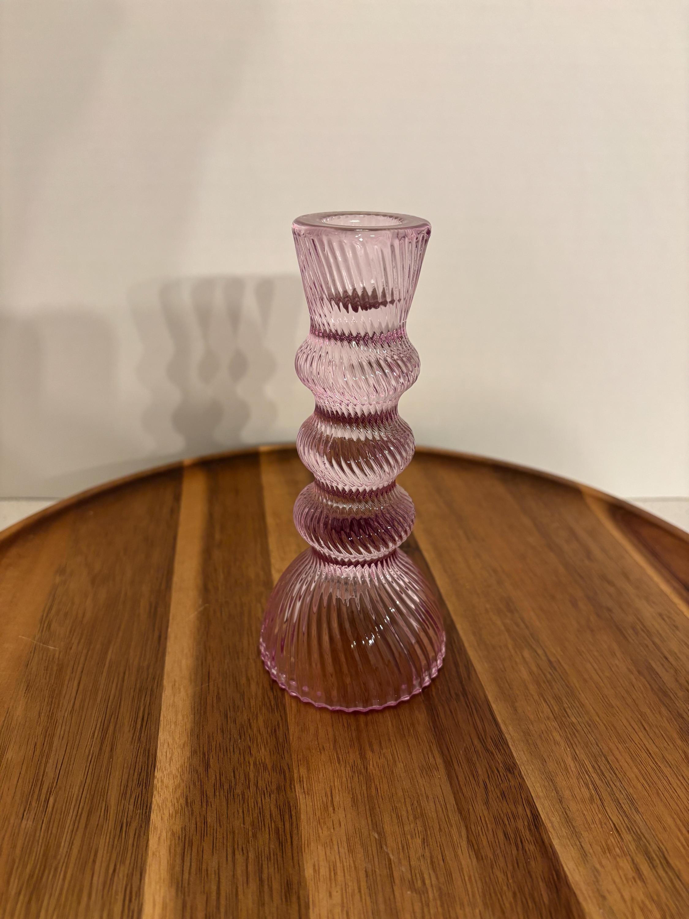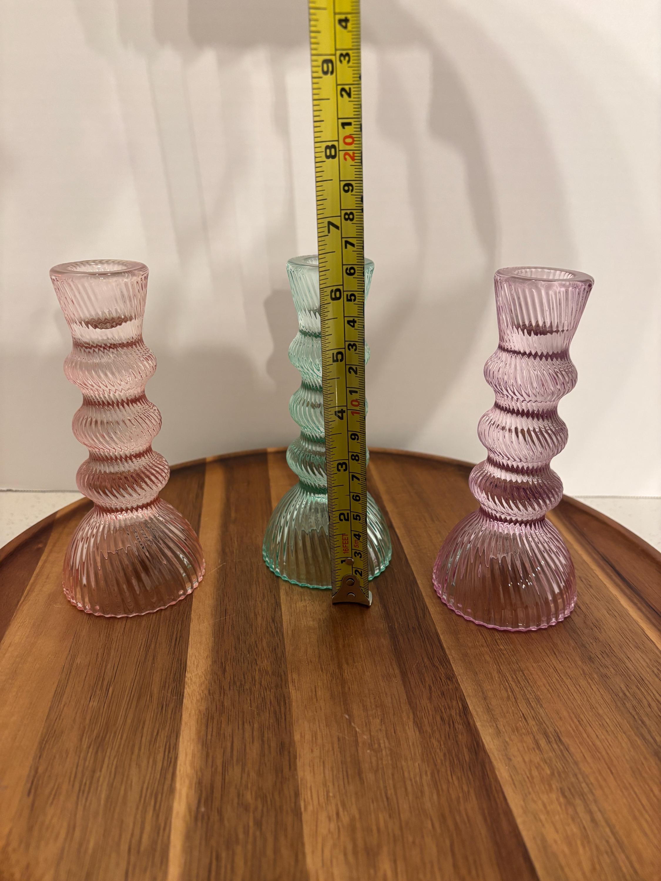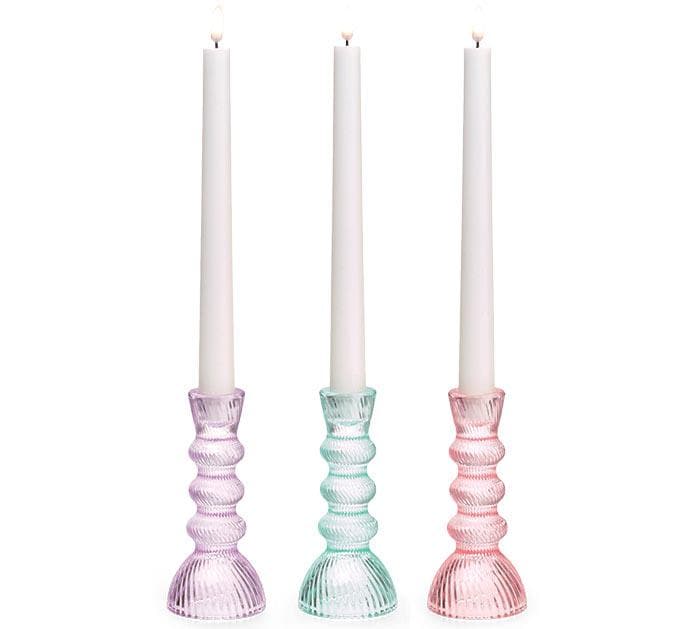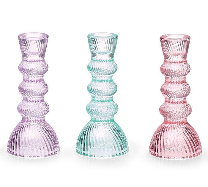 Add soft color and timeless elegance to your décor with these Pressed Ribbed Glass Candleholders. Crafted from beautifully textured pressed glass, each candleholder features a classic ribbed design that catches and reflects light for a warm, inviting glow. Available in soothing shades of pink, blue, and purple, they bring a subtle pop of color to any setting.