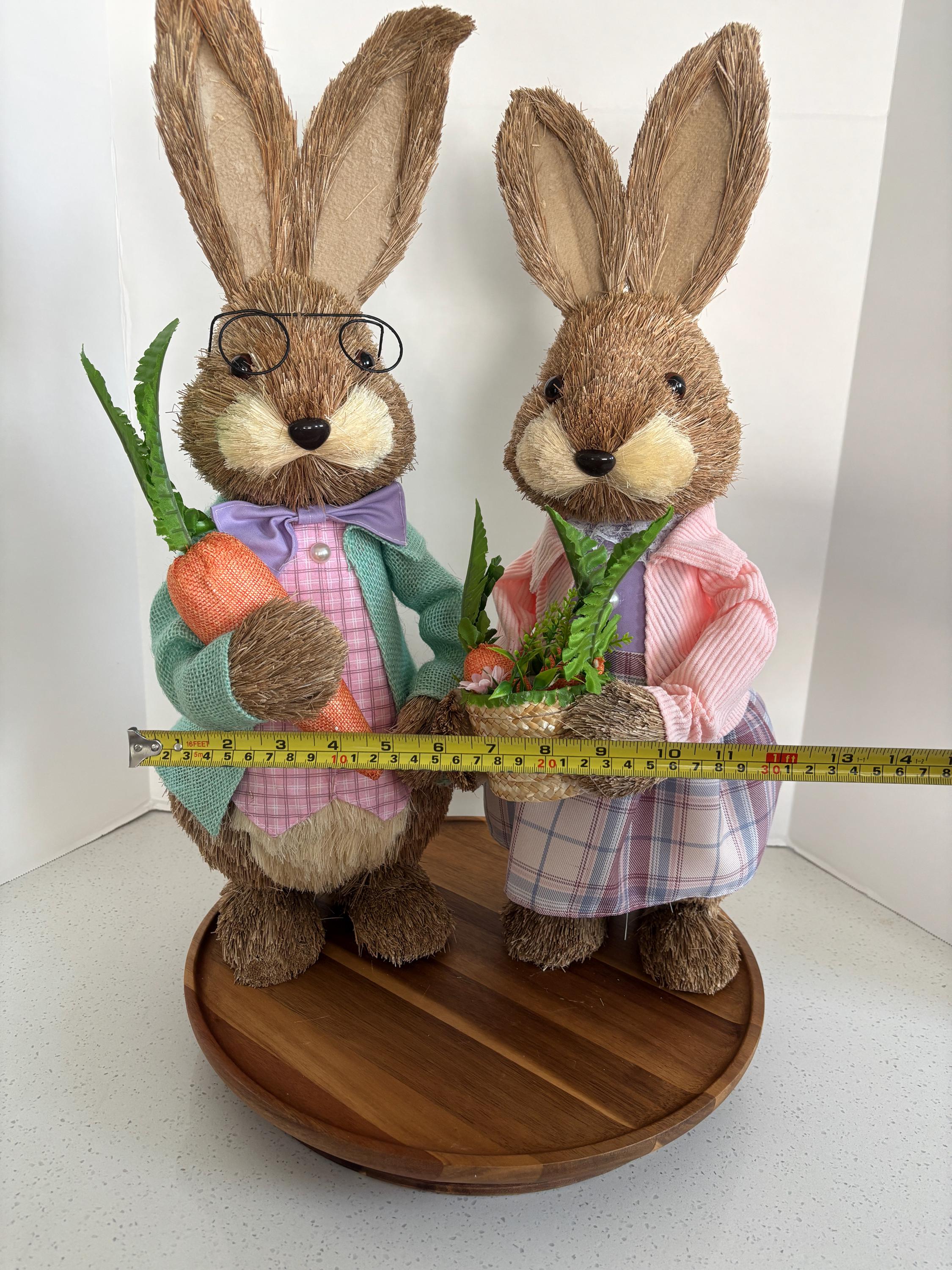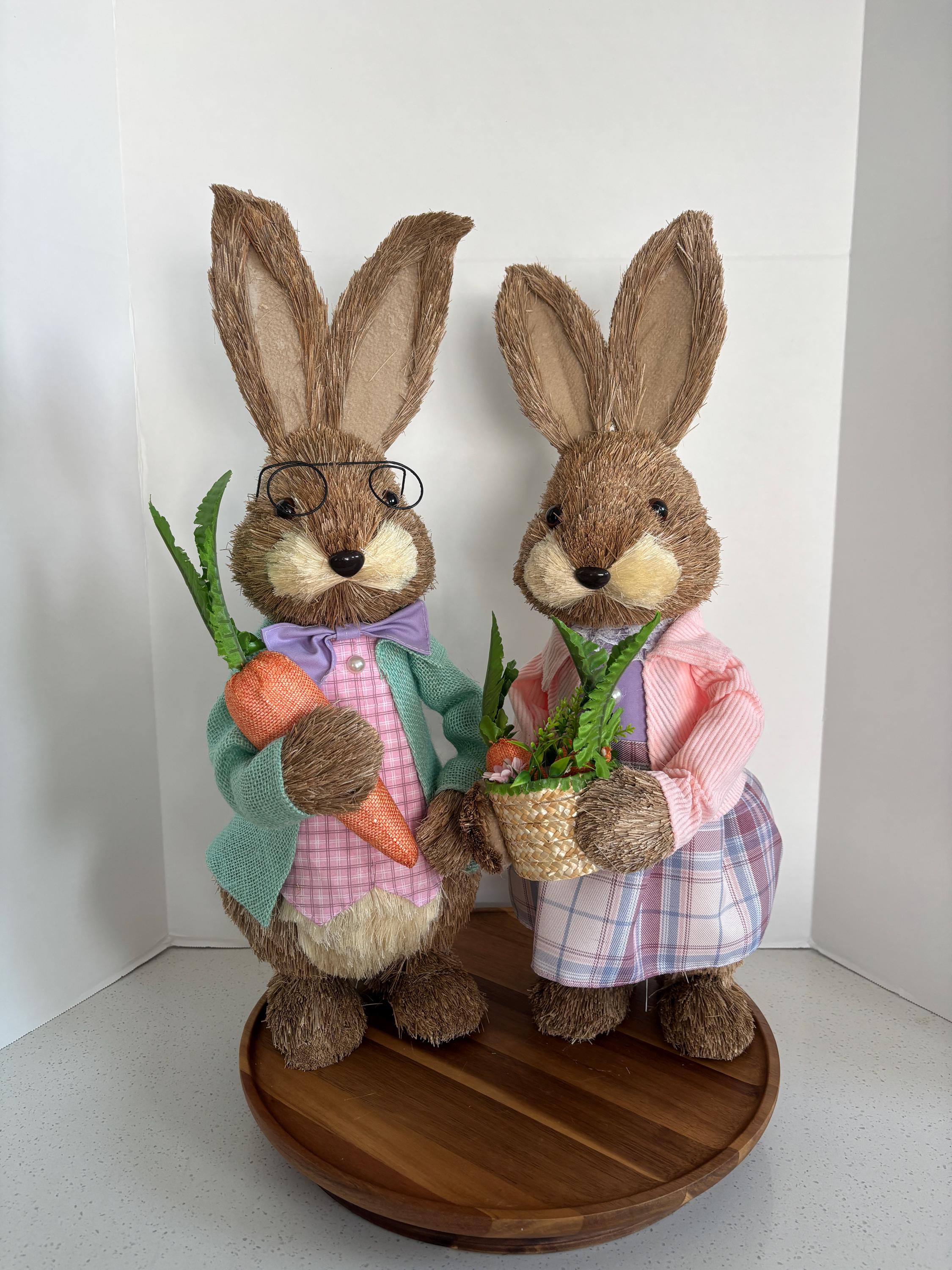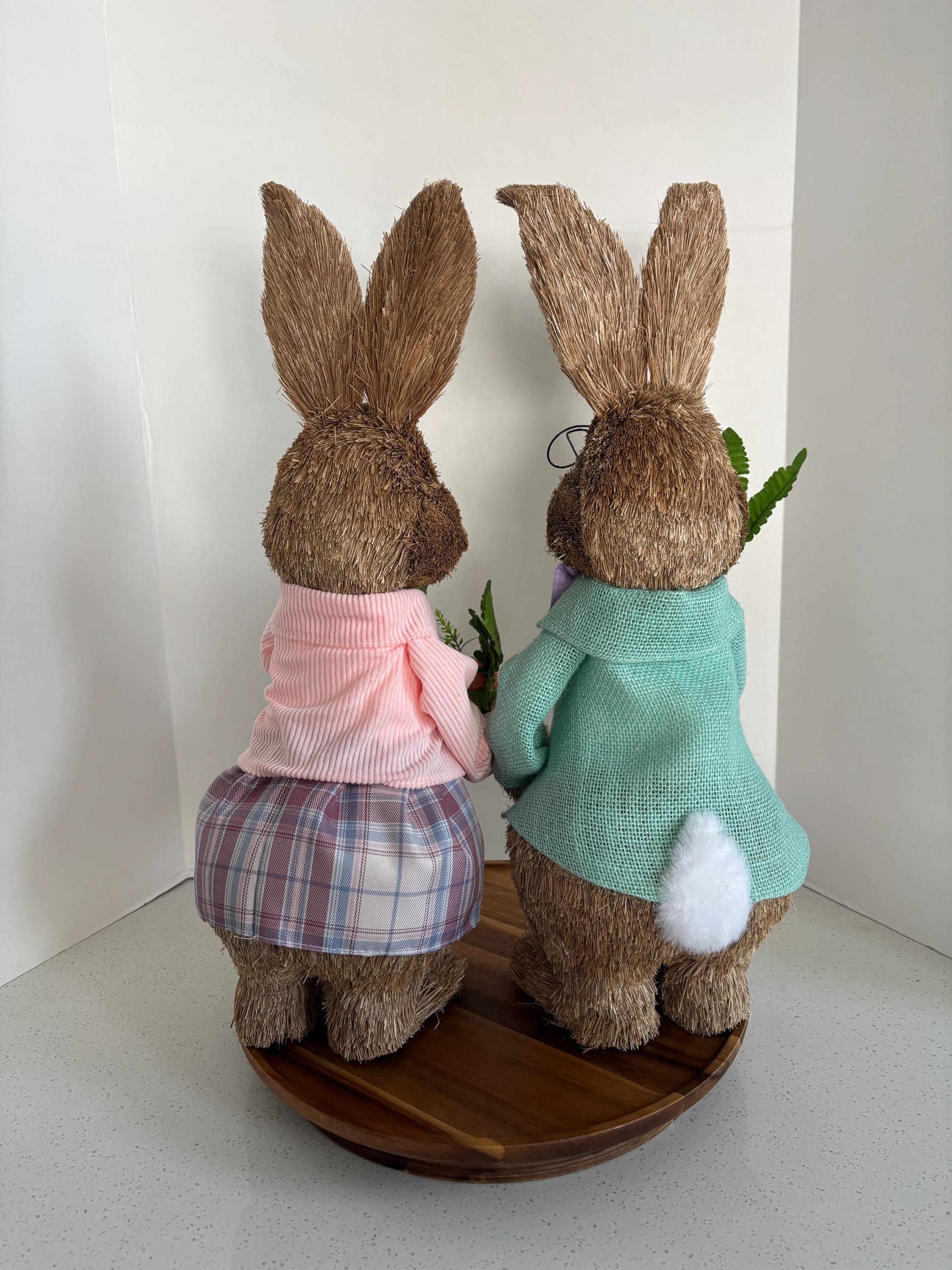 Made from a delightful mix of sisal, fabric, burlap, corn husk, and foam, these bunnies feature a textured, handcrafted look that adds warmth and personality to your Easter décor. Ideal for tabletops, mantels, or festive centerpieces, this bunny couple brings playful charm and springtime joy to any home.