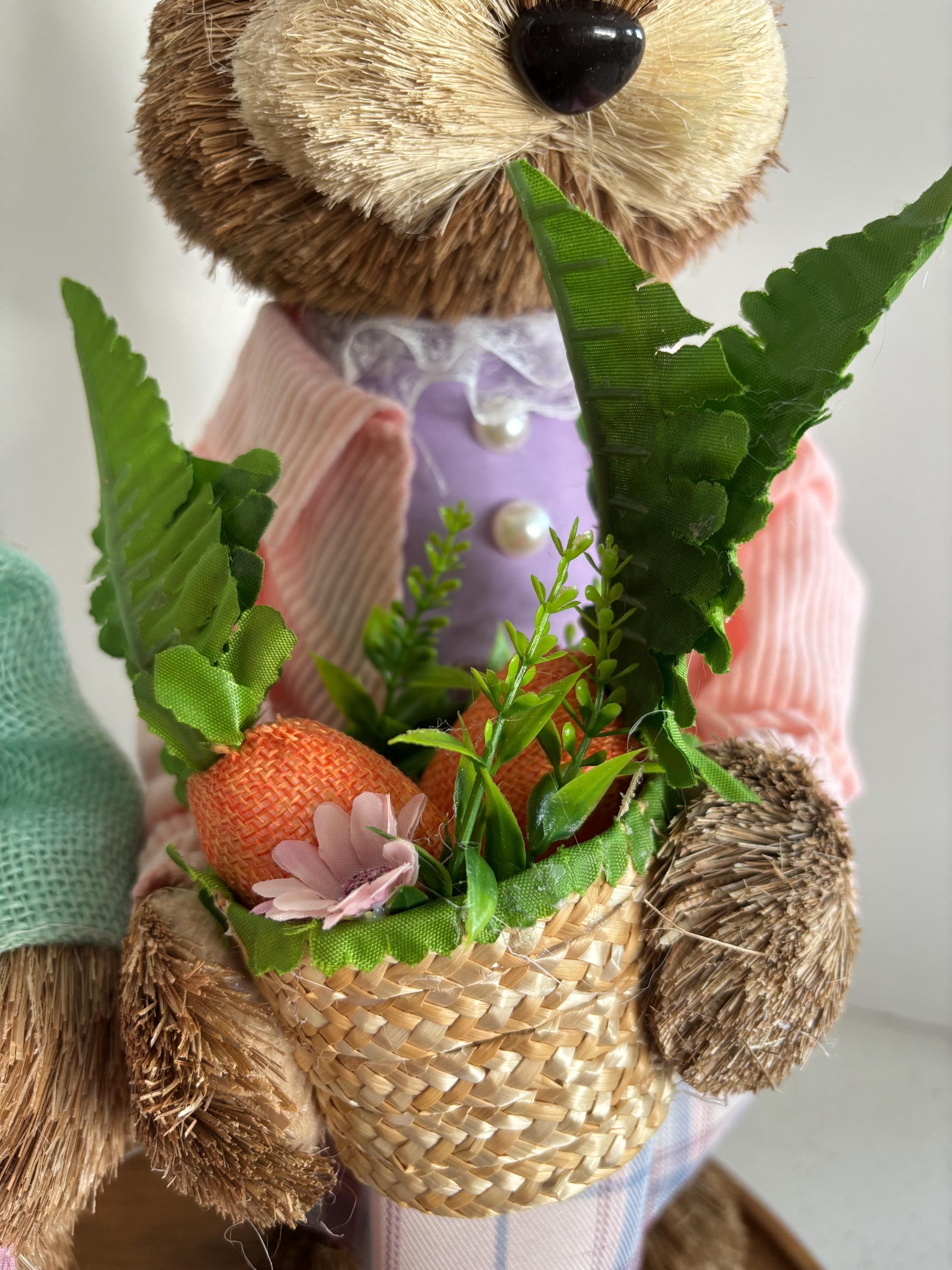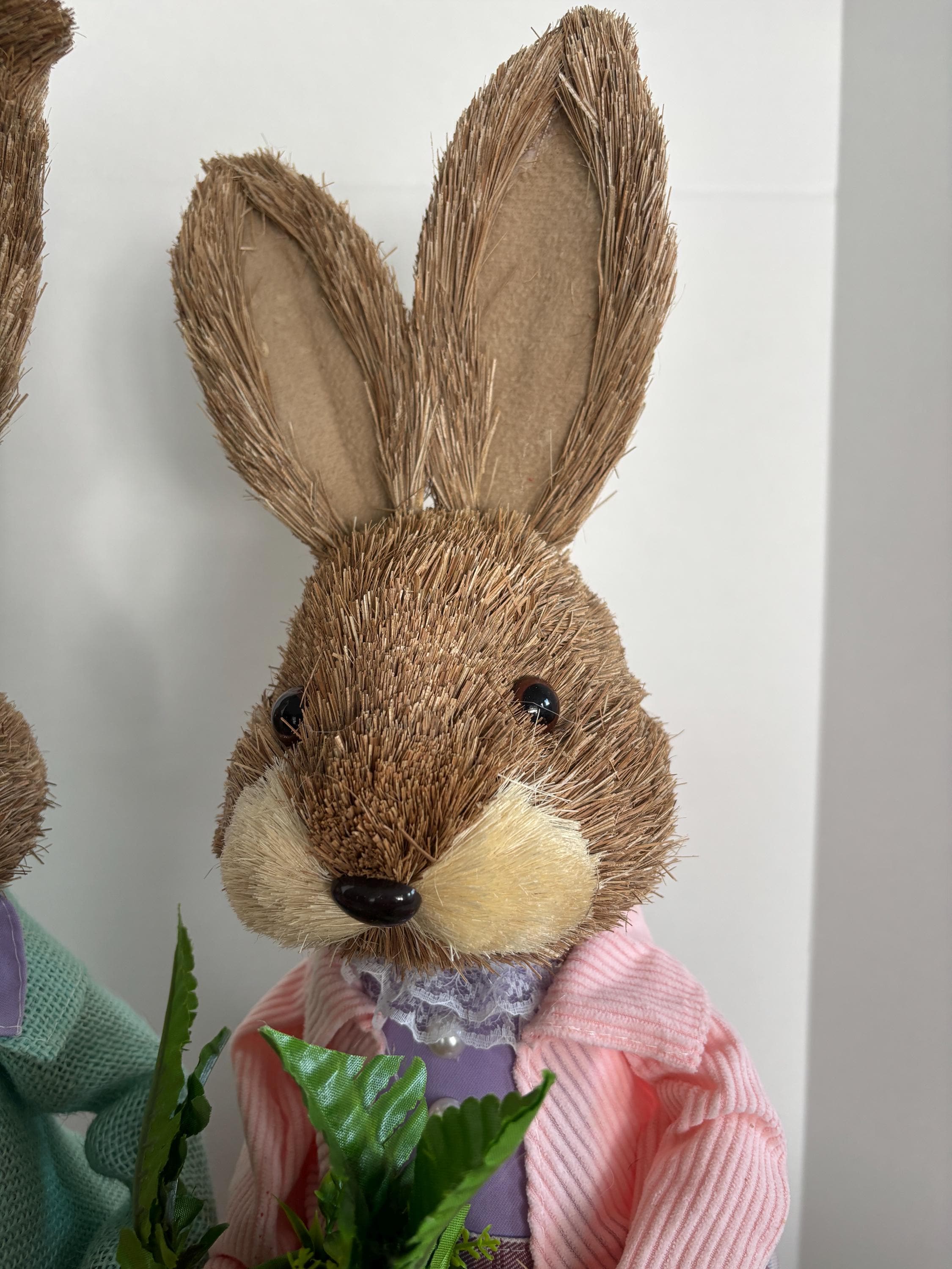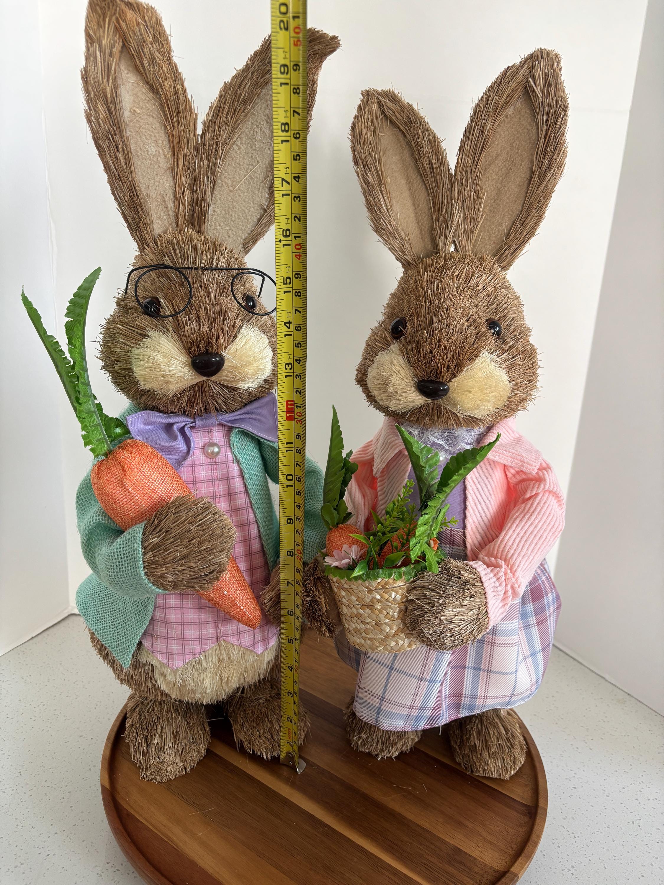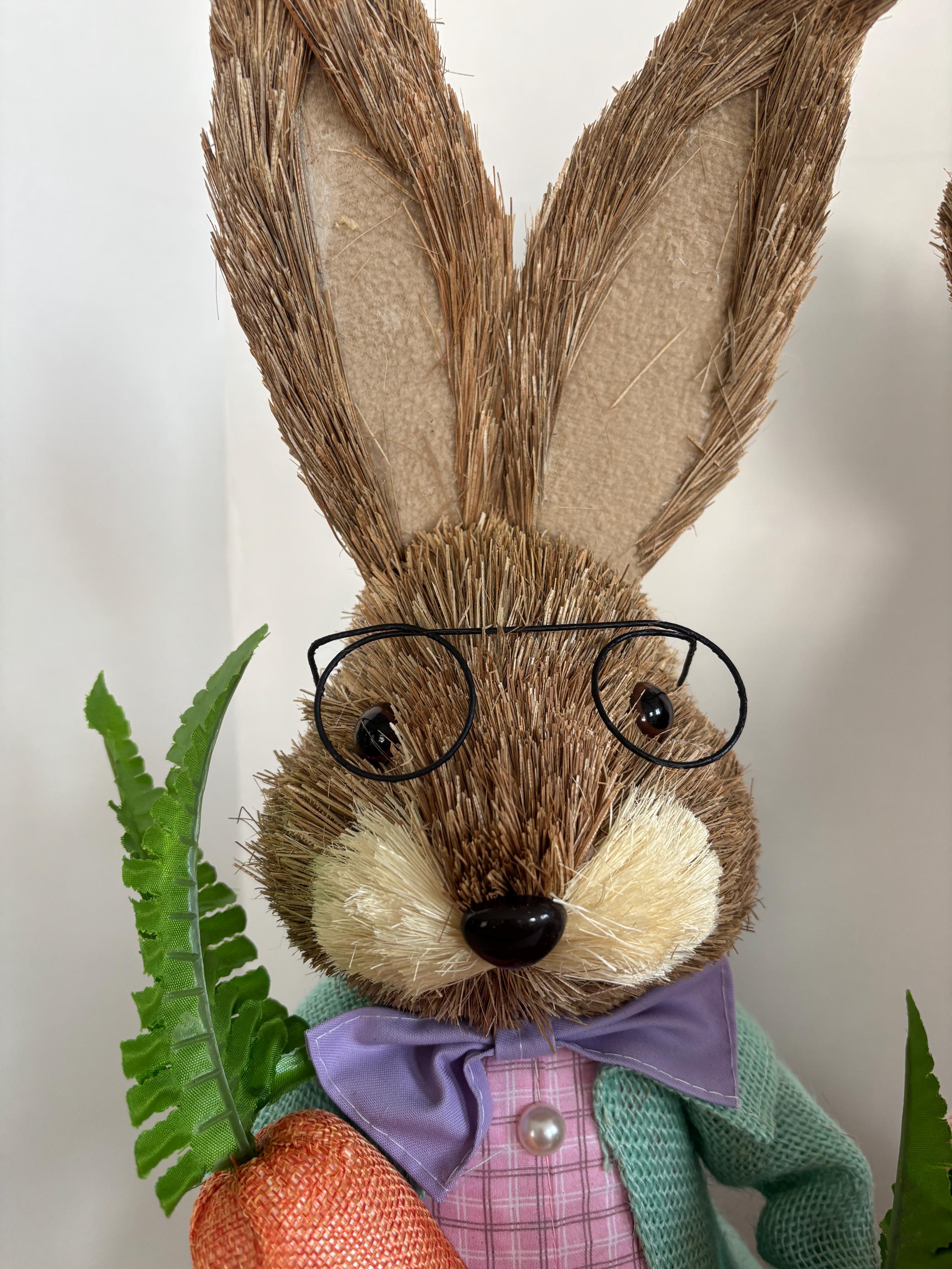 Made from a delightful mix of sisal, fabric, burlap, corn husk, and foam, these bunnies feature a textured, handcrafted look that adds warmth and personality to your Easter décor. Ideal for tabletops, mantels, or festive centerpieces, this bunny couple brings playful charm and springtime joy to any home.