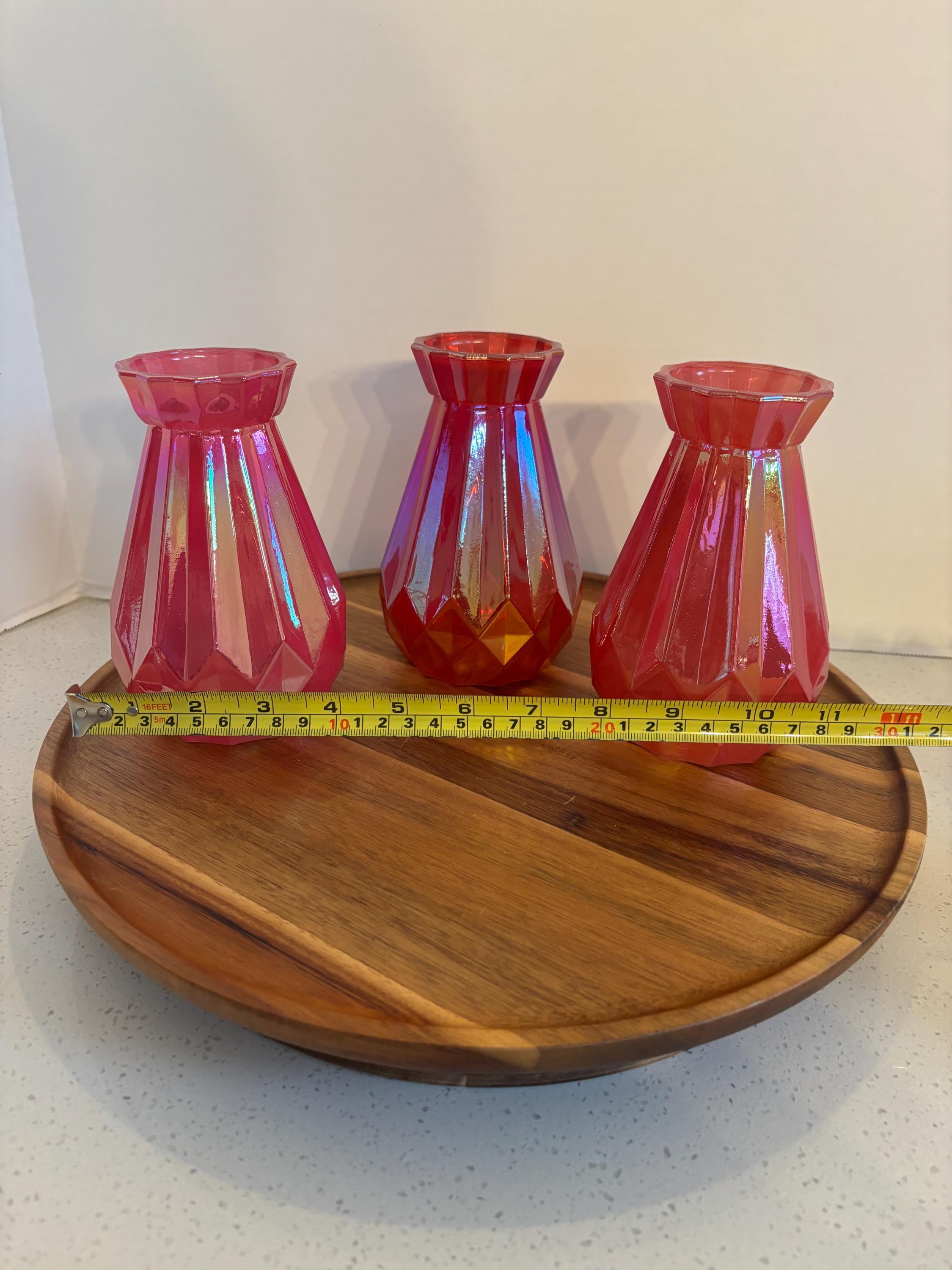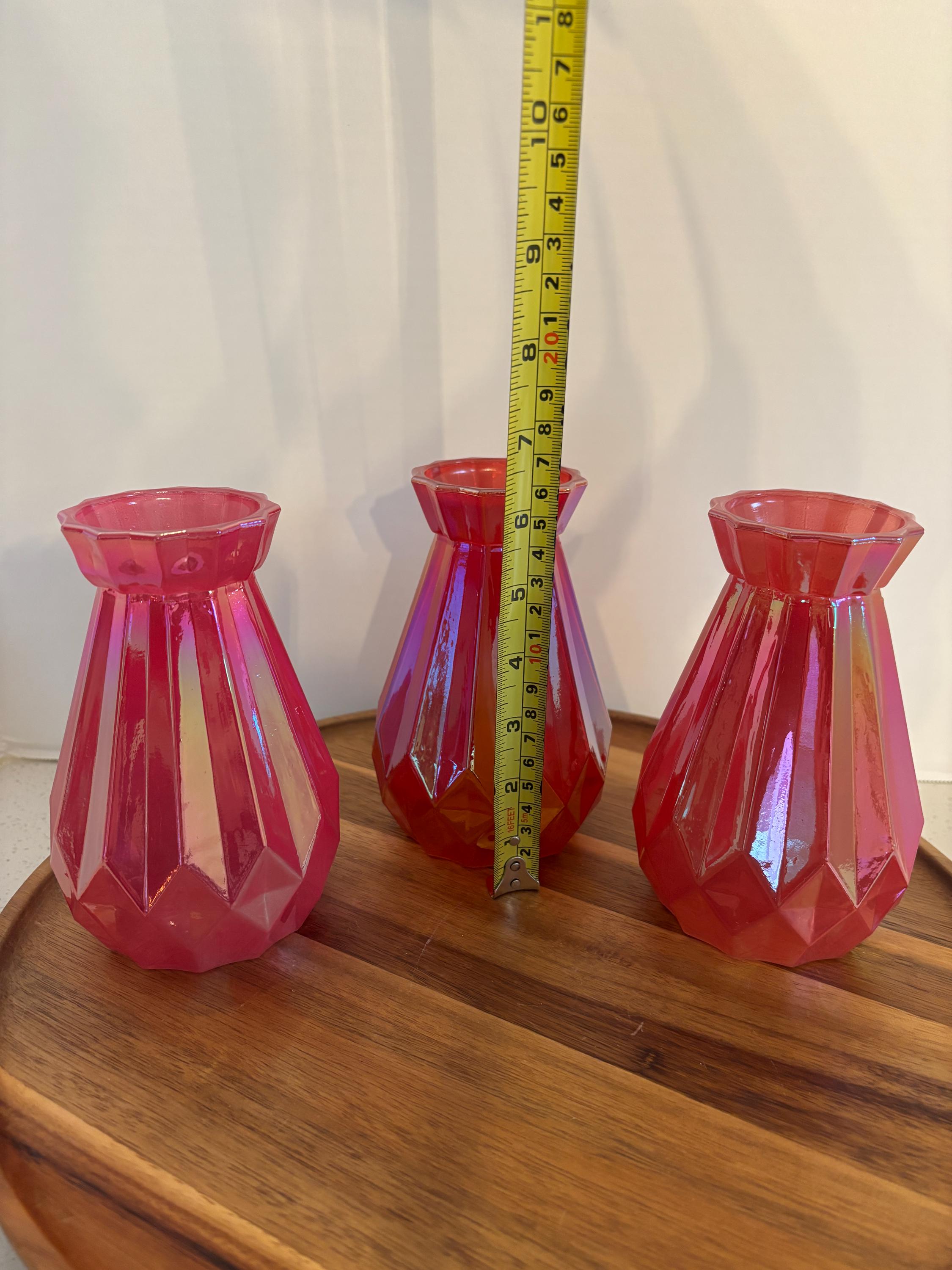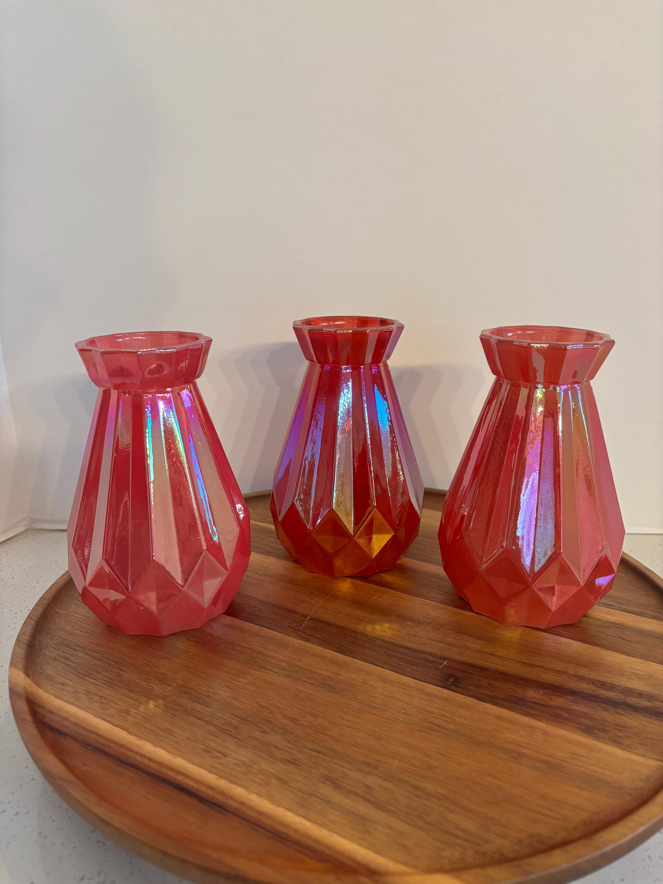 ***Pink, Red, and Dark Red iridescent glass bud vases