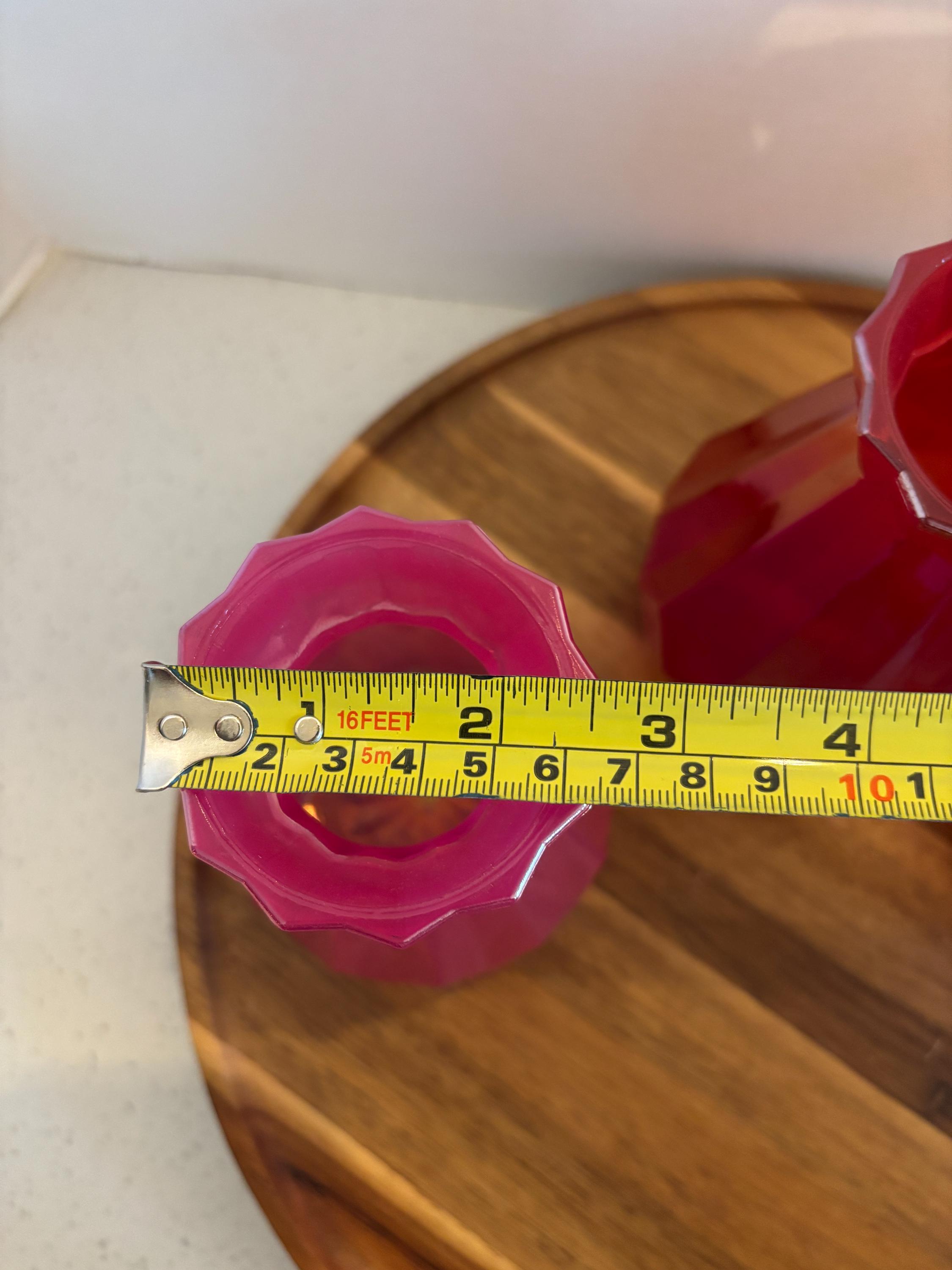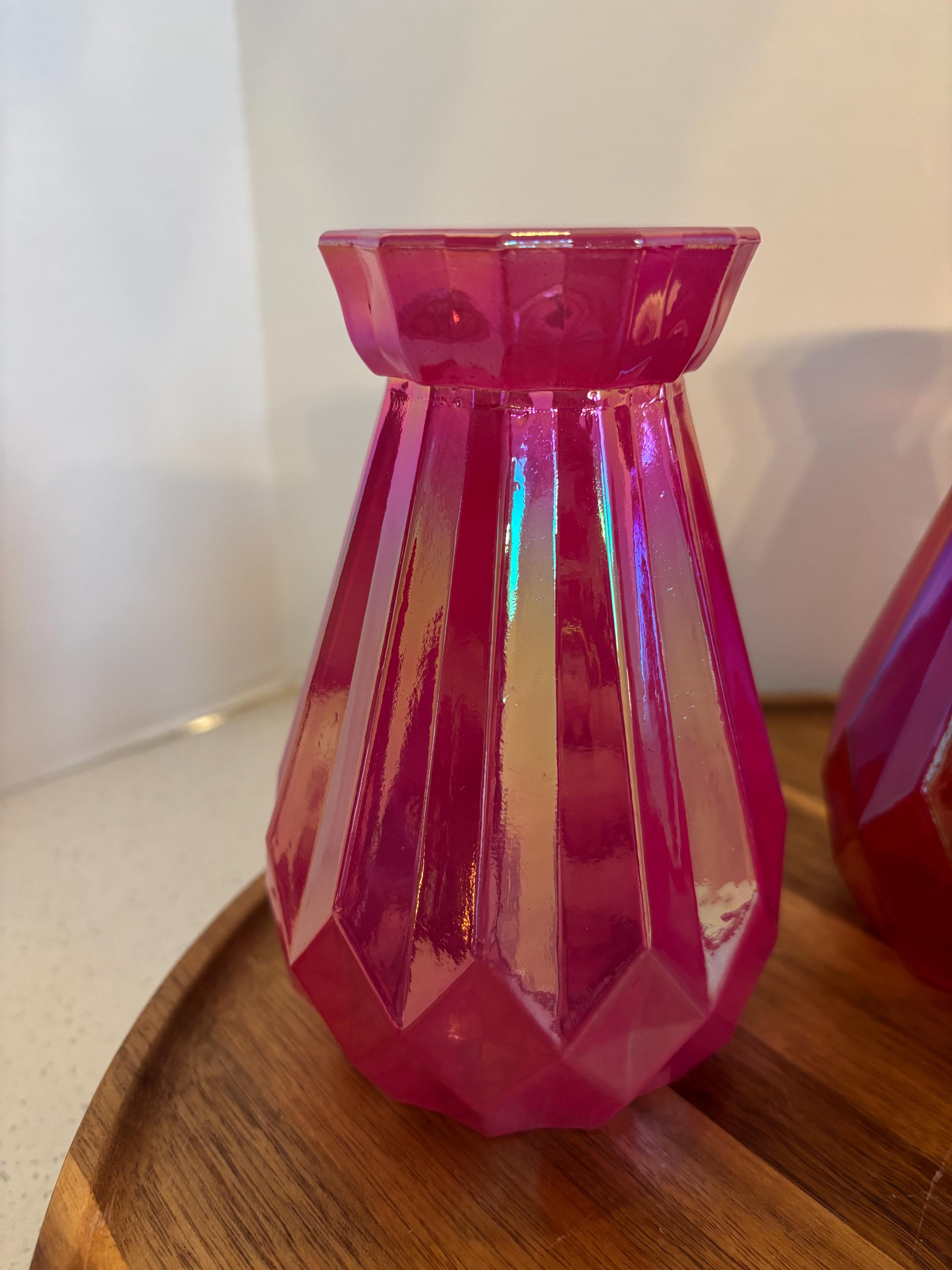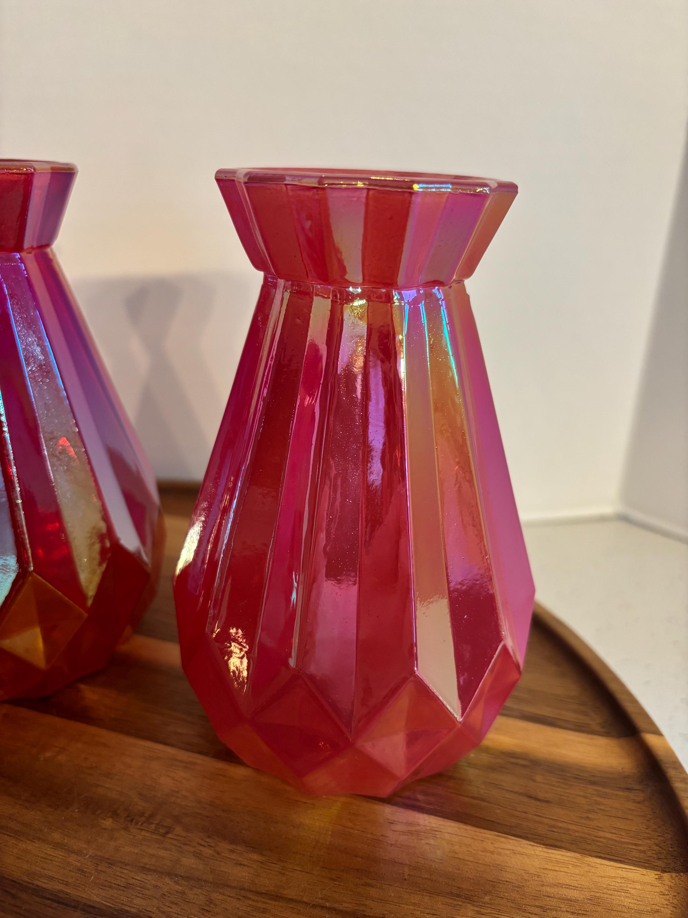 ***Pink, Red, and Dark Red iridescent glass bud vases