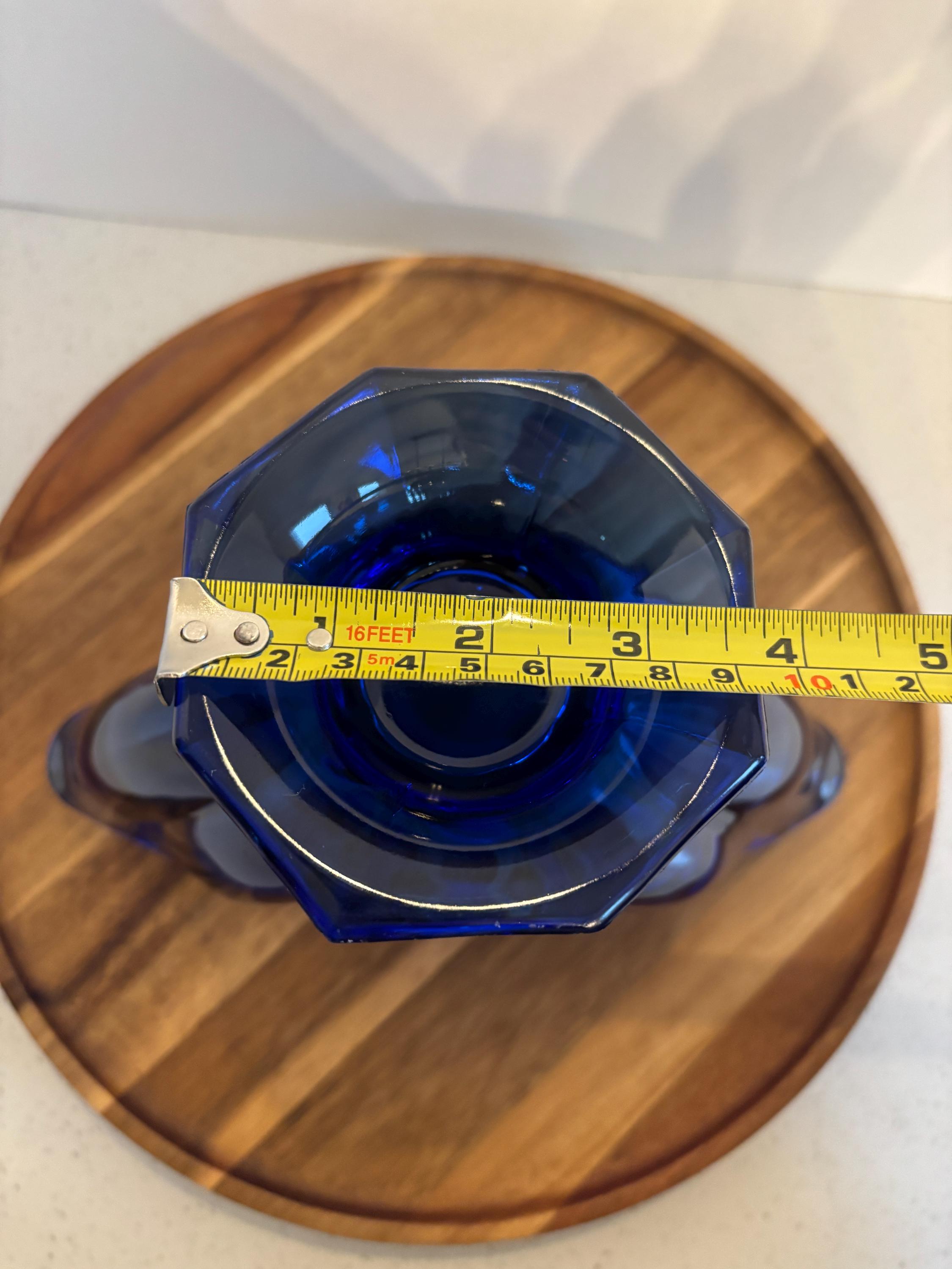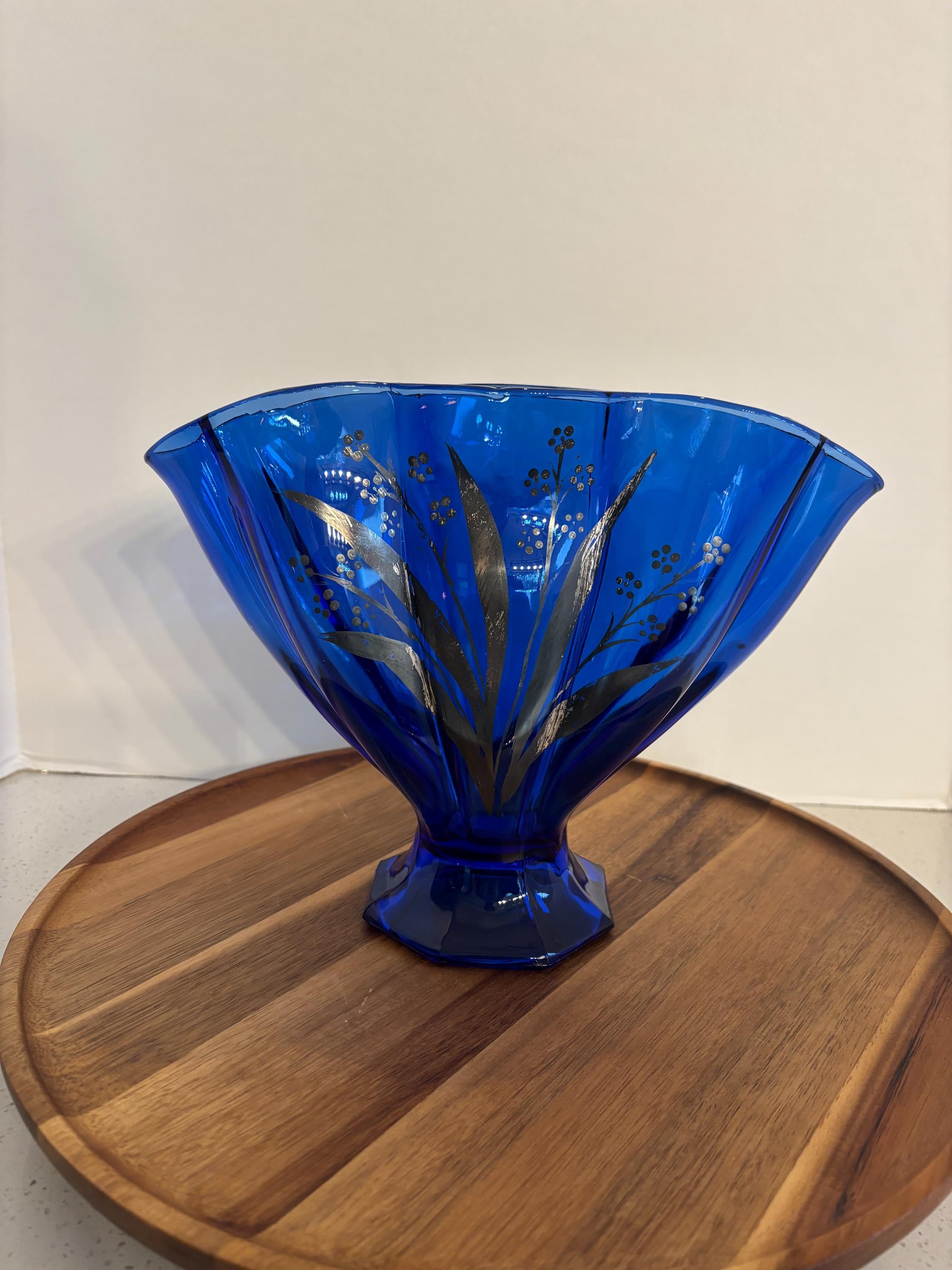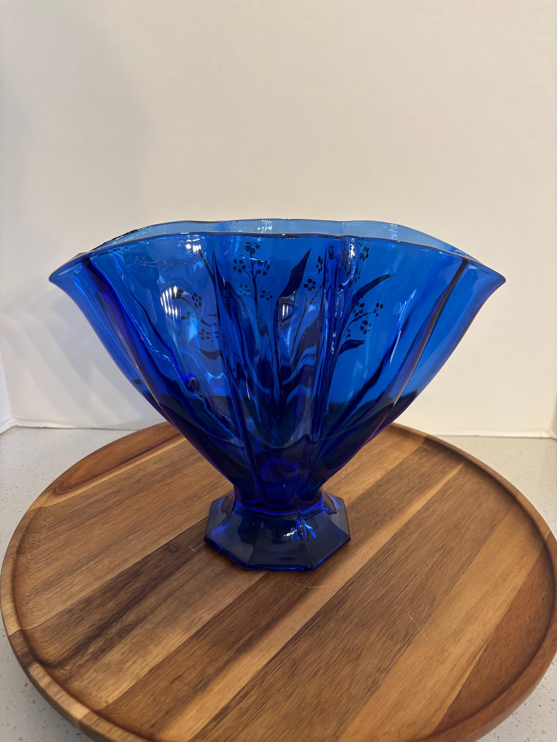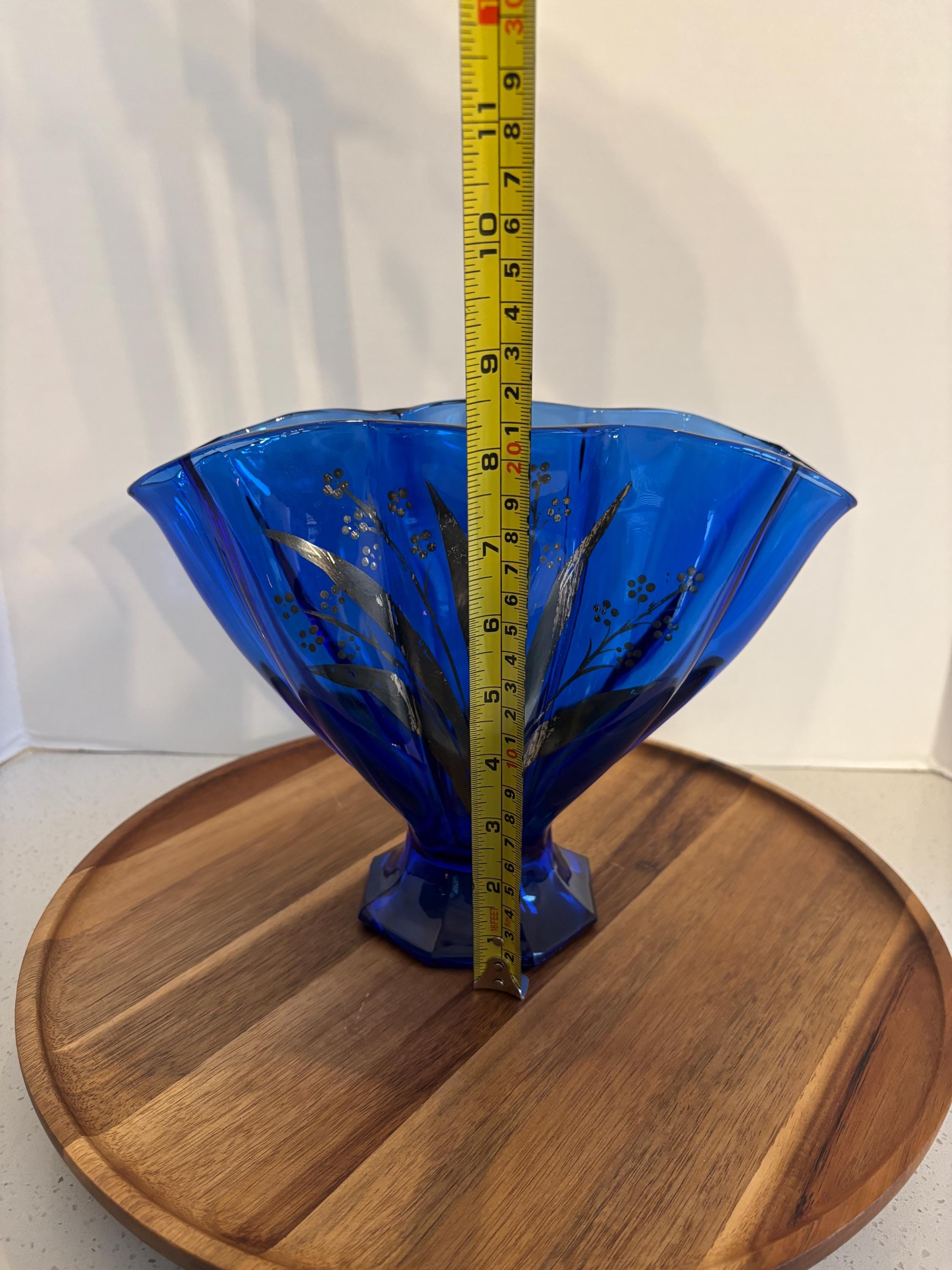 Add bold mid-century elegance to your space with this stunning Vintage Fenton Cobalt Blue Fan Vase featuring delicate hand-applied silver overlay. This eye-catching piece showcases a dramatic flared fan shape with a faceted pedestal base, crafted in rich cobalt blue glass. The silver floral and foliage detailing is beautifully applied by hand, creating a striking contrast against the deep blue background. The reflective silver accents give the vase a glamorous, art glass appeal that instantly elevates any room.