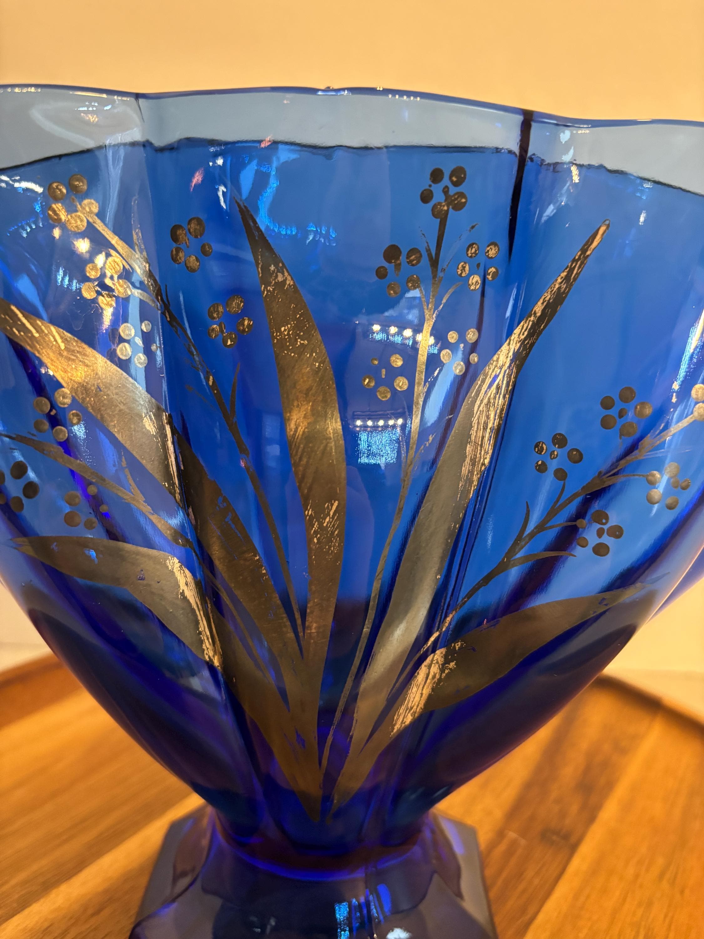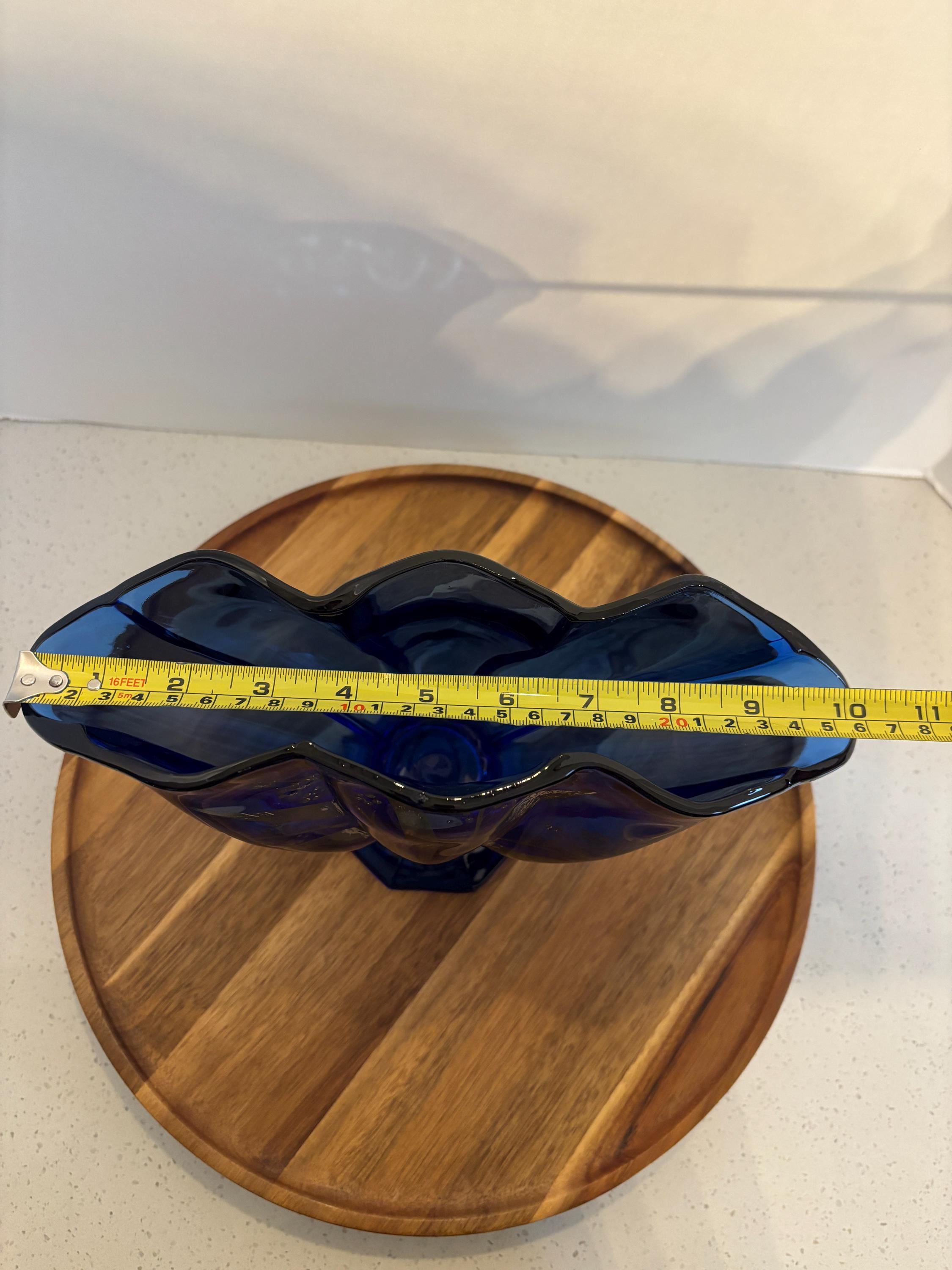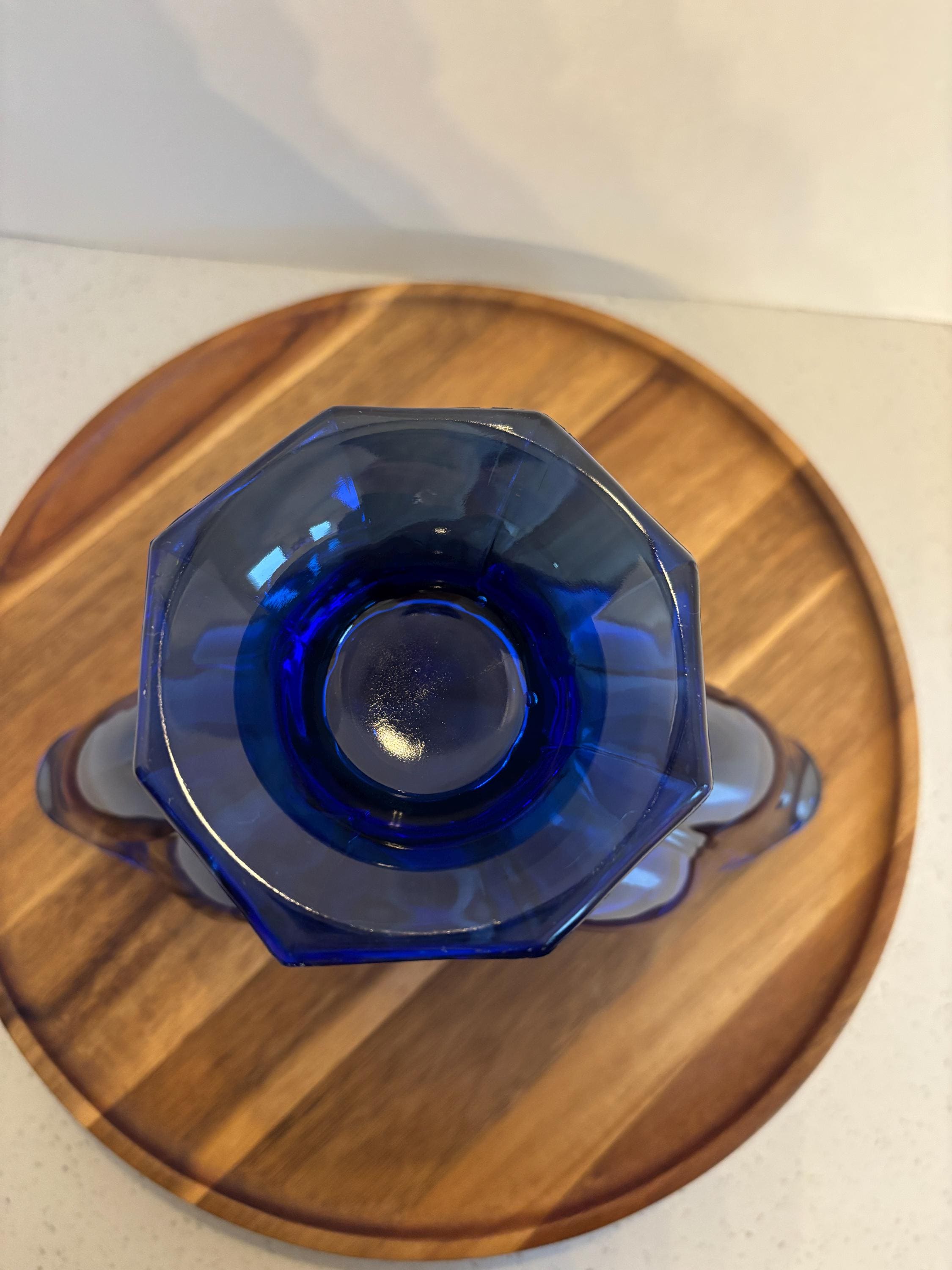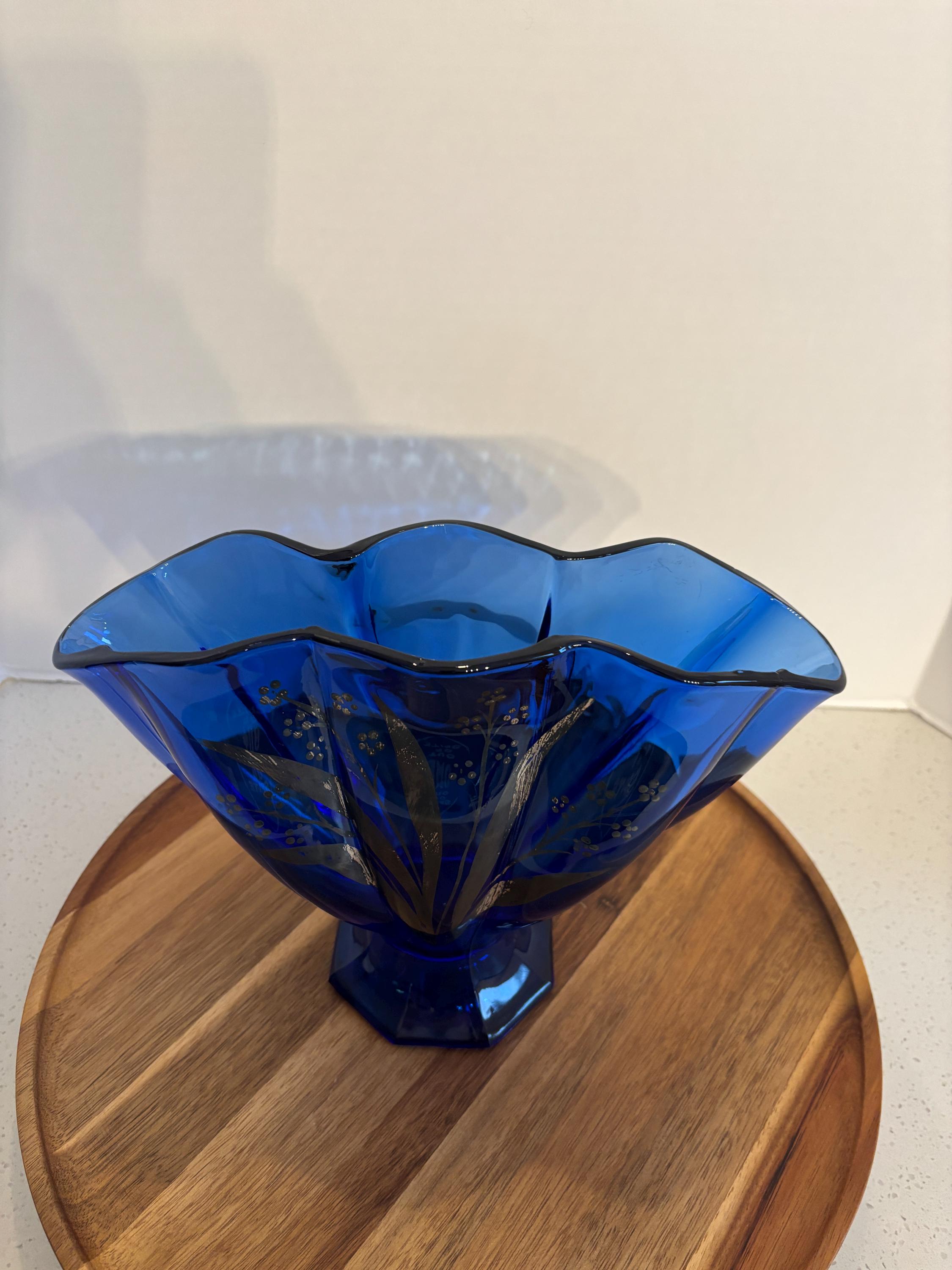 Add bold mid-century elegance to your space with this stunning Vintage Fenton Cobalt Blue Fan Vase featuring delicate hand-applied silver overlay. This eye-catching piece showcases a dramatic flared fan shape with a faceted pedestal base, crafted in rich cobalt blue glass. The silver floral and foliage detailing is beautifully applied by hand, creating a striking contrast against the deep blue background. The reflective silver accents give the vase a glamorous, art glass appeal that instantly elevates any room.