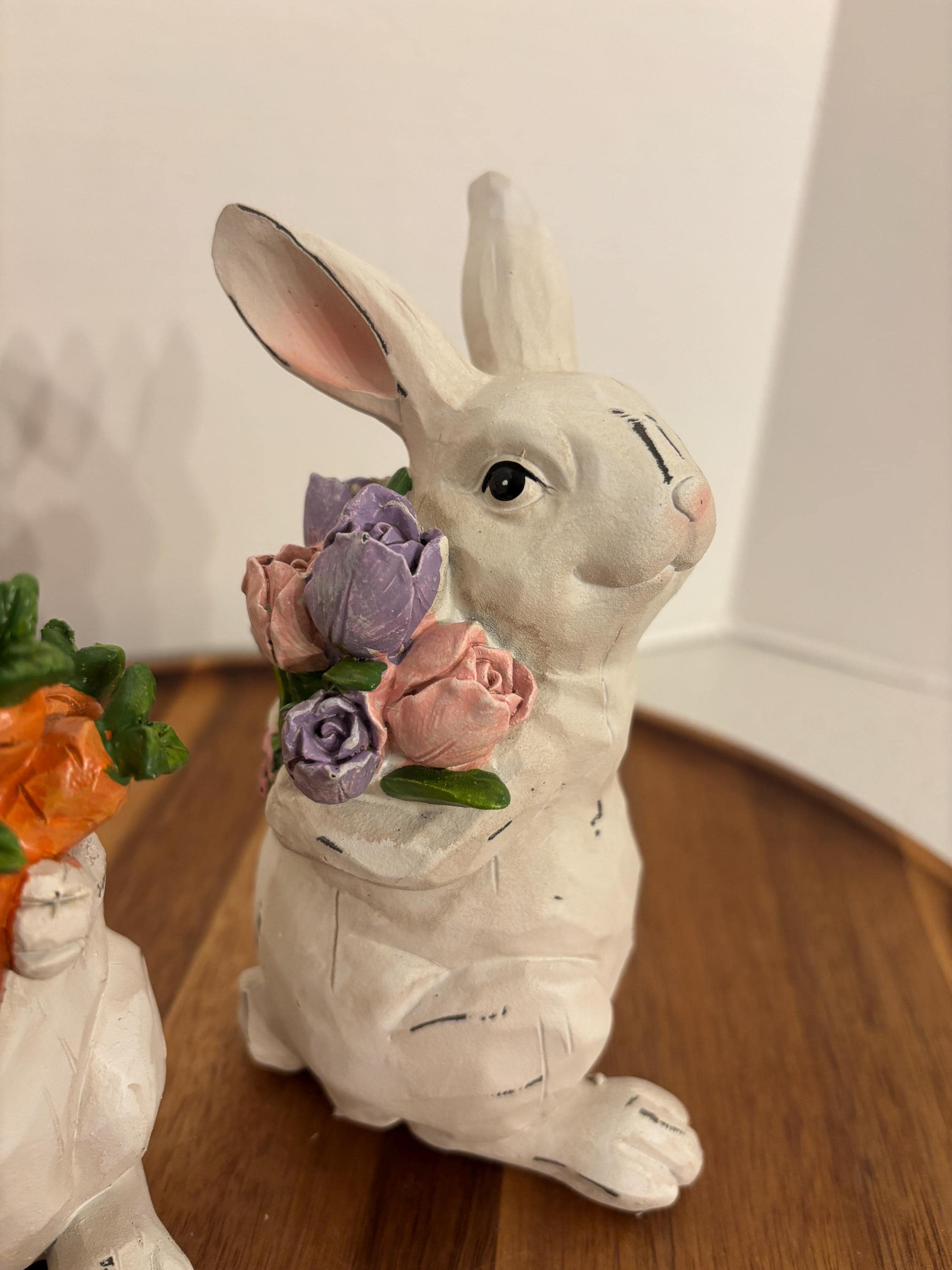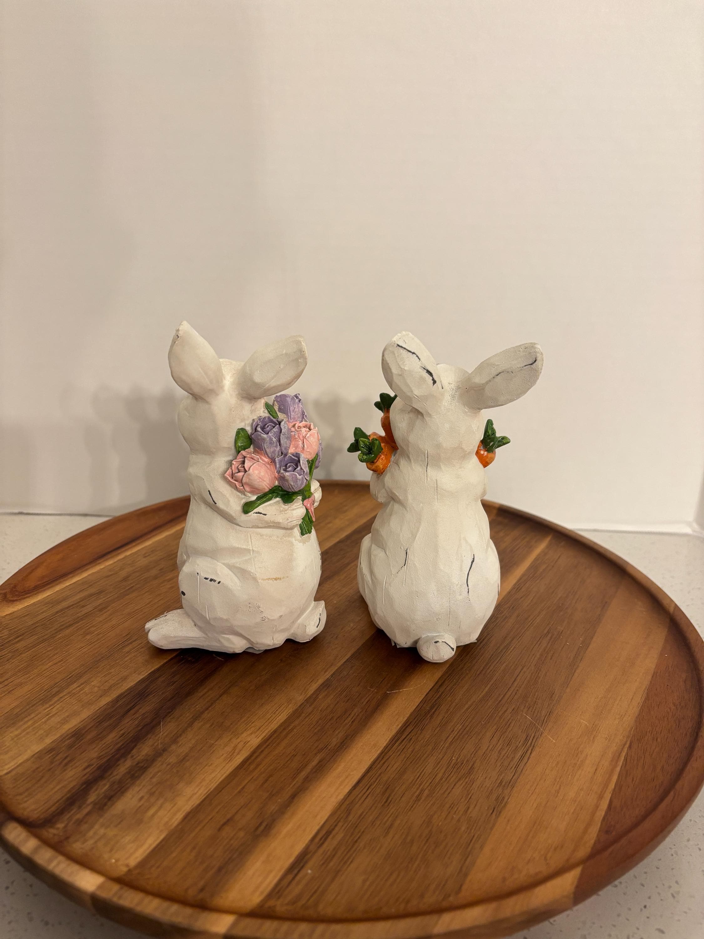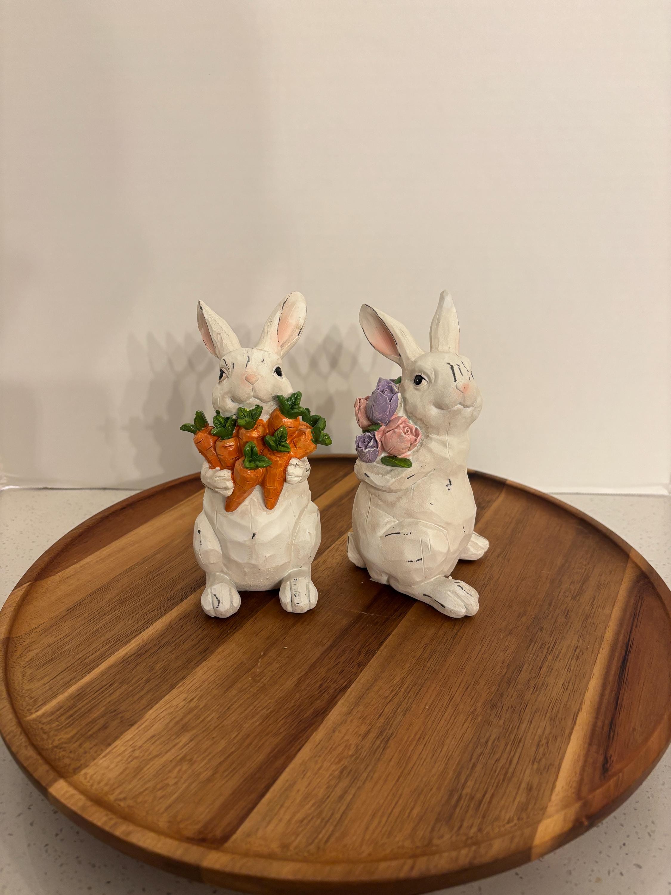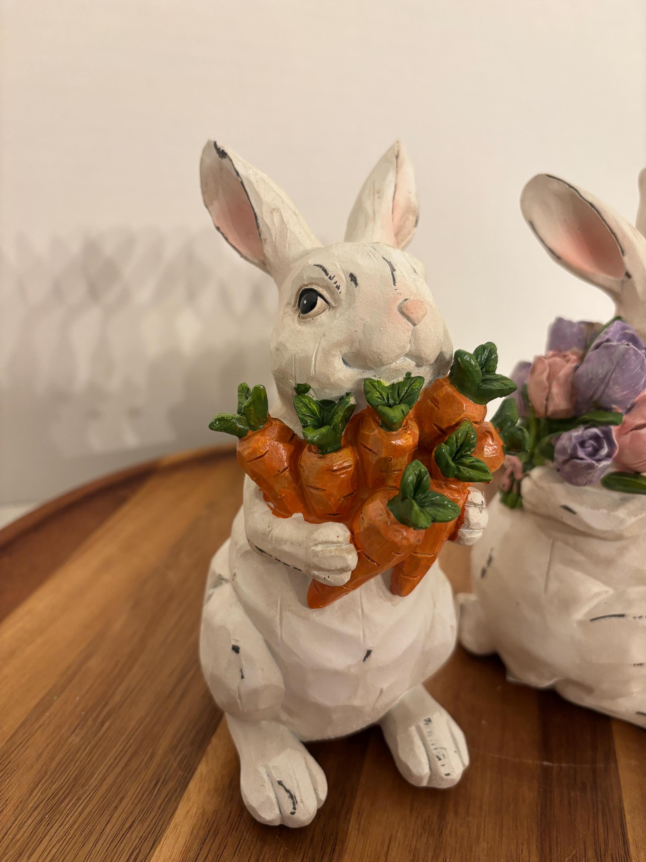 The white bunnies are holding a bouquets filled with vibrant purple and pink flowers, while the other proudly carries a bunch of fresh carrots. Their bright details and gentle expressions capture the joyful spirit of spring, making them perfect for Easter displays, garden-themed décor, or everyday seasonal accents.