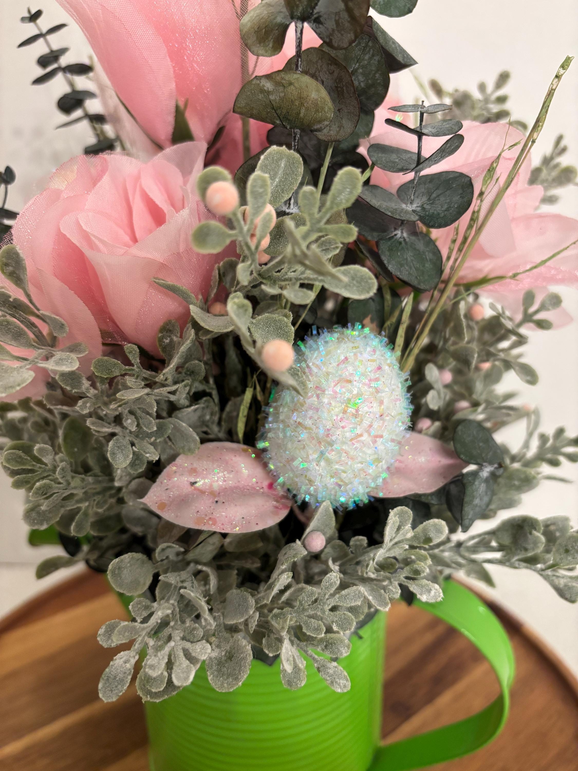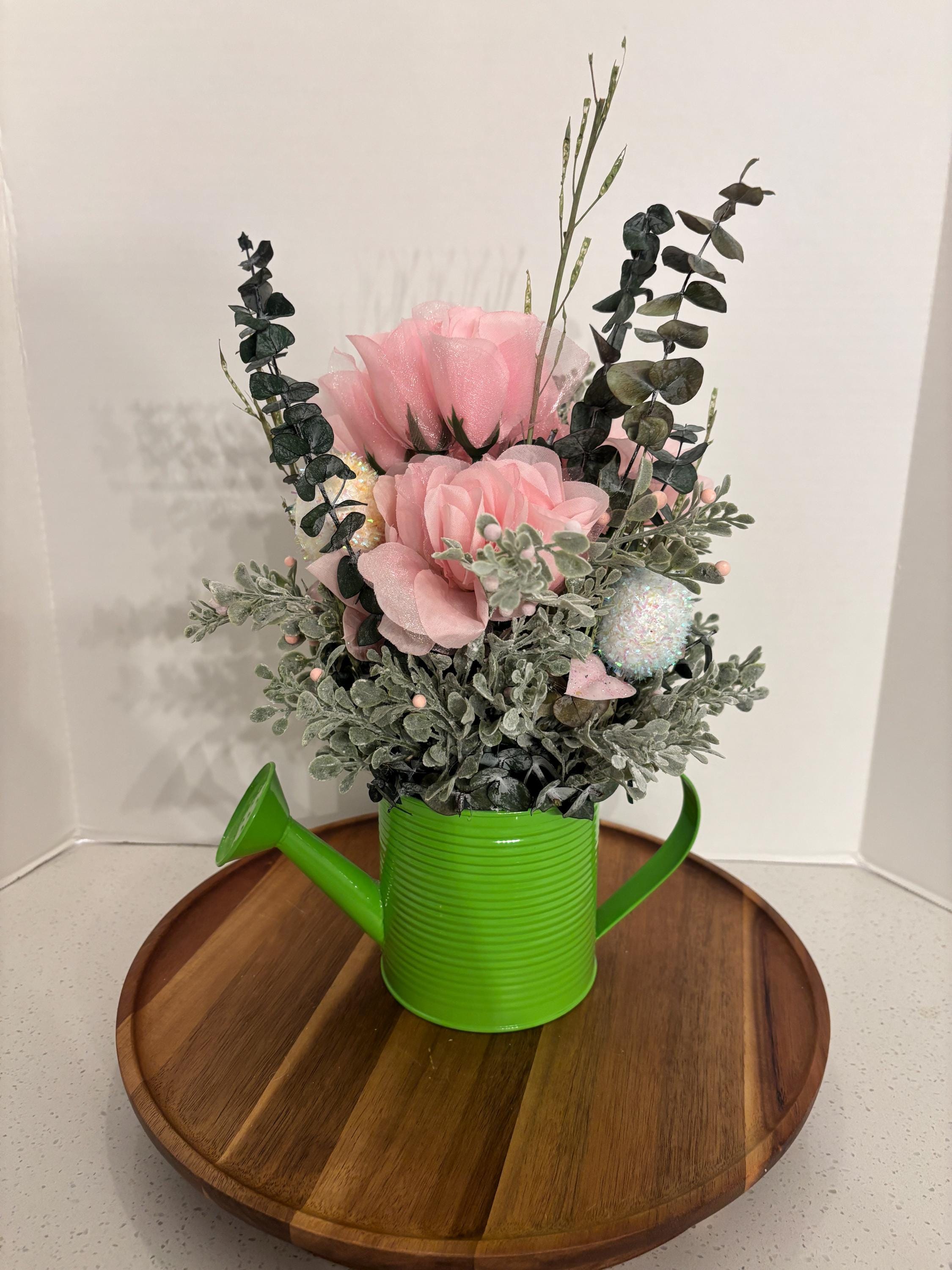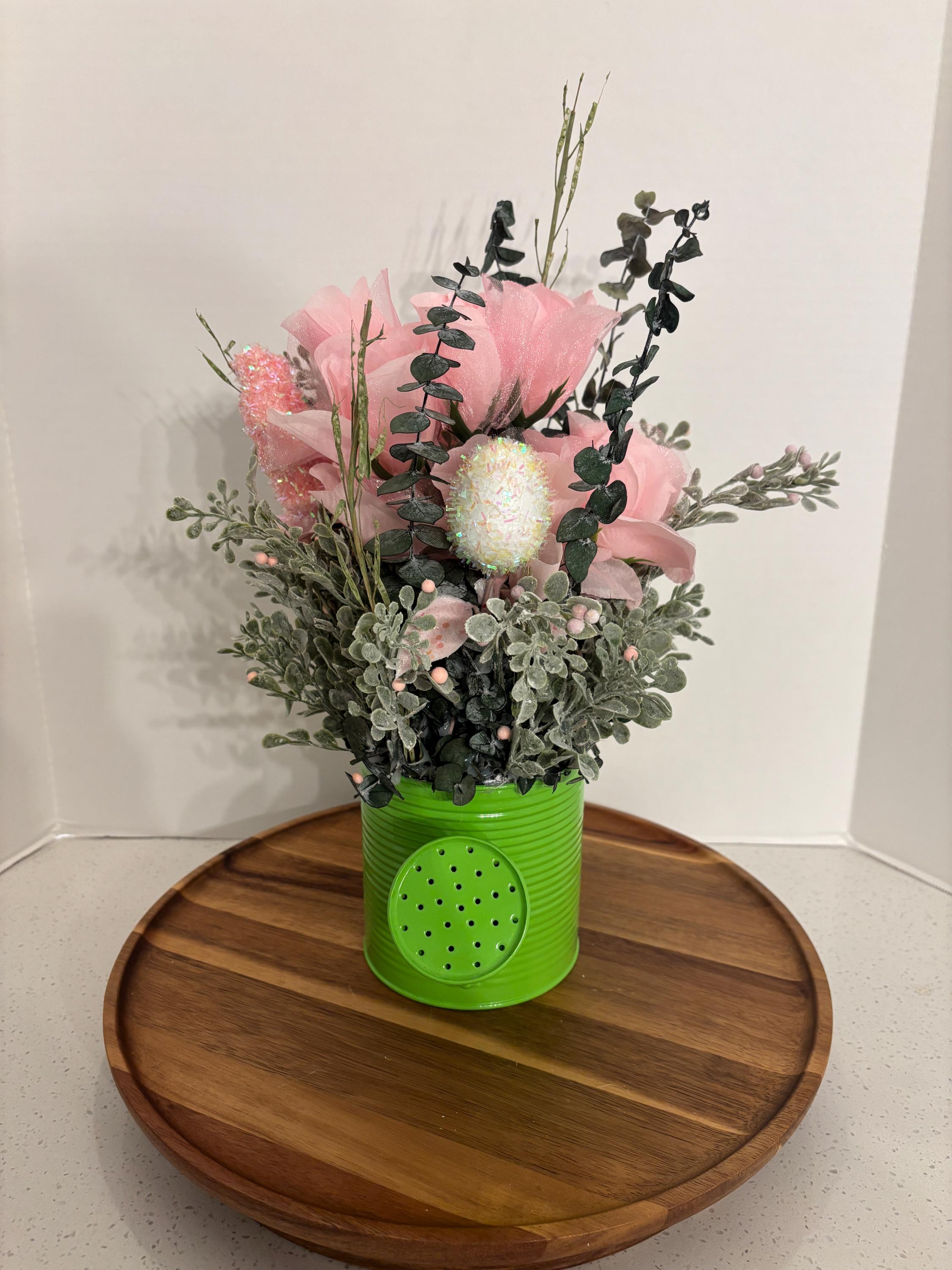 ***Floral arrangement of pink flowers surrounded with greenery and assorted Easter eggs. Set in a 6” green tin watering can planter that is also reusable.