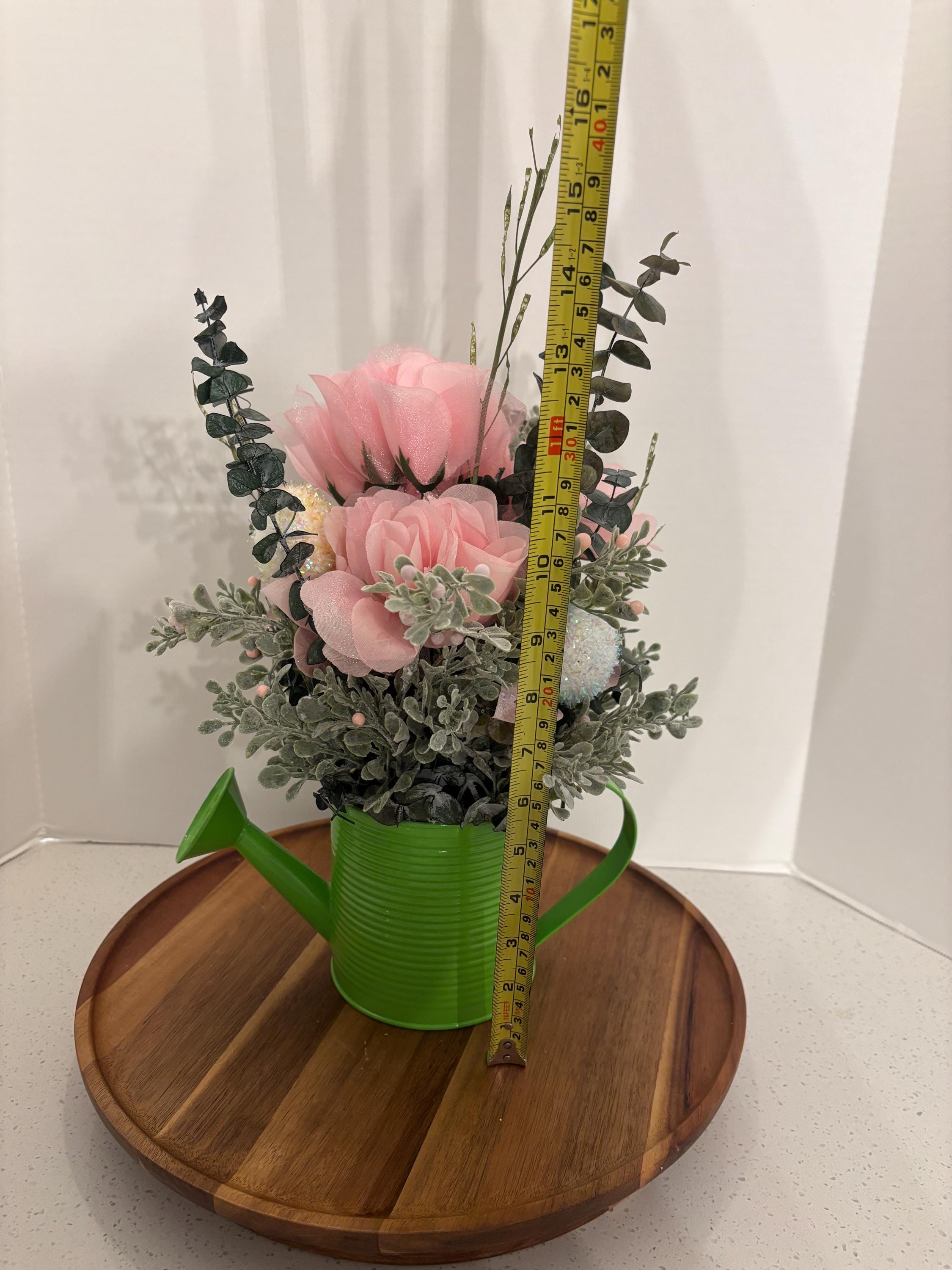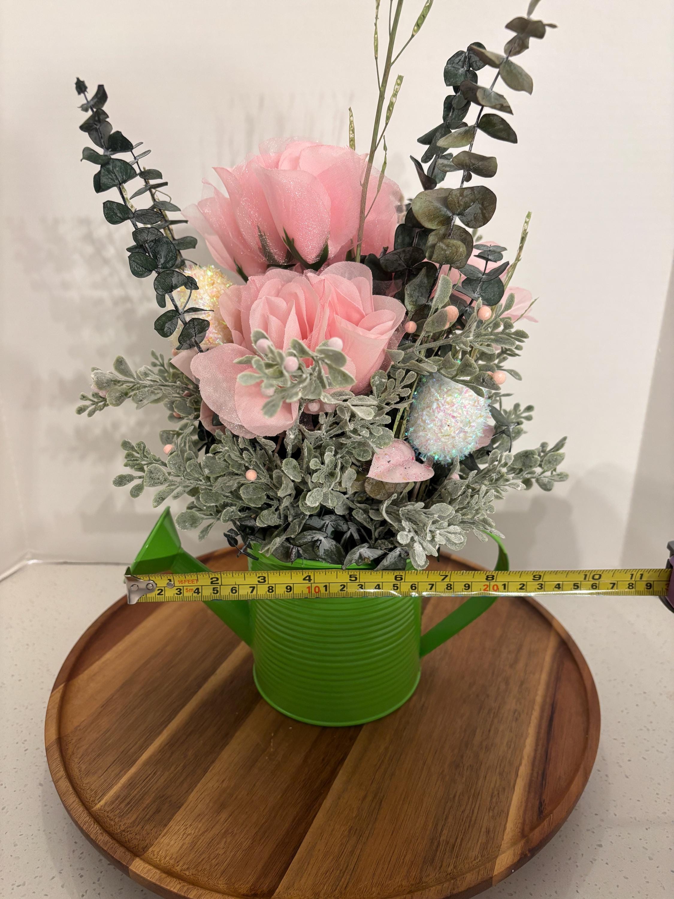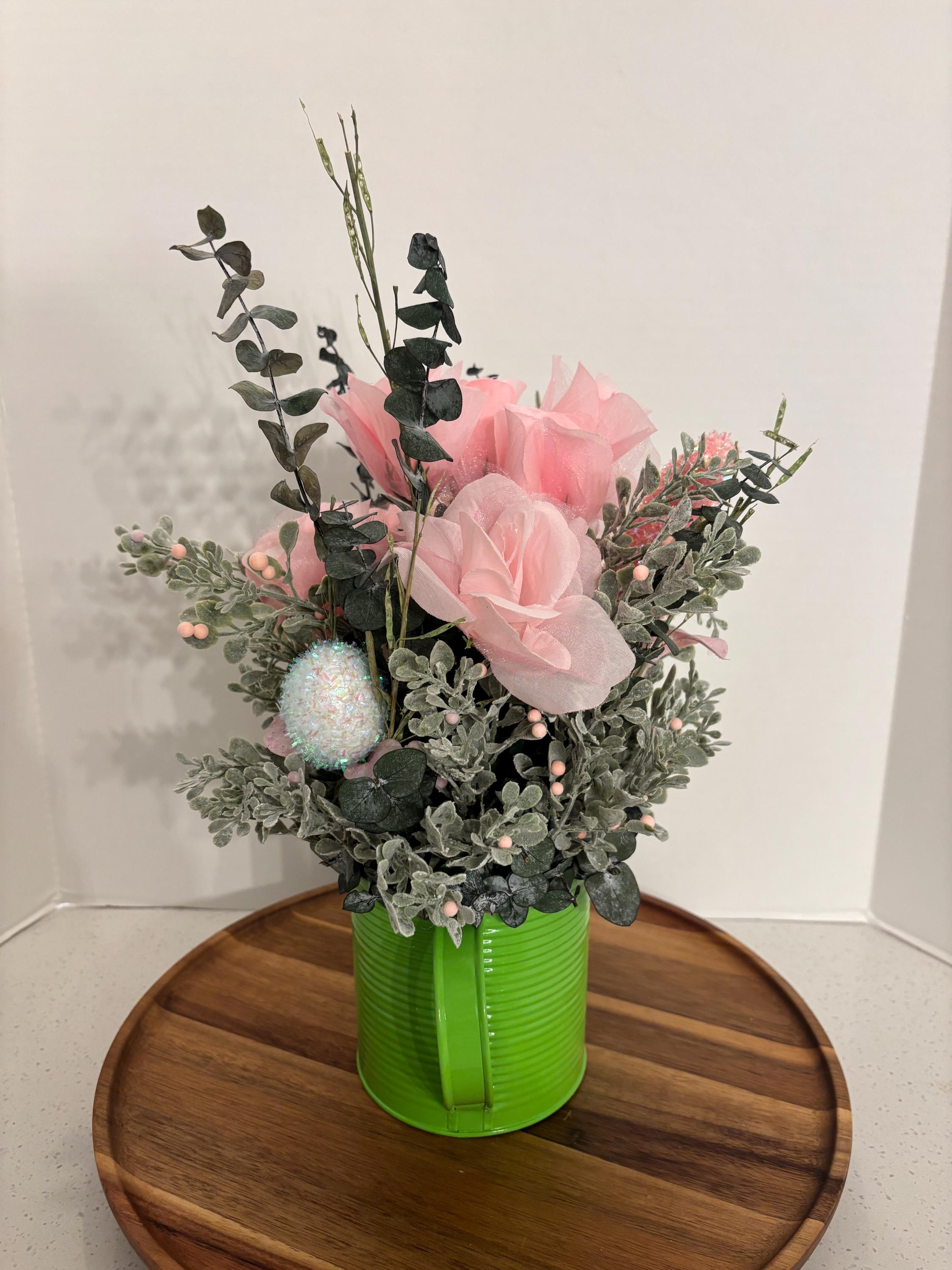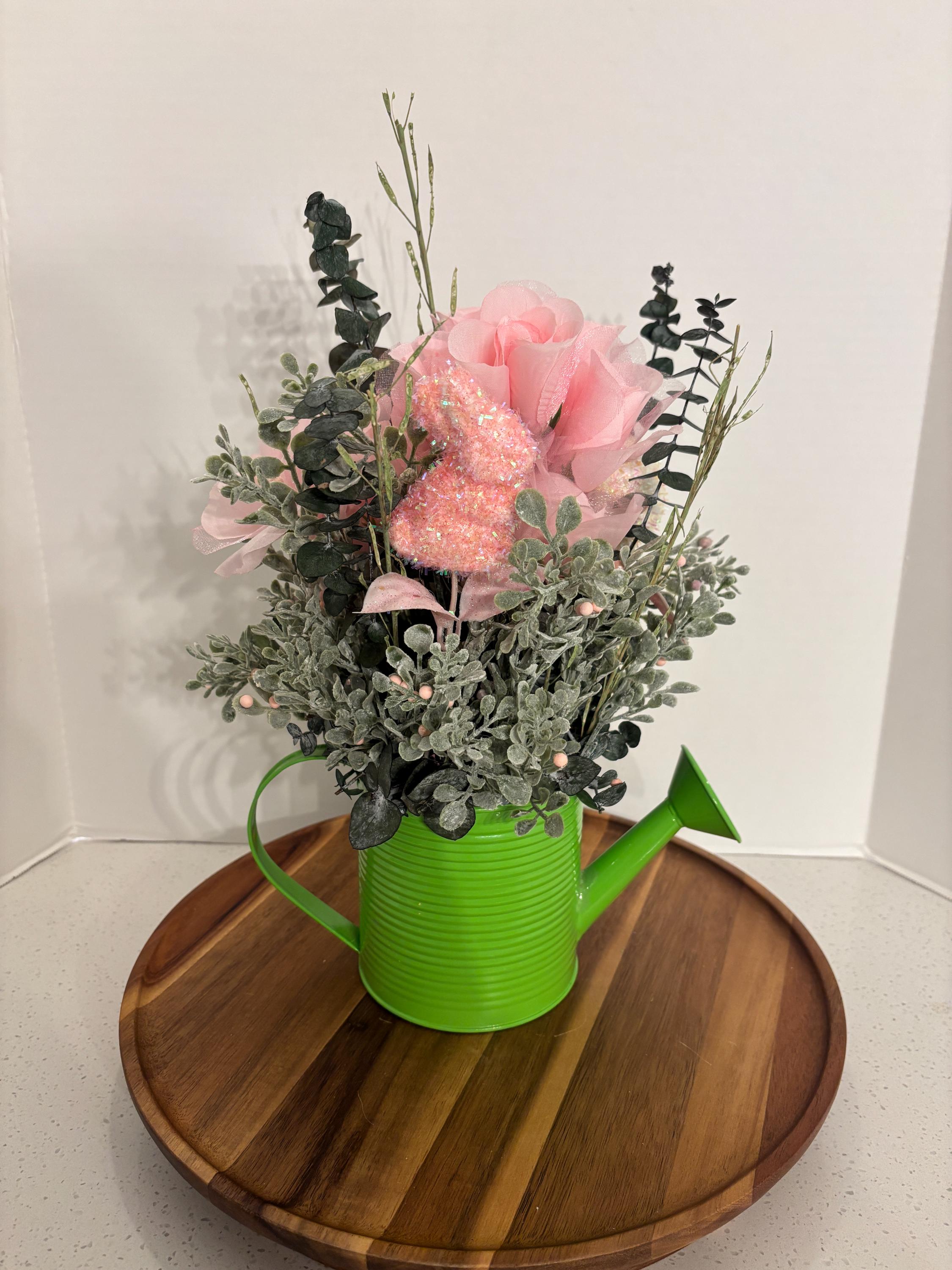 ***Floral arrangement of pink flowers surrounded with greenery and assorted Easter eggs. Set in a 6” green tin watering can planter that is also reusable.
