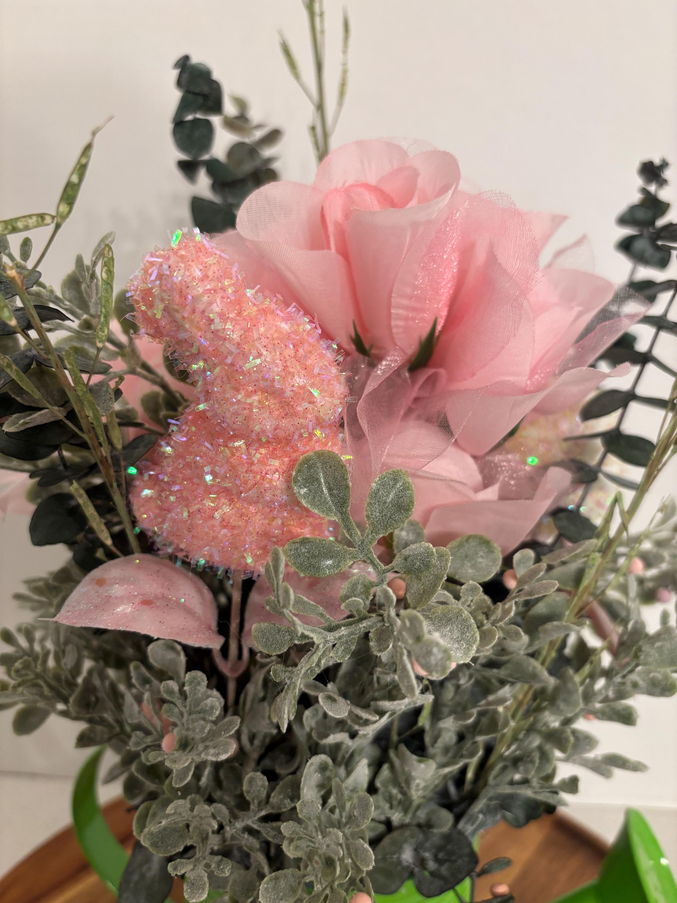 Overflowing with carefully arranged pink blooms, greenery and assorted Easter decor, the arrangement creates natural movement and fullness, making it a beautiful accent for kitchen counters, entry tables, shelves, or covered porch décor. The watering can adds rustic character and makes this piece perfect for farmhouse, country, or spring-inspired spaces.