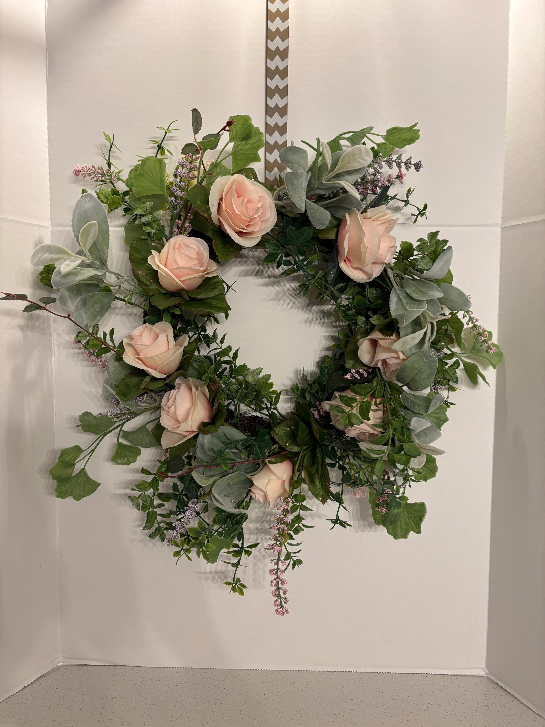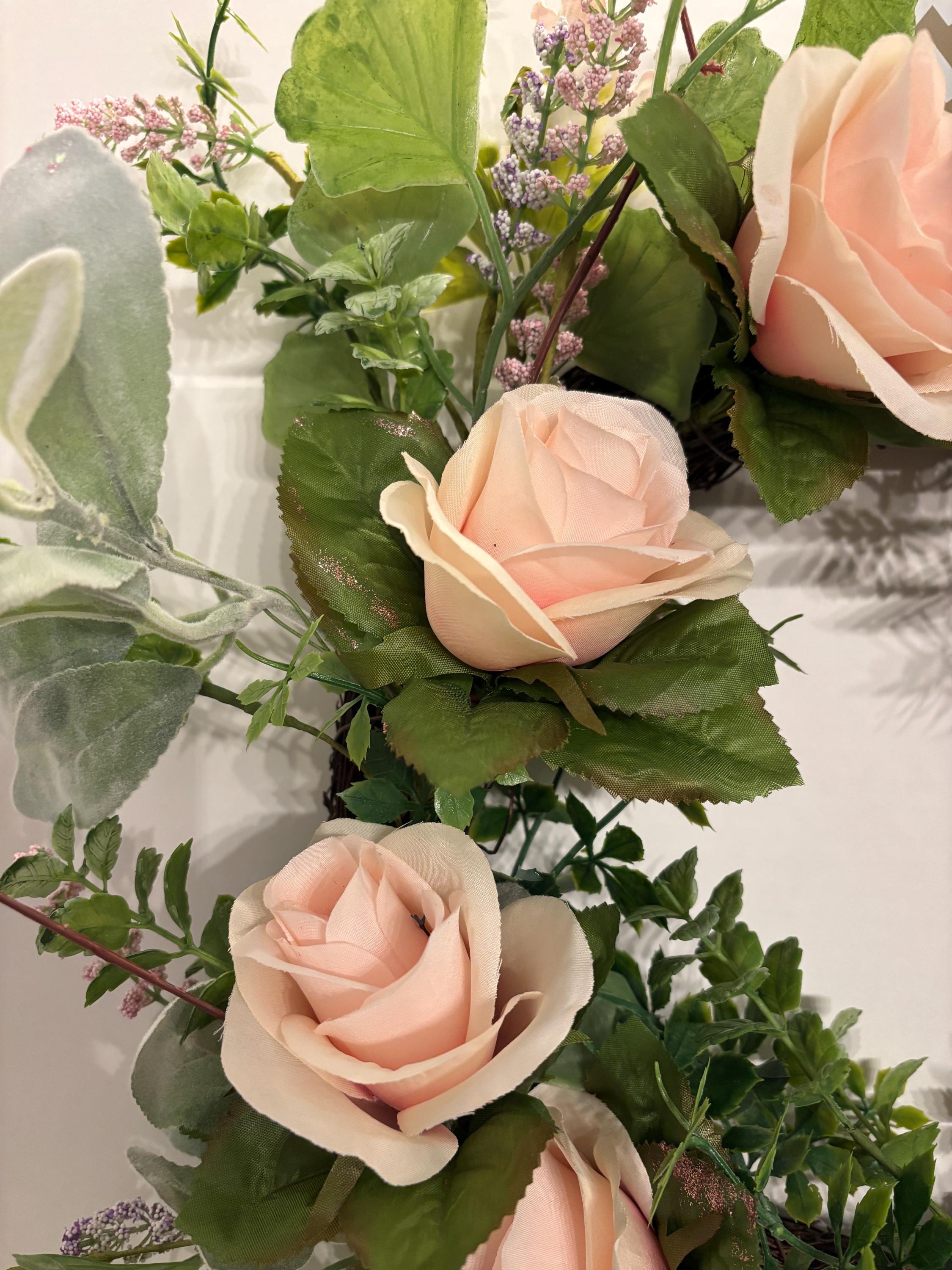 Bring soft elegance and timeless beauty to your home with this stunning blush rose floral wreath. Designed with lifelike blooms and lush greenery, this wreath features delicate blush pink roses nestled among layered leaves and subtle floral accents for a full, natural look.