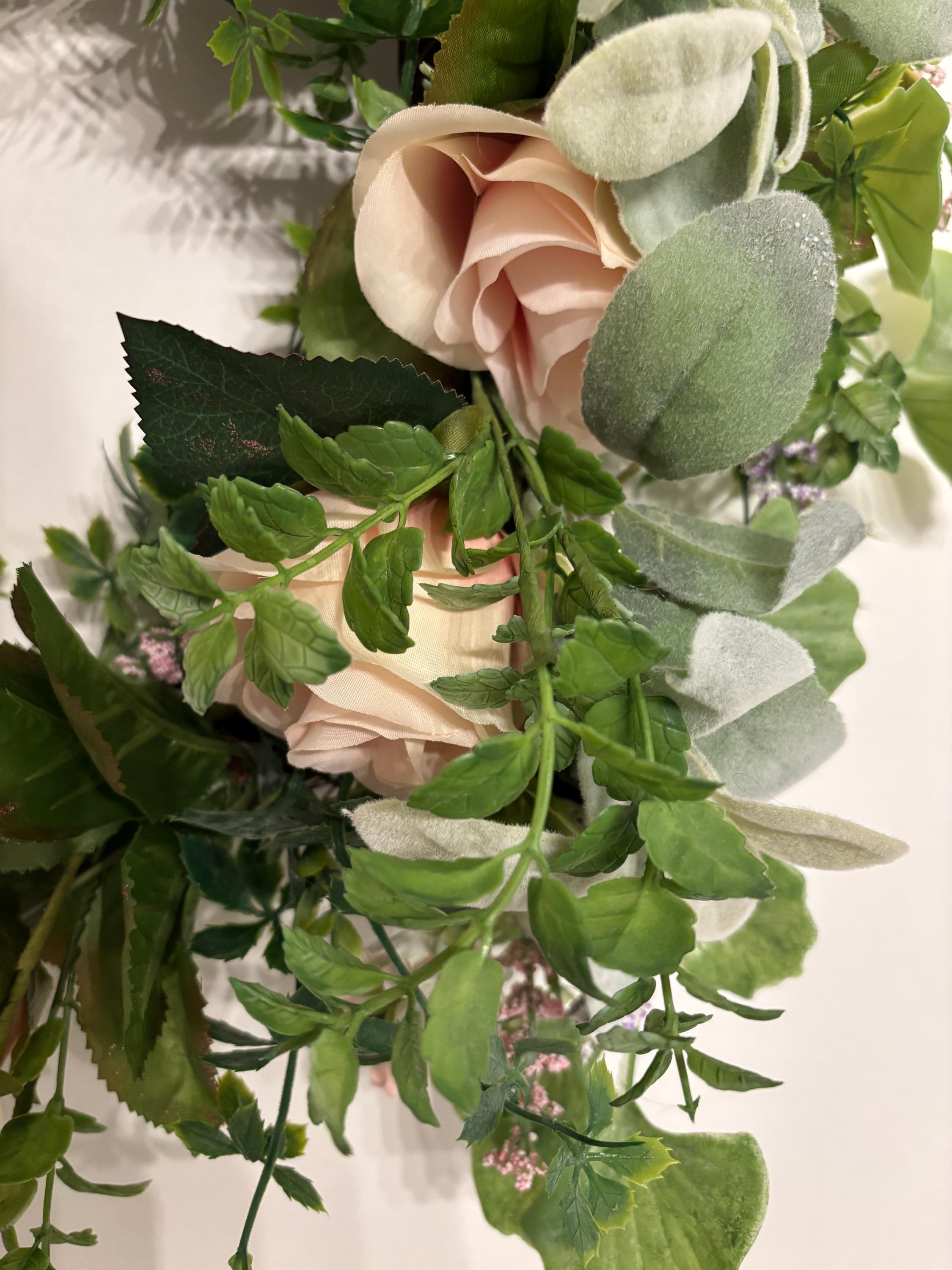 The arrangement blends soft peach-blush roses with textured greenery, including eucalyptus-style leaves and trailing stems, creating depth and movement throughout the design. Gentle hints of tiny lavender sprigs add a touch of contrast and charm, making this wreath perfect for spring and year-round display.