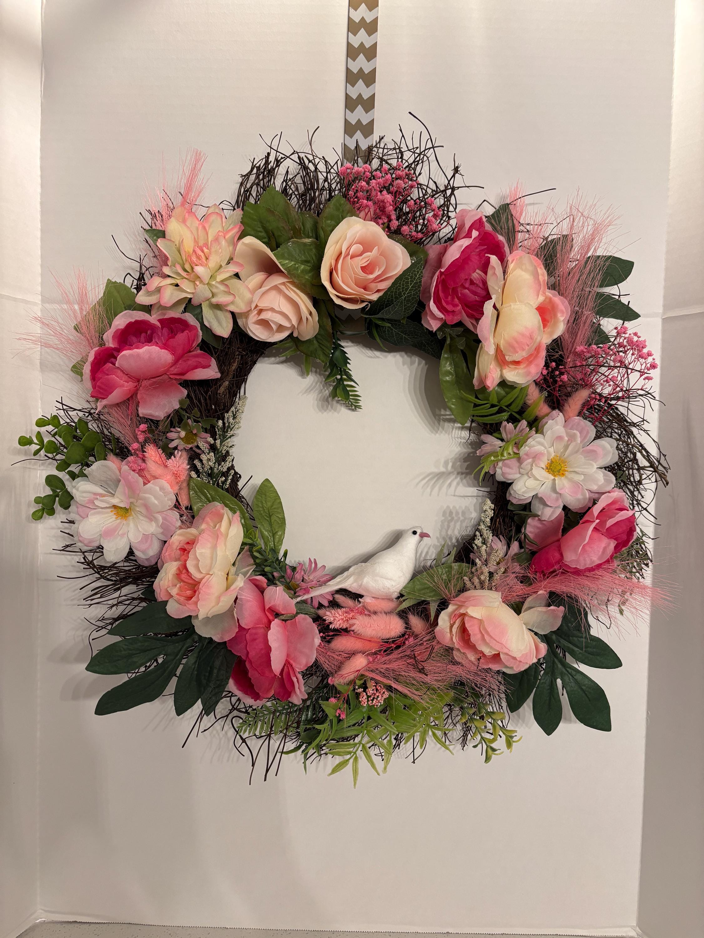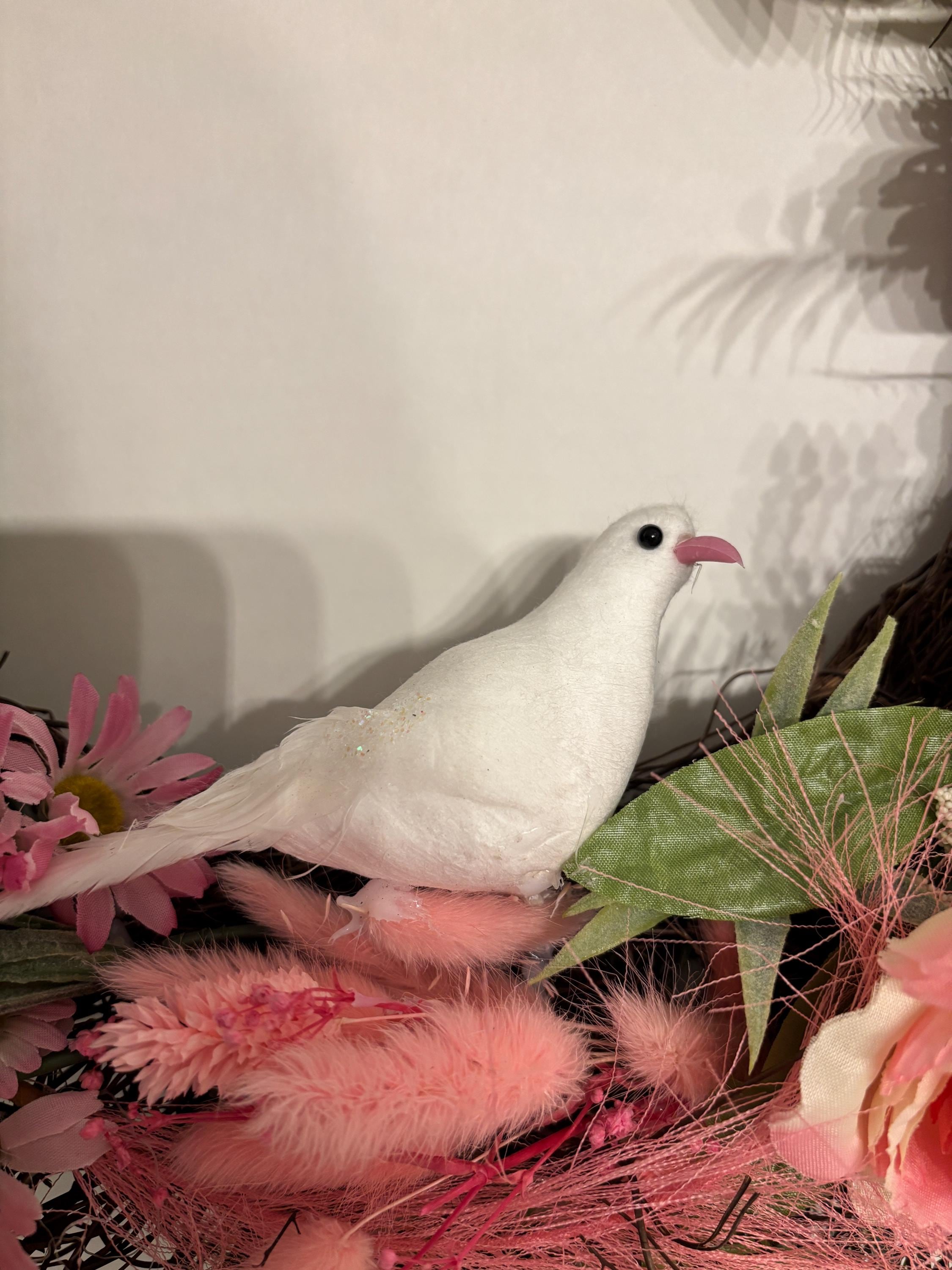 Bring soft elegance and timeless beauty to your home with this stunning shades of pink florals wreath. Designed with lifelike blooms and lush greenery, this wreath features delicate pink florals nestled among layered leaves with a white dove in the center.