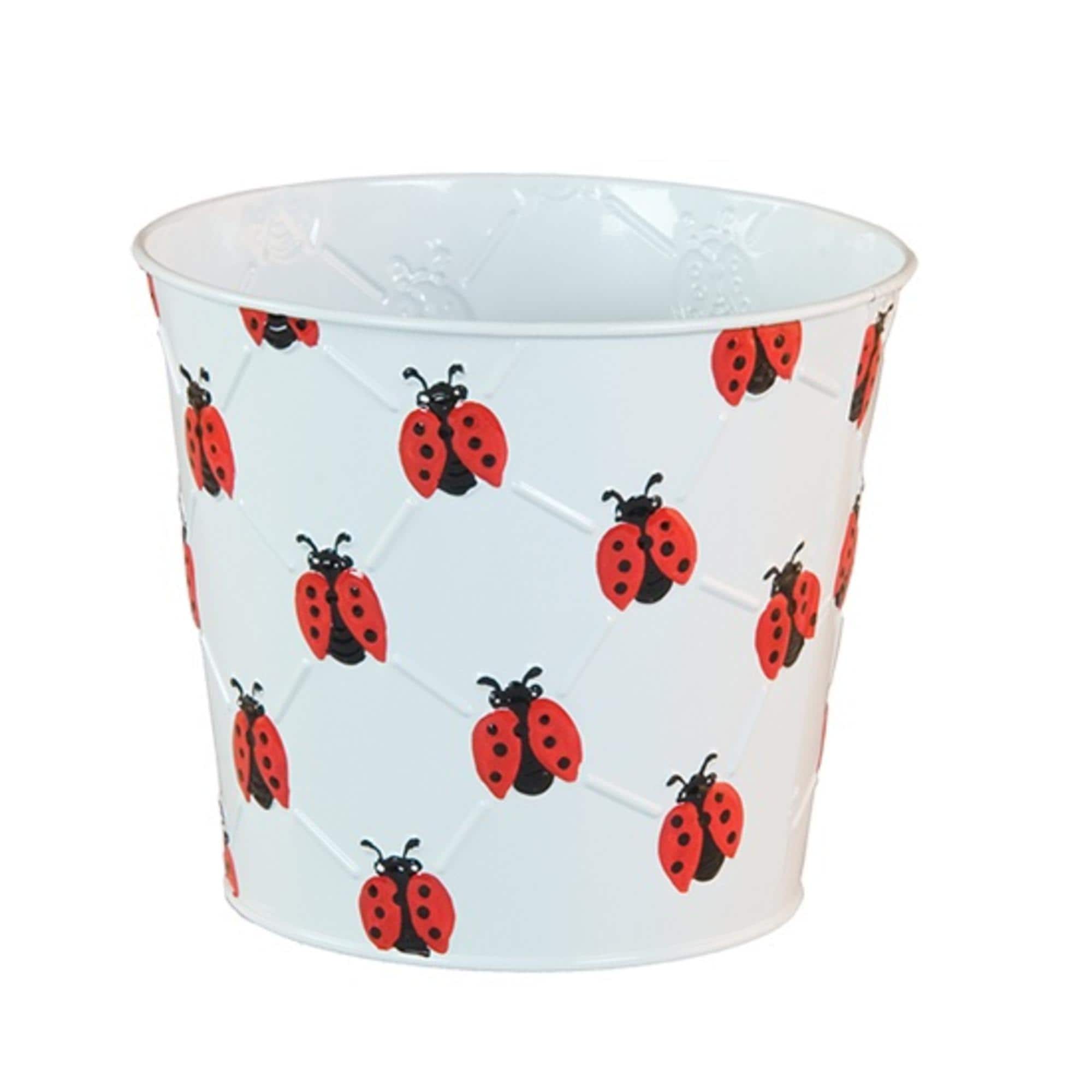 Add a playful pop of spring to your space with this set of two ladybug themed tin planters. Perfect for small succulents, cacti, or decorative faux plants, each planter features an adorable ladybug flying design in bright, white and red.