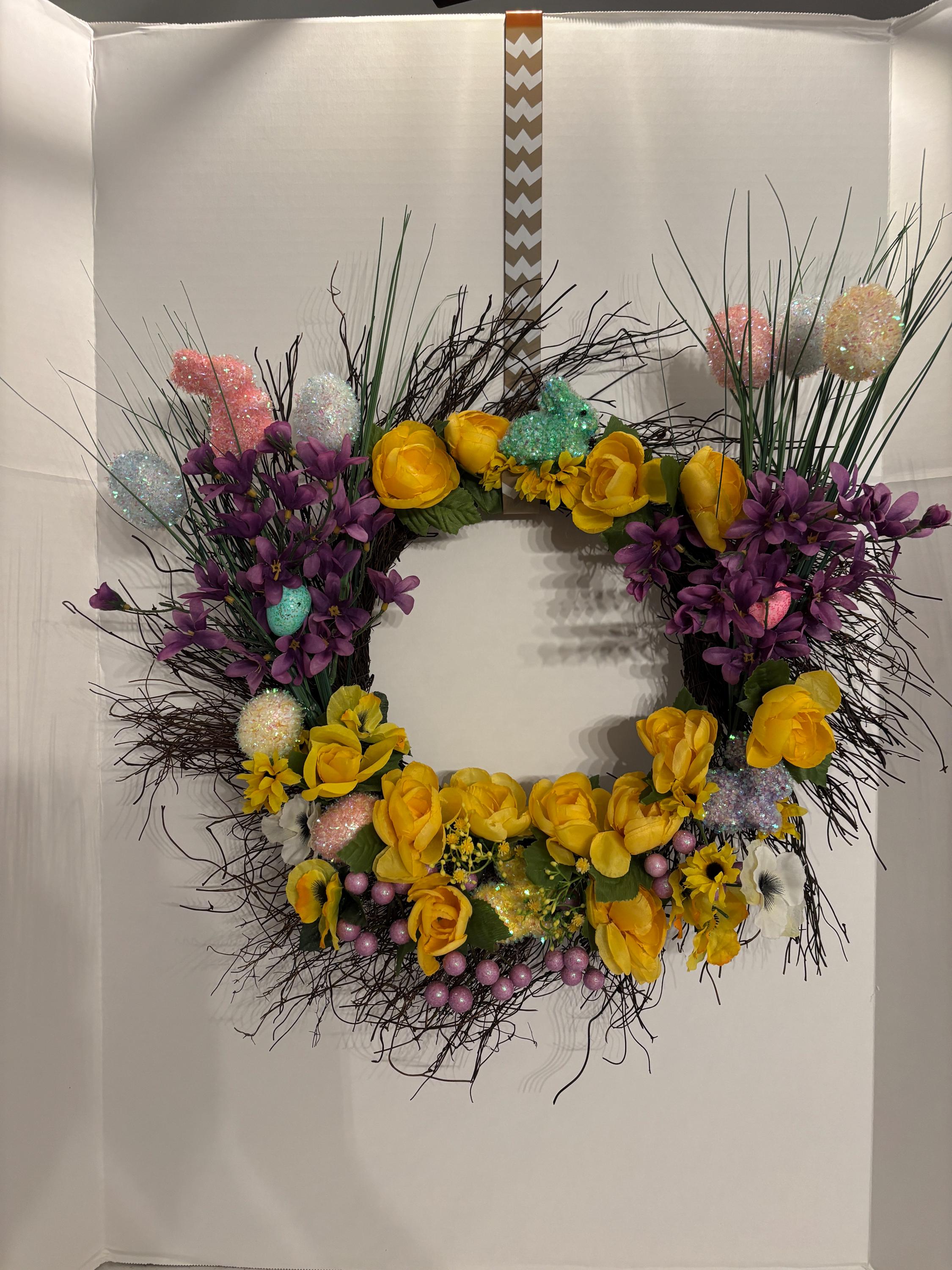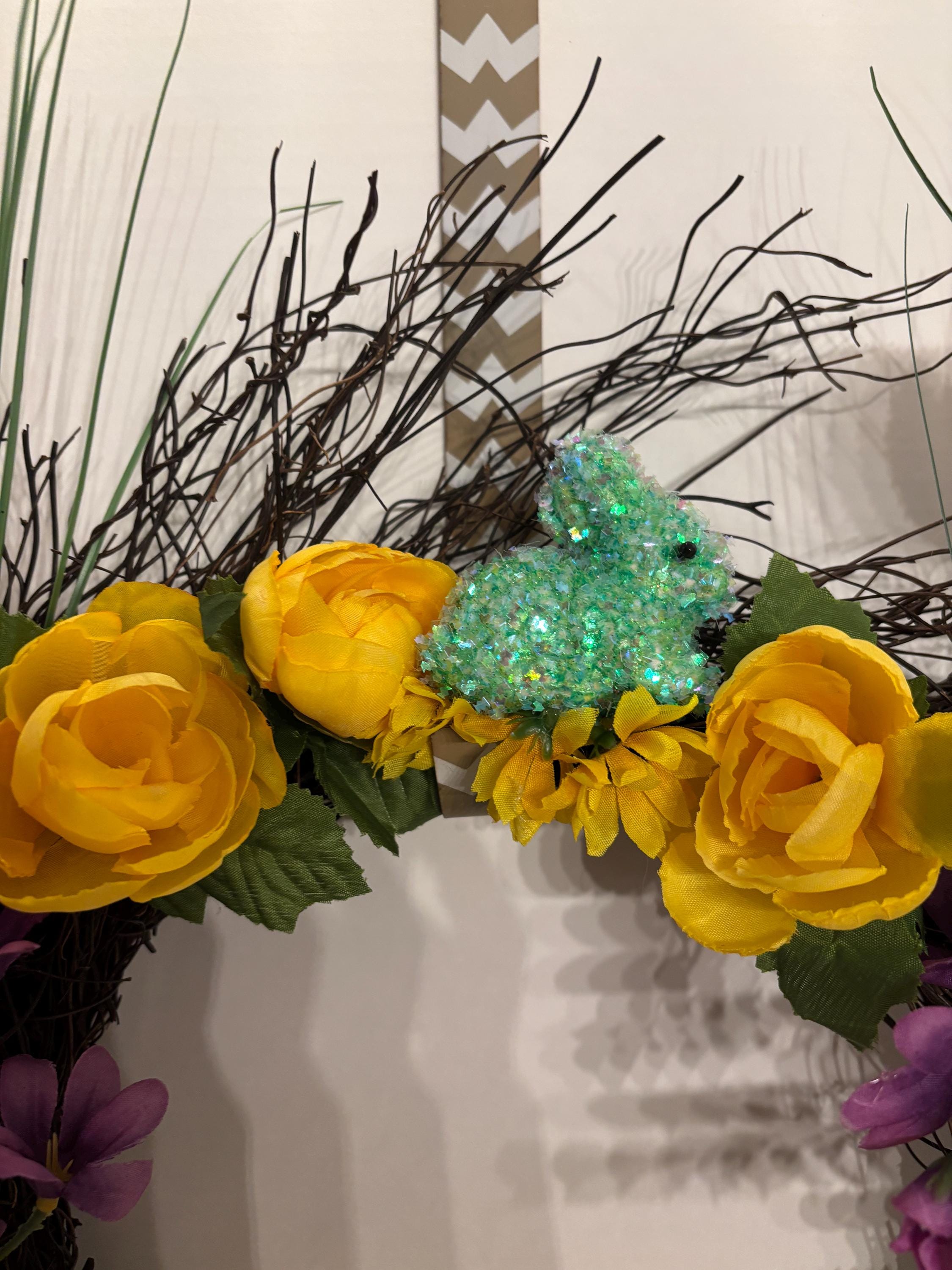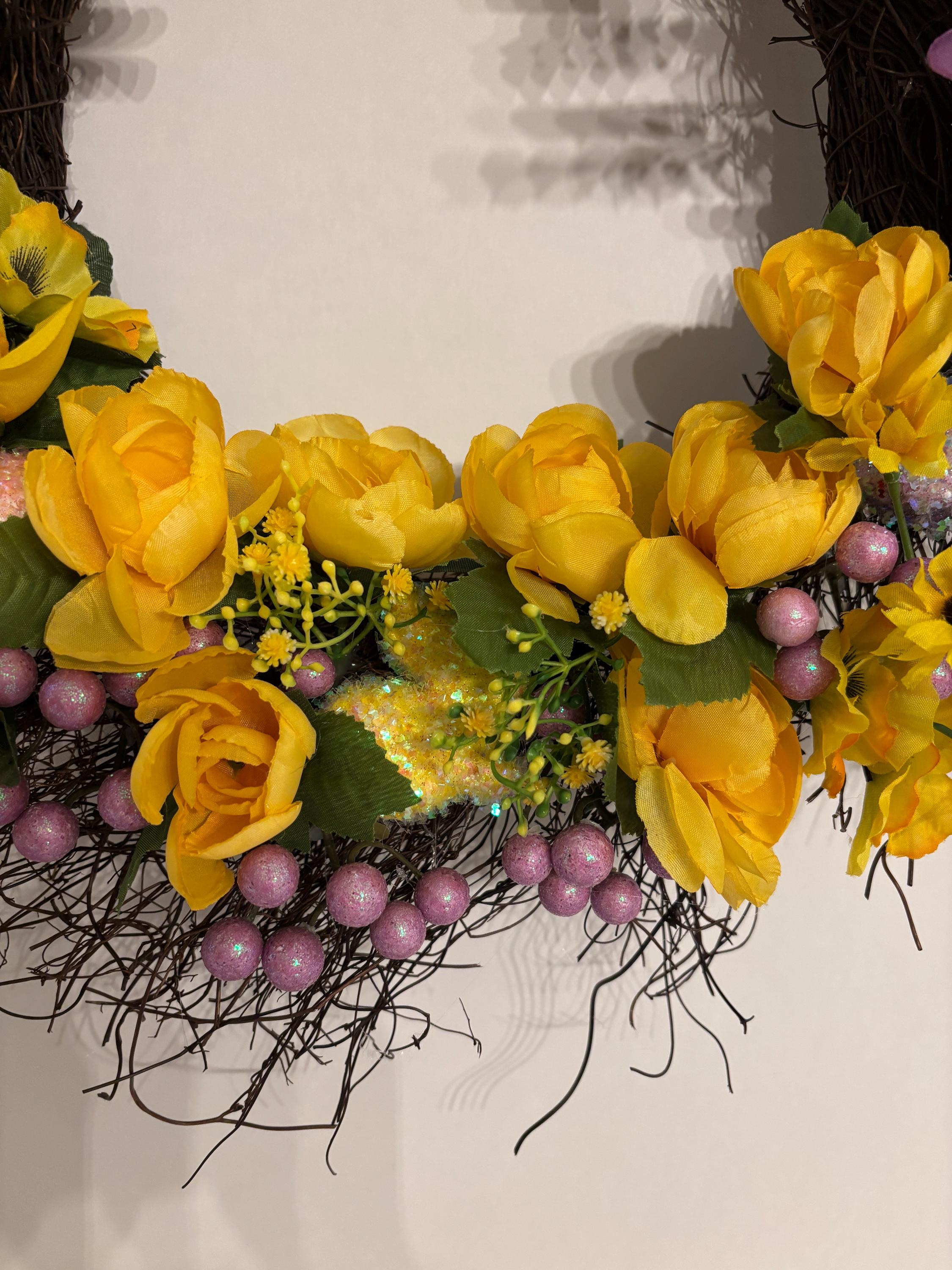 Welcome spring in full bloom with this vibrant Easter-inspired door wreath, bursting with cheerful color and whimsical detail. Designed on a natural twig base, this handcrafted wreath features a stunning mix of yellow and purple florals with lush greenery and Easter decor throughout for a full, dimensional look. While delicate pastel decorative eggs, bunnies, and subtle spring accents are tucked throughout the design to add the perfect Easter touch.