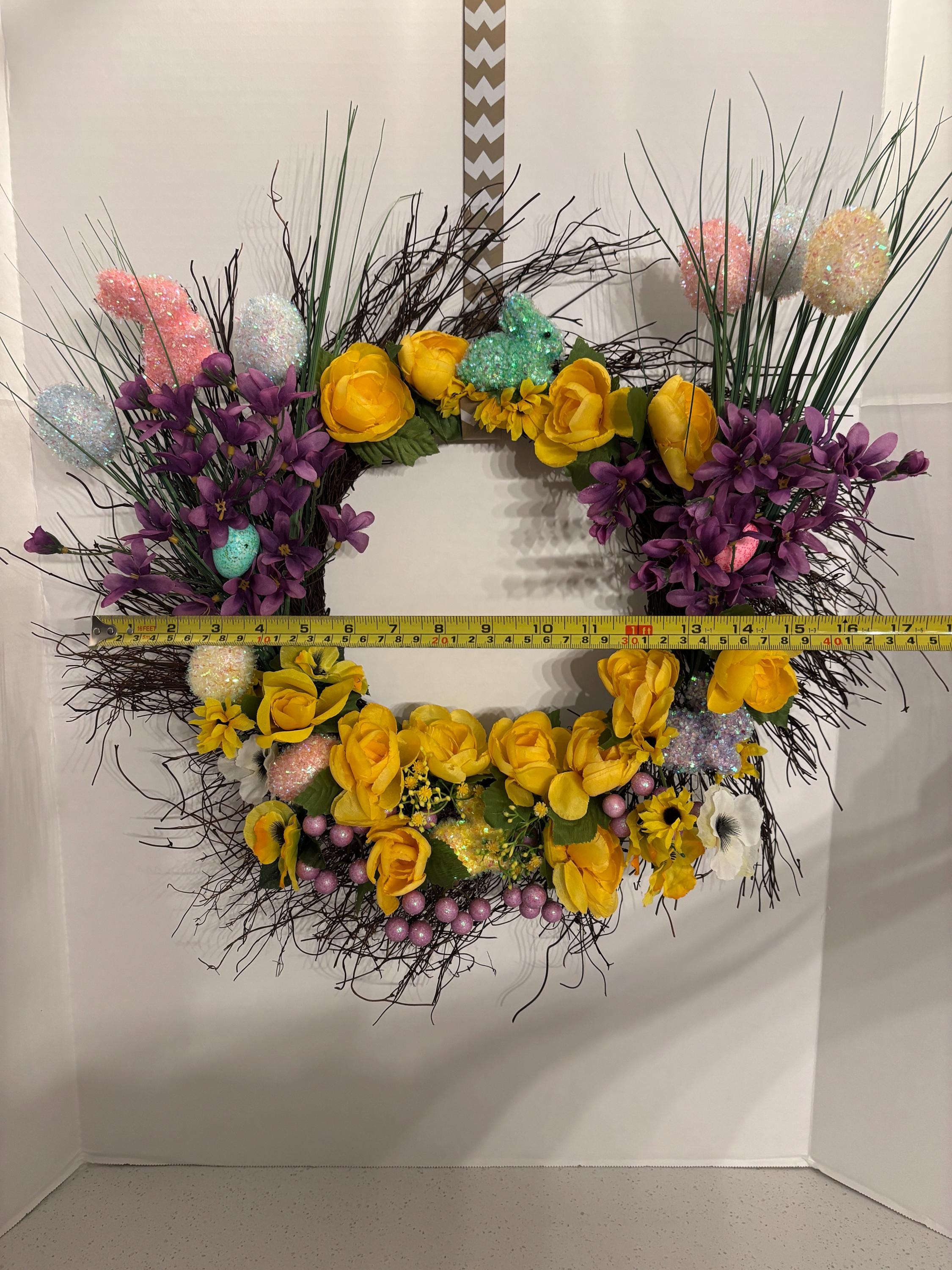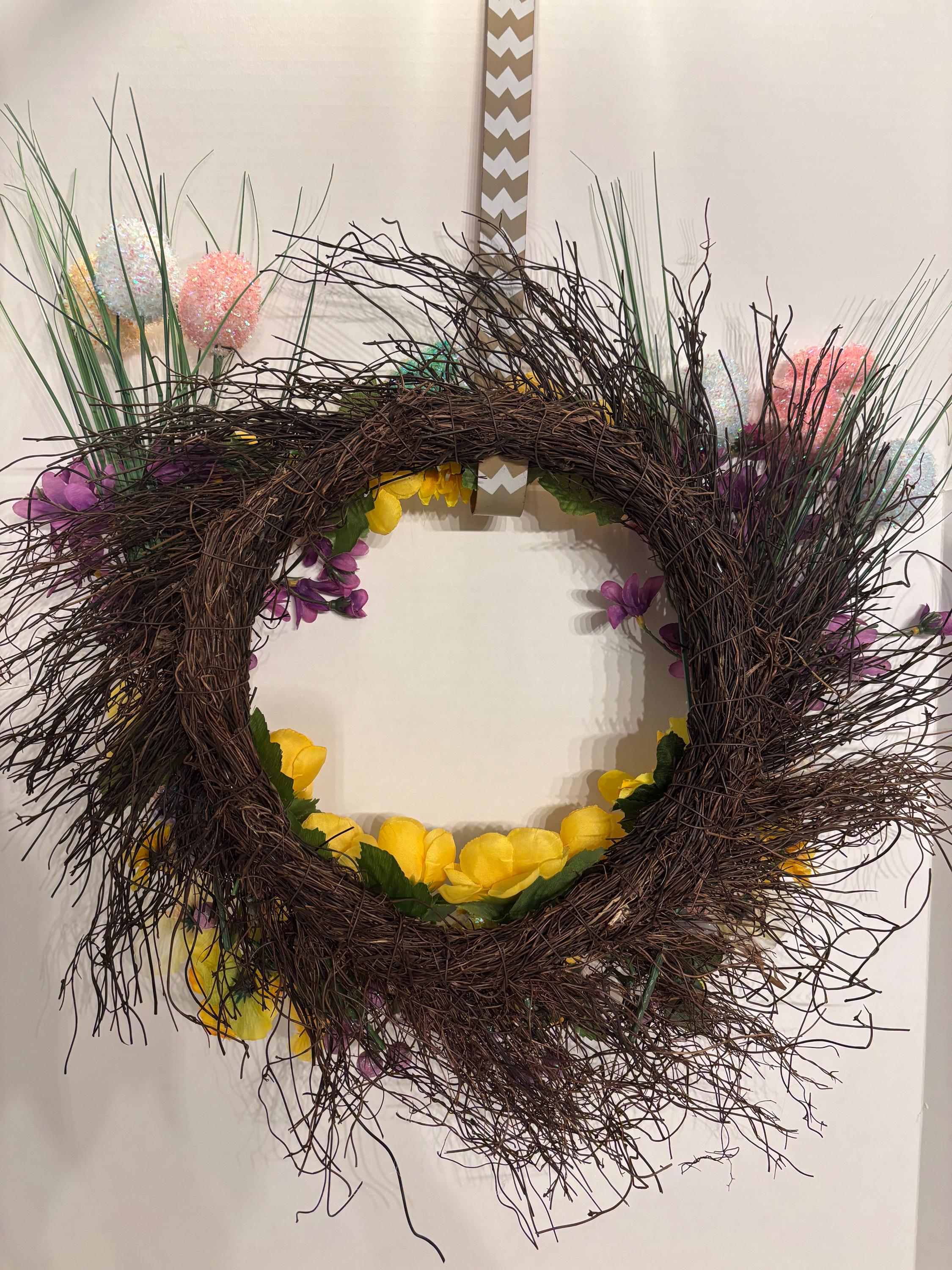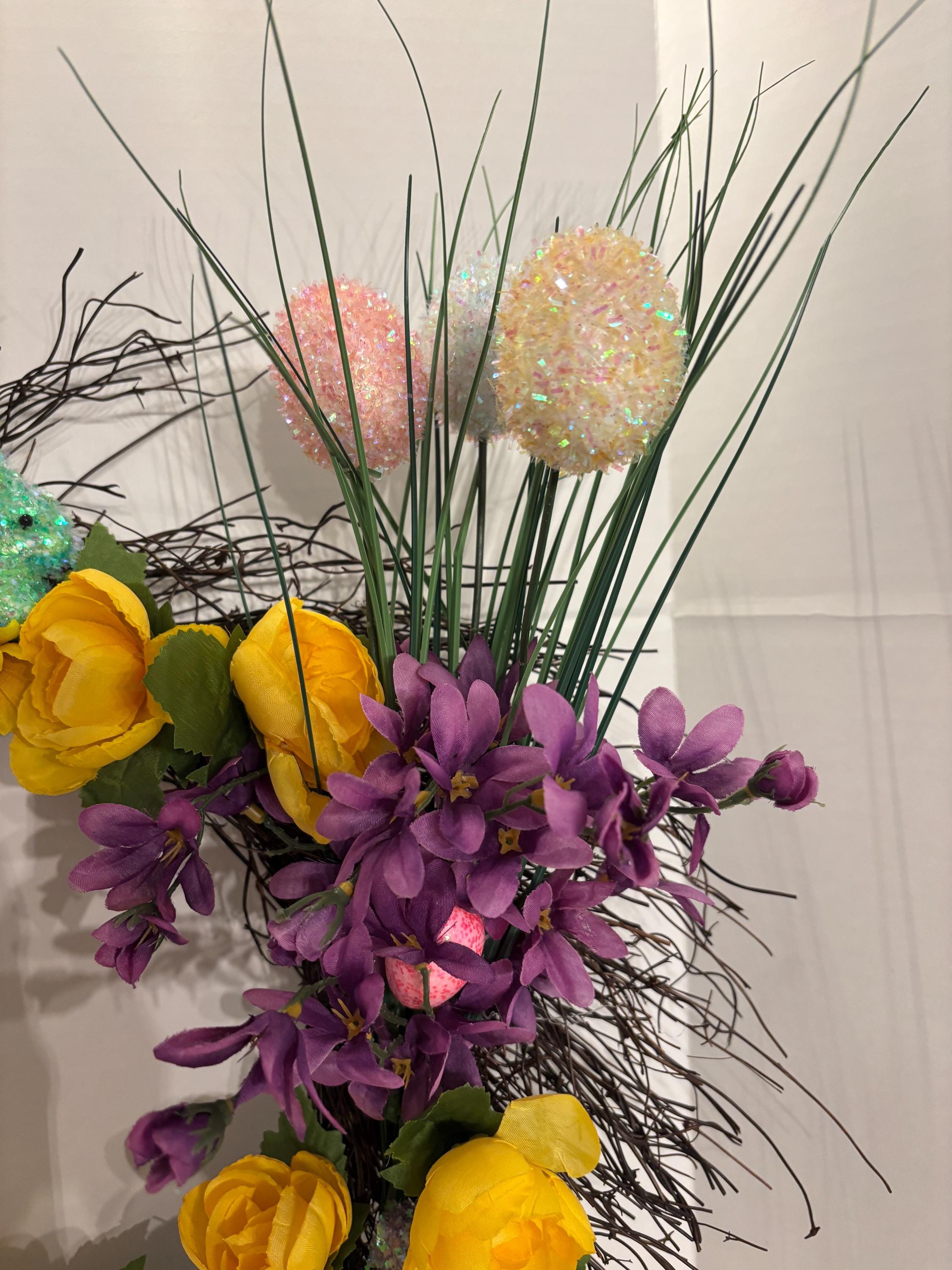 Welcome spring in full bloom with this vibrant Easter-inspired door wreath, bursting with cheerful color and whimsical detail. Designed on a natural twig base, this handcrafted wreath features a stunning mix of yellow and purple florals with lush greenery and Easter decor throughout for a full, dimensional look. While delicate pastel decorative eggs, bunnies, and subtle spring accents are tucked throughout the design to add the perfect Easter touch.