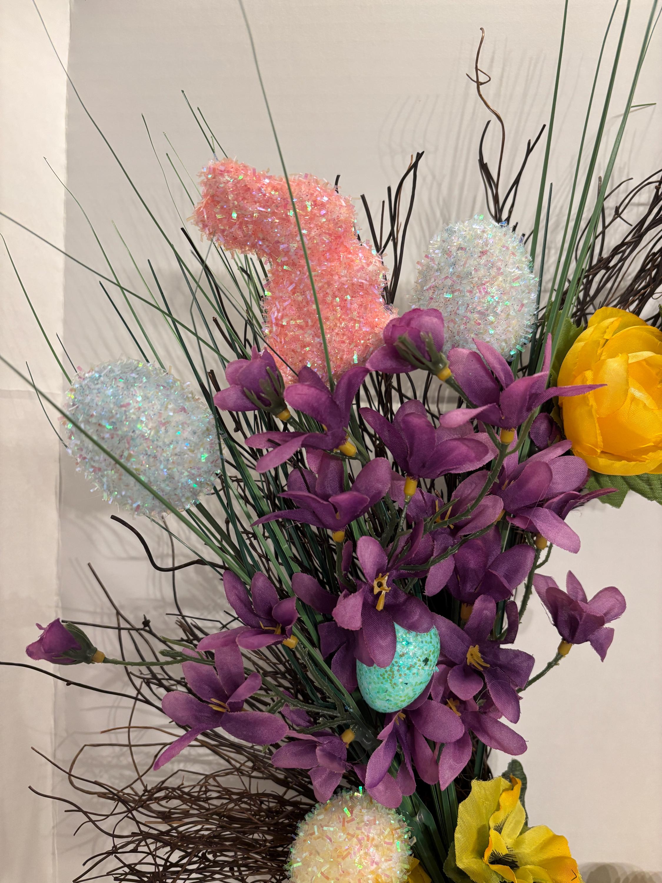 ***Purple and Yellow Flowers with greenery, Easter Eggs and Bunnies