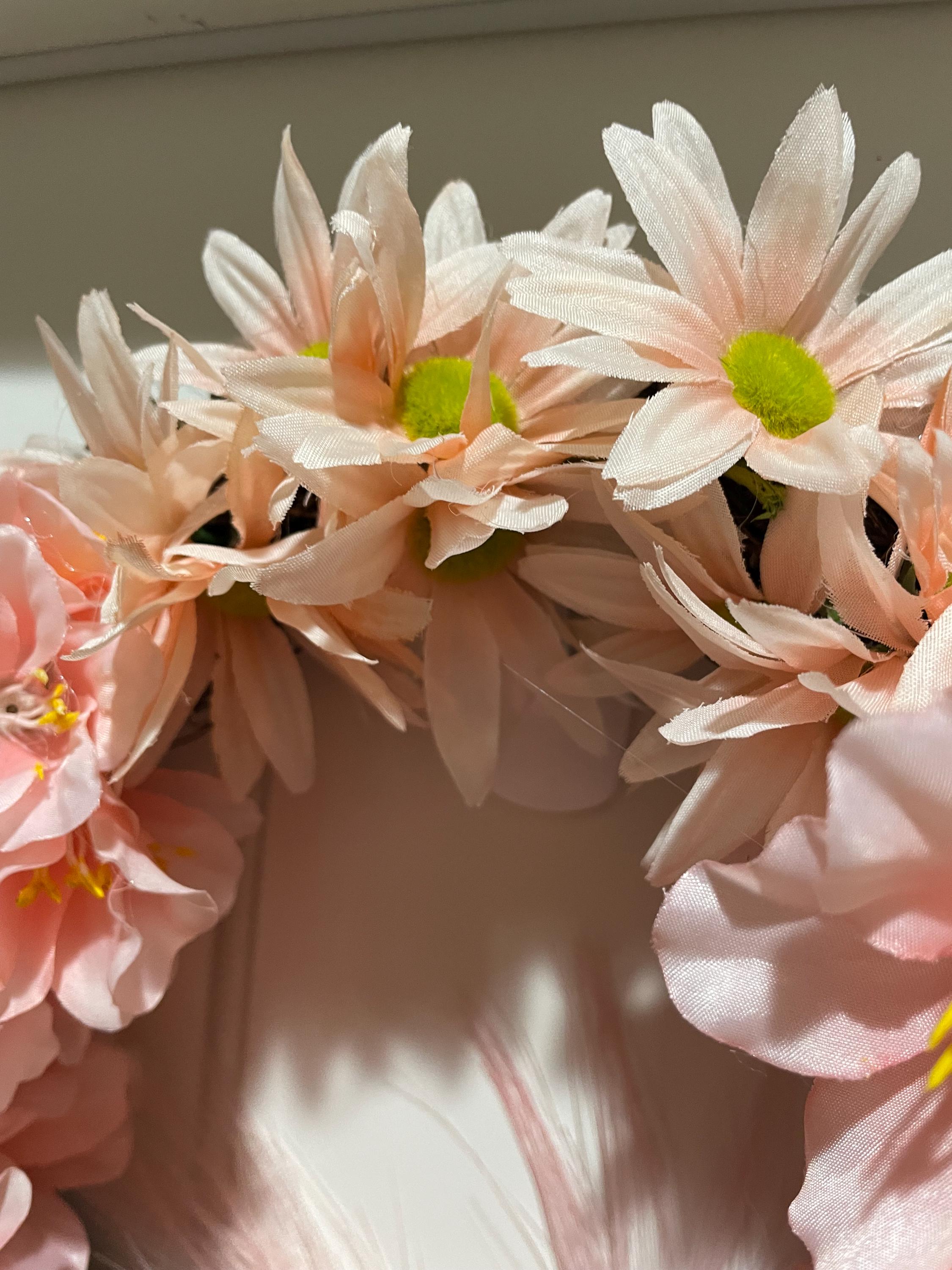 ***Pink mauve florals and daises with pink wisps (feathers) and a white dove bird in the center
