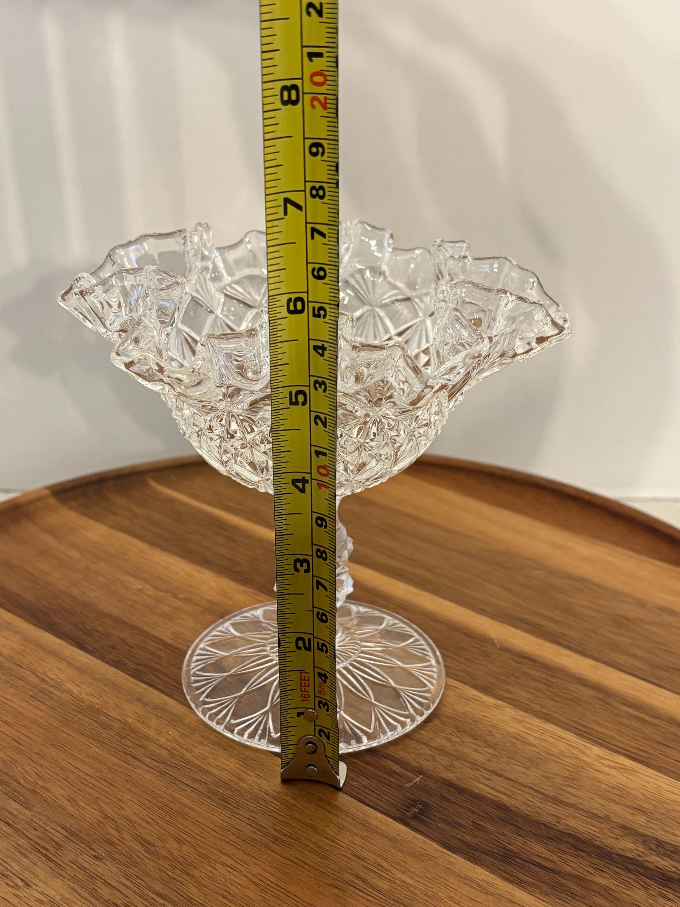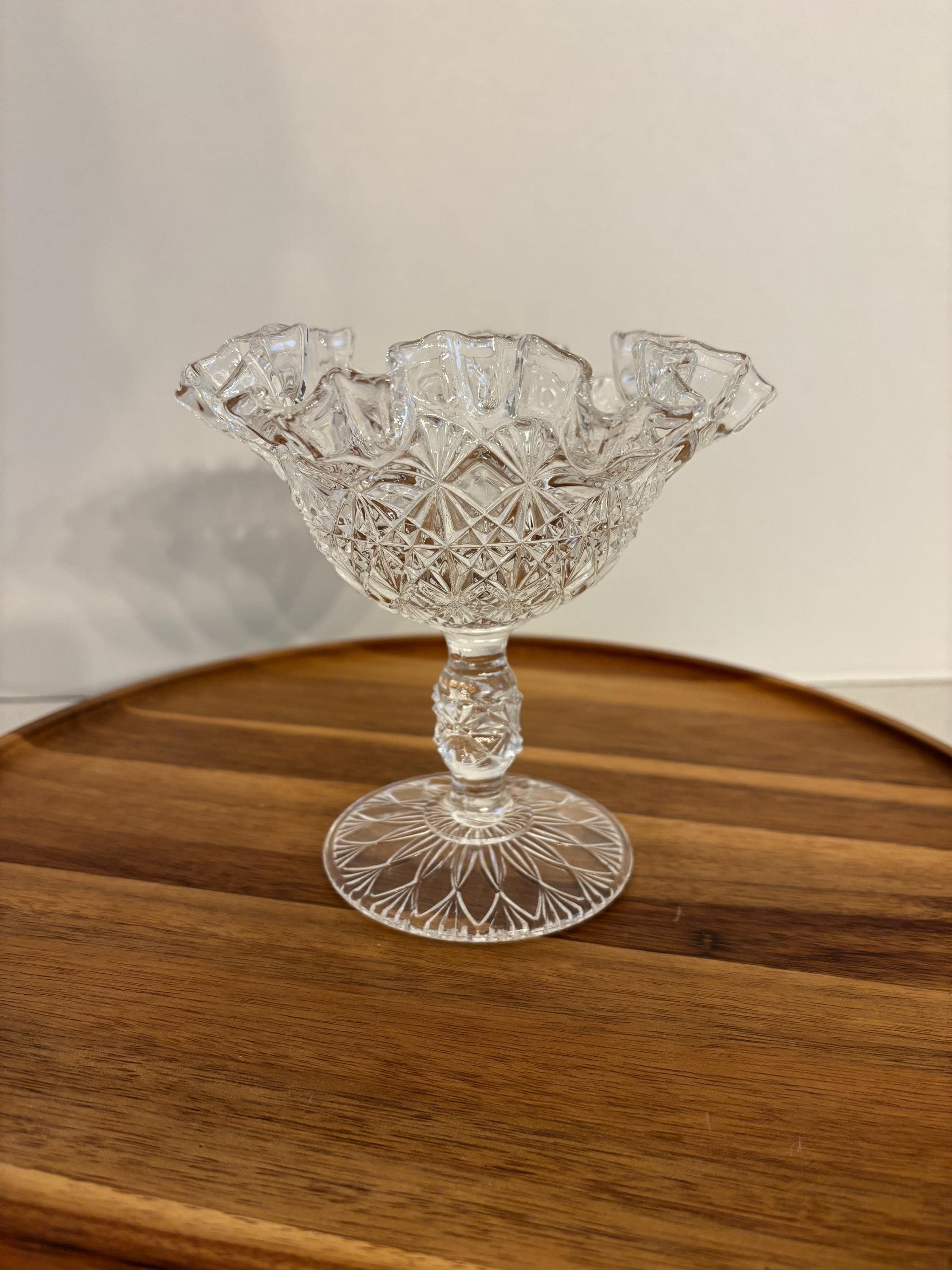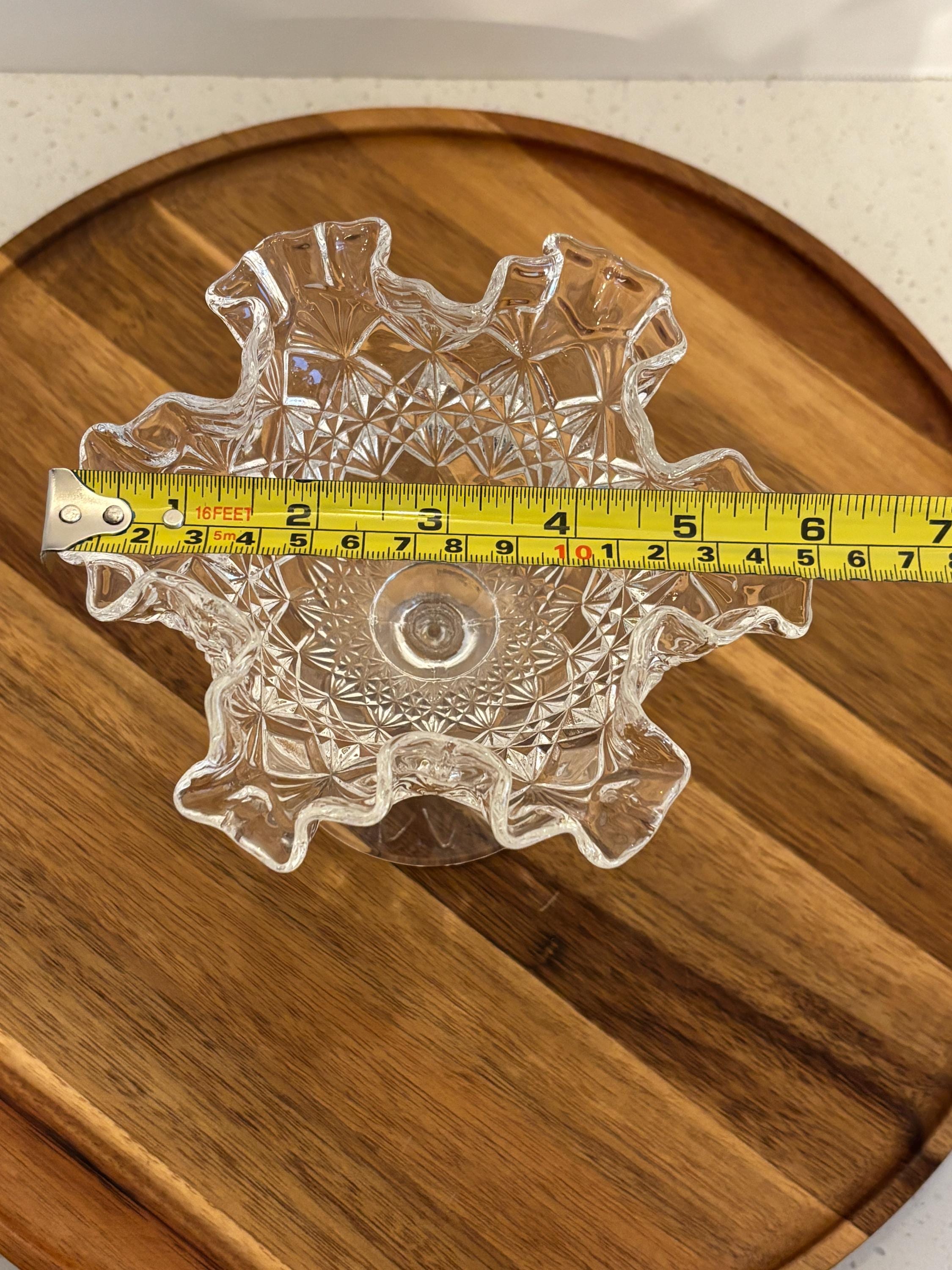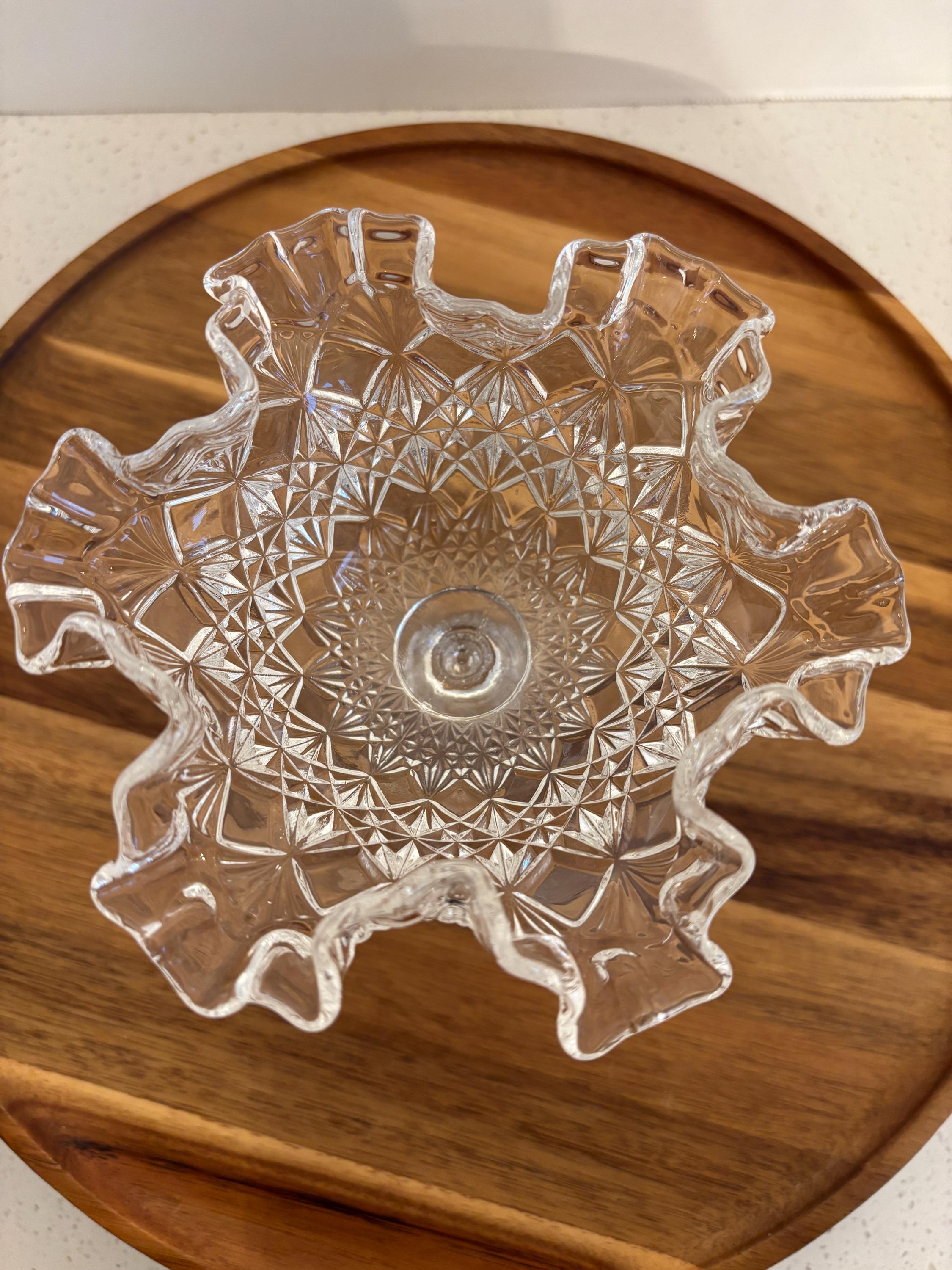 The dish is finished with a graceful ruffled edge, adding a soft decorative contrast to the bold cut pattern. A sturdy footed base elevates the piece, giving it a refined presence that works perfectly as a candy dish, nut bowl, or decorative accent on a table, buffet, or display cabinet.