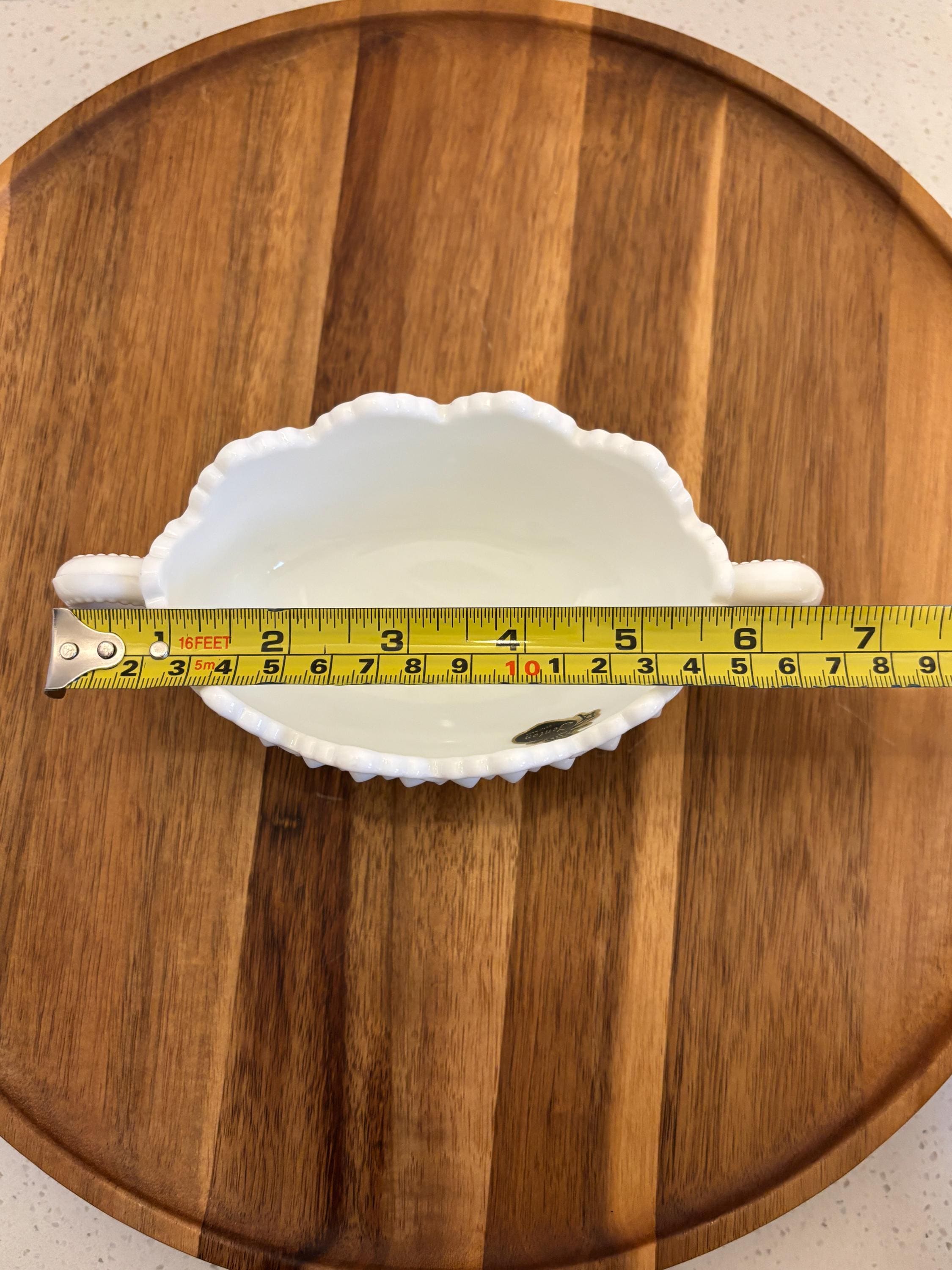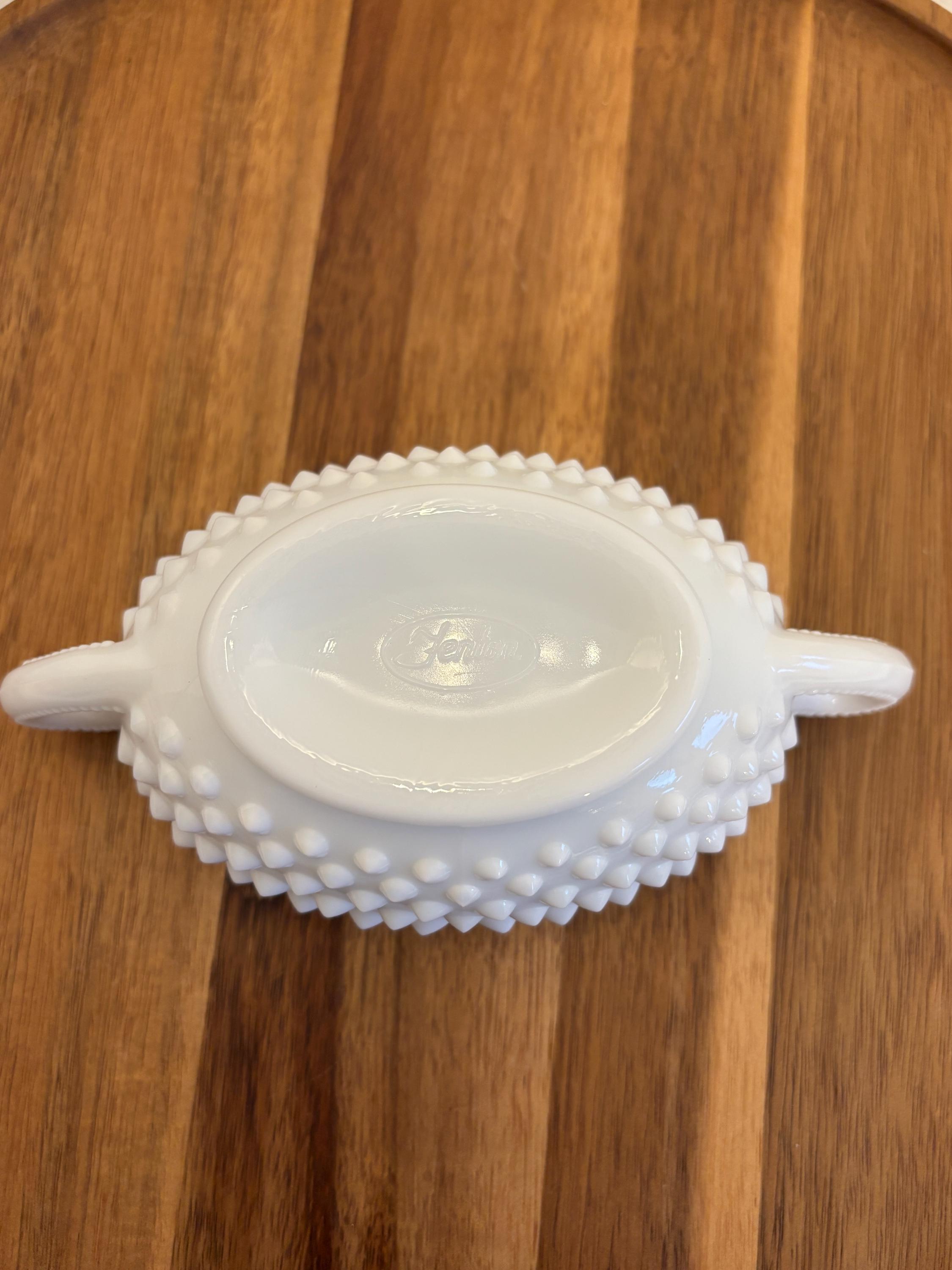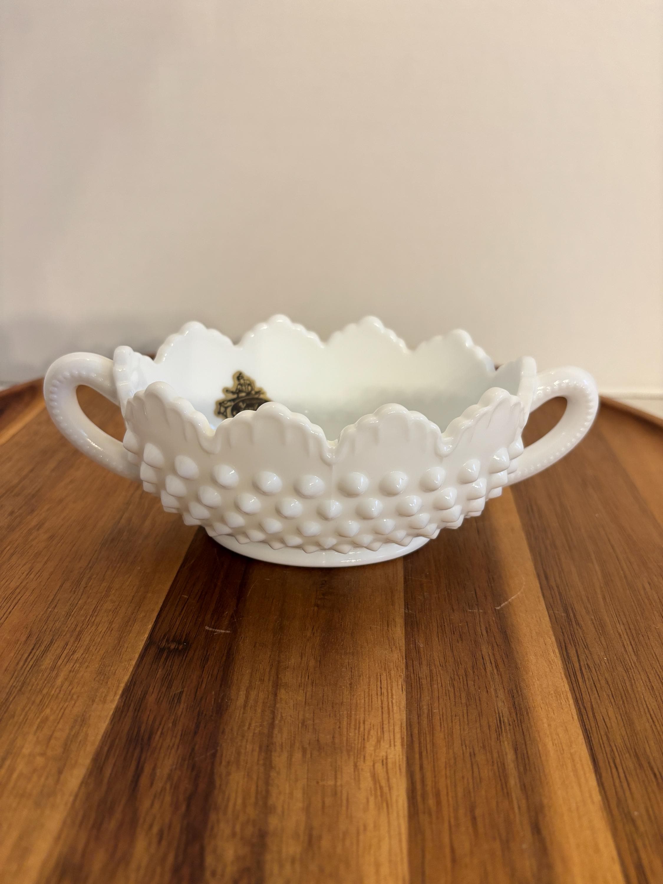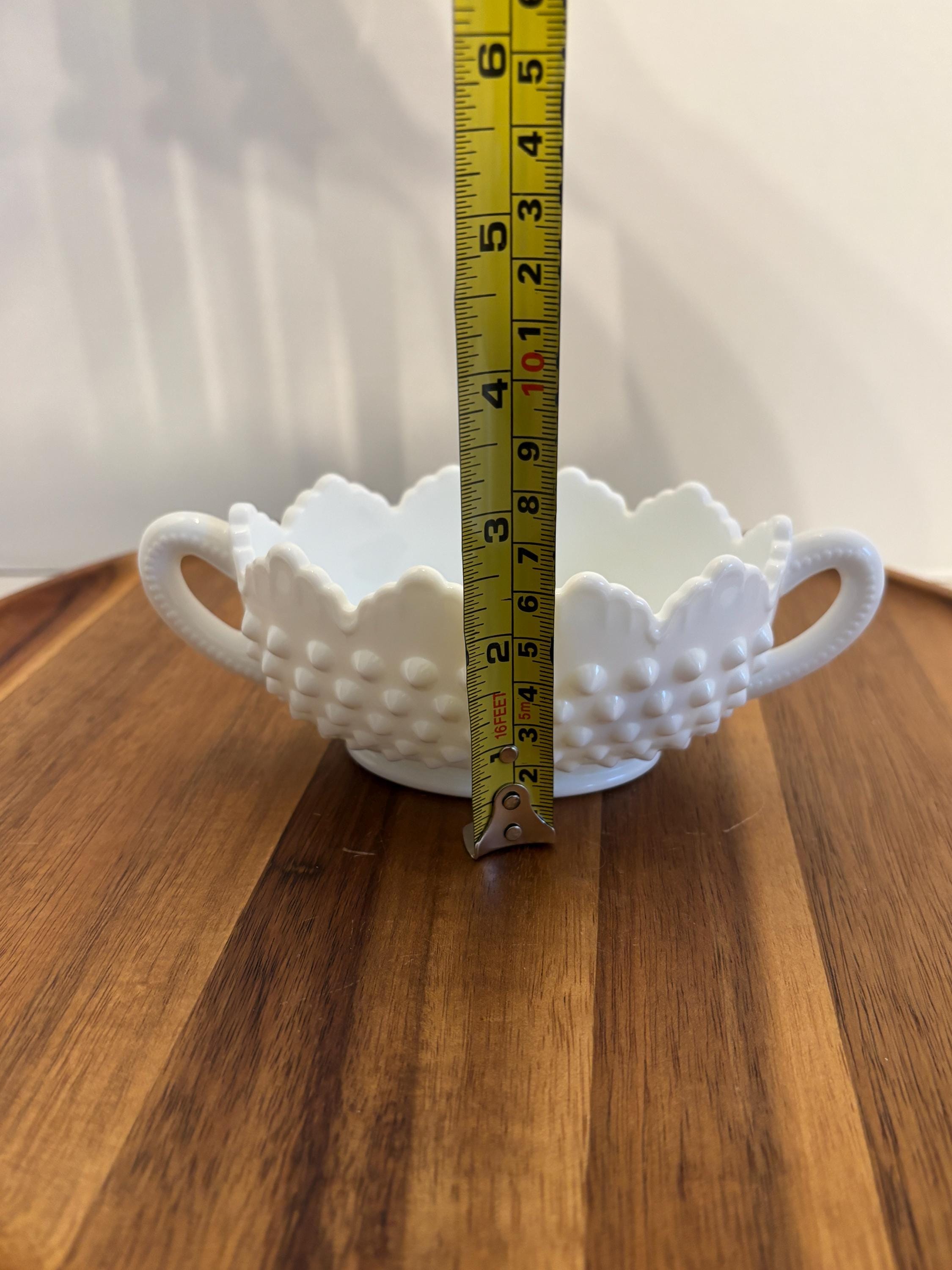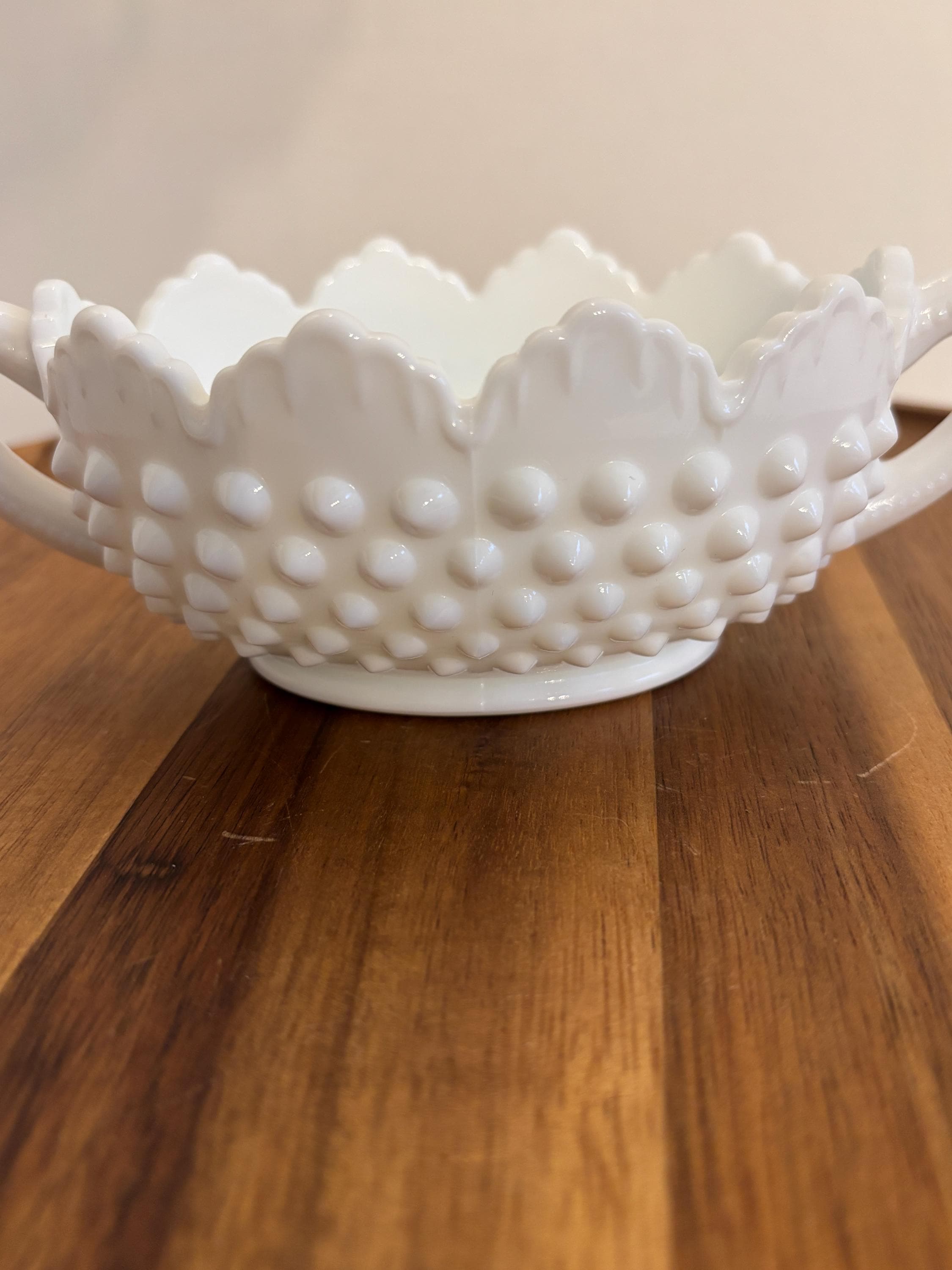 Timeless, elegant, and oh-so-charming — this Fenton Hobnail Milk Glass Basket is a classic piece of American glassmaking history. Featuring the iconic hobnail texture, a beautifully crimped rim, and a sturdy applied handle, this basket sits gracefully on a footed base, making it a standout piece for display or functional use.